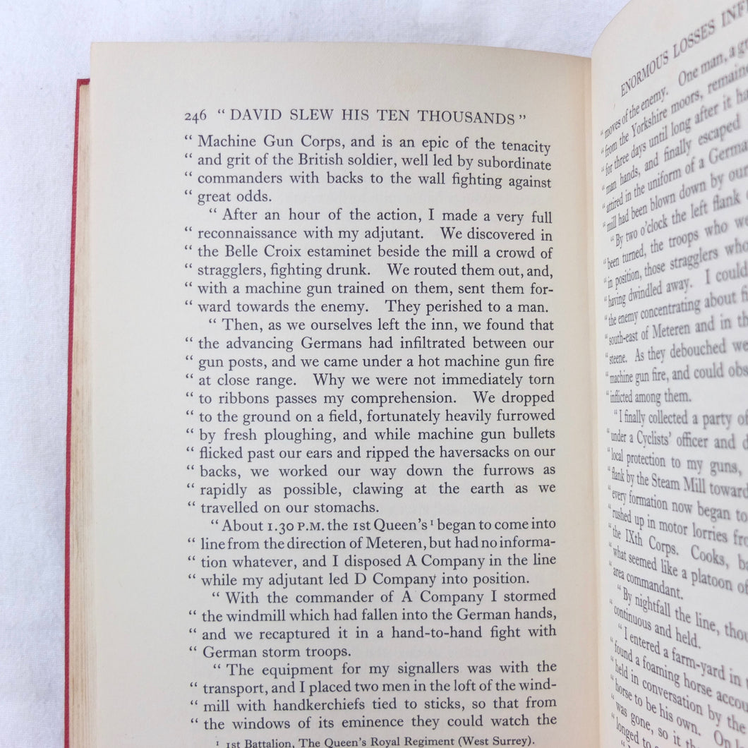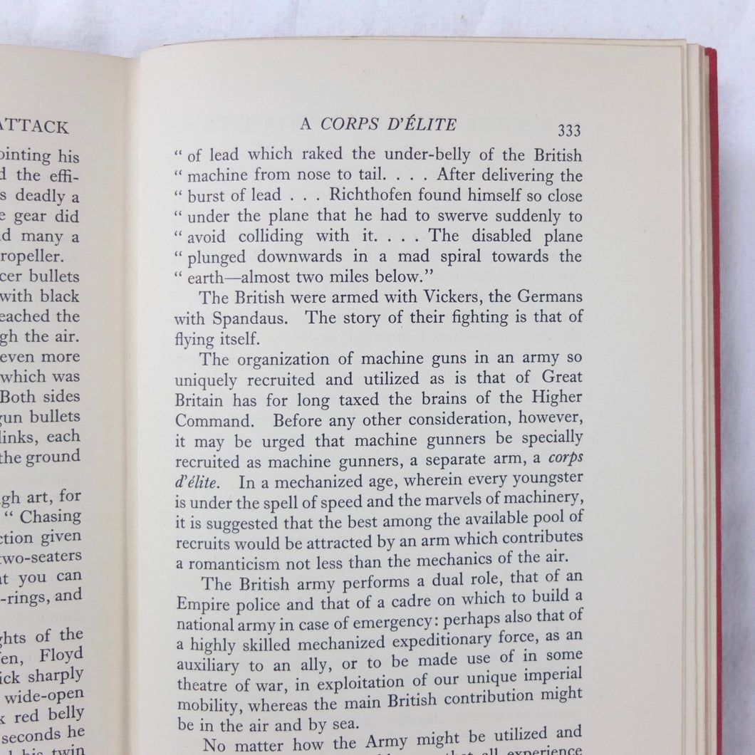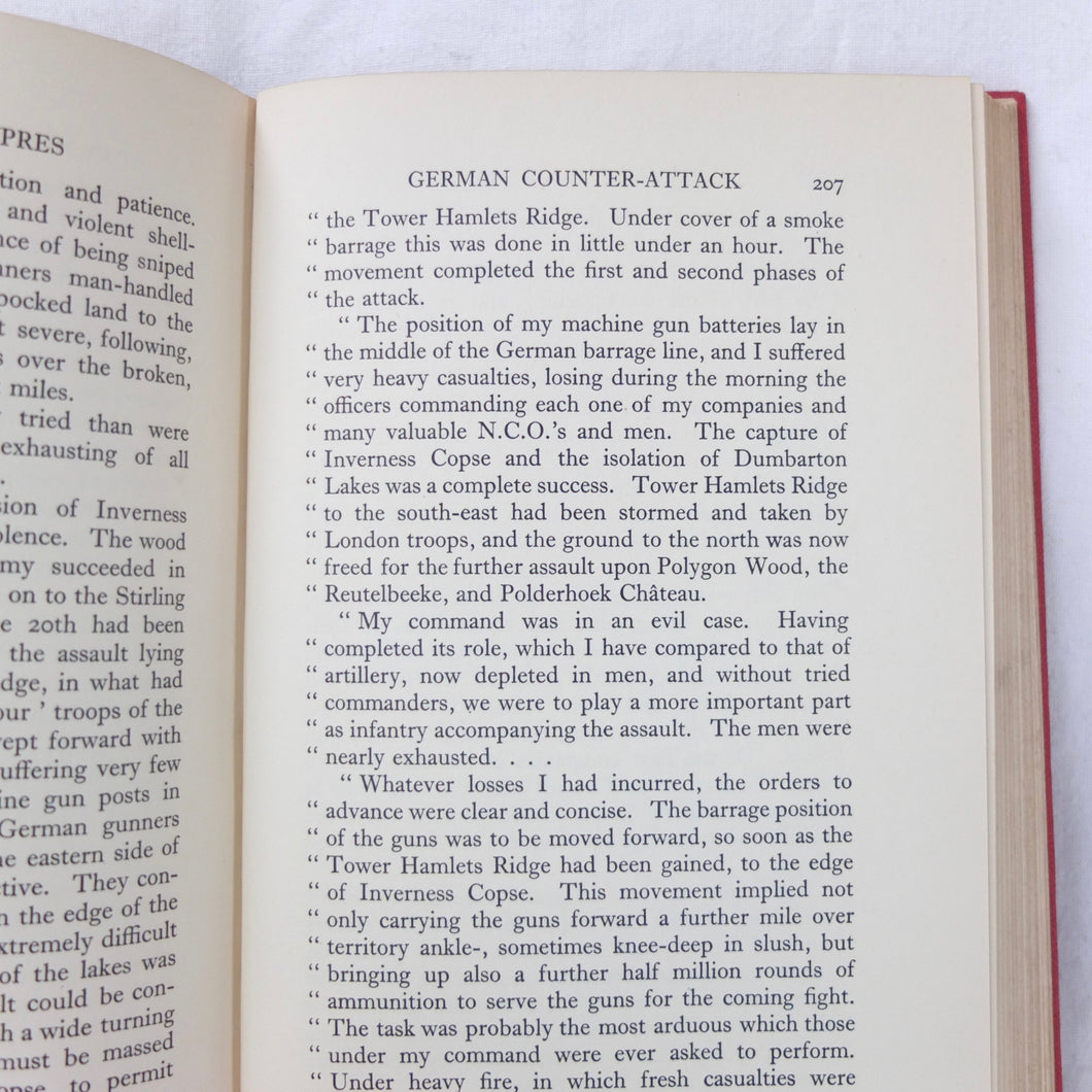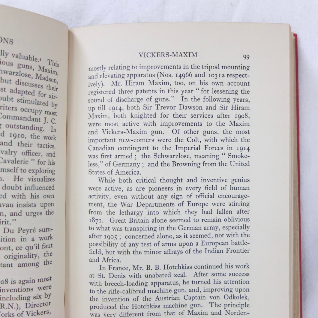 A 1st edition of Lt-Colonel Hutchinson’s classic survey of the role of the machine gun in WW1, and the history of the Machine Gun Corps. Although mainly concerned with the role of the weapon during the Great War, Lt-Col. Hutchinson examines how the machine gun evolved, with sections on the Gatling Gun, the prototype machine gun much favoured in 19th century colonial wars, and on Hiram Maxim, the cheerfully amoral inventor who was the creator of the modern machine gun. In discussing the role of the machine gun on the western front, the author describes the early advantage enjoyed by the Germans, who initially had far more of the weapons per head than the British. He does not attempt to hide the horrendous toll taken by the German machine gunners on what may have been the weapon’s bloodiest and most successful day: the decimation of the British advance on July 1st, 1916, the first day of the battle of the Somme. But Hutchinson goes on to show the British army learned from their errors, caught up with the Germans, and devised new machine gun tactics. The book includes sections on the use of the gun in other theatres of war, including Italy, the Balkans and the Middle East. A well-written, sober and informative account, packed with detailed and fascinating information.