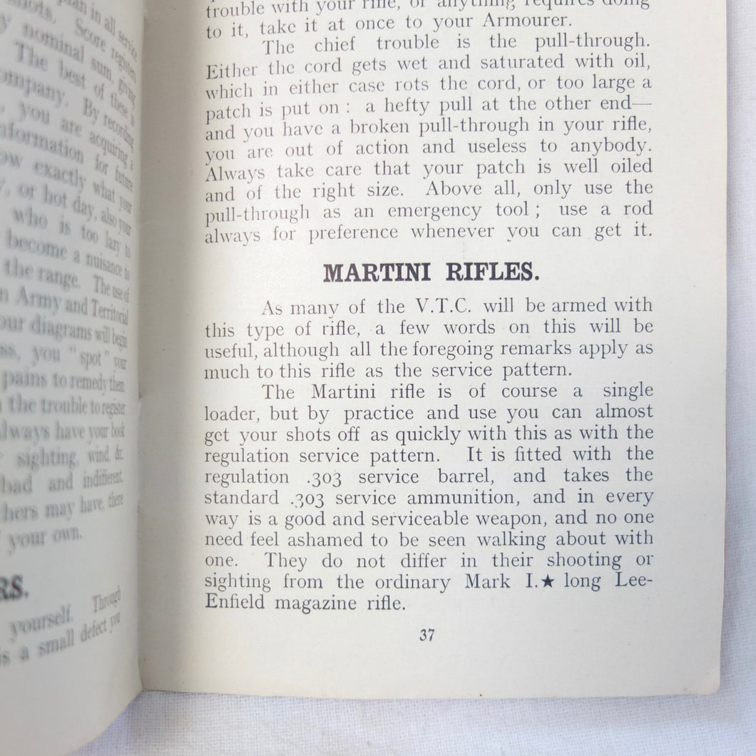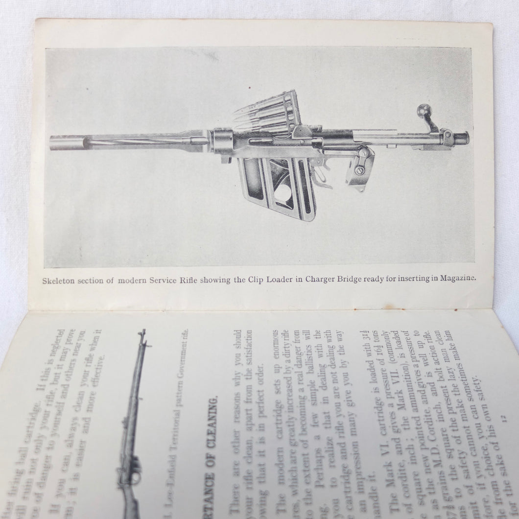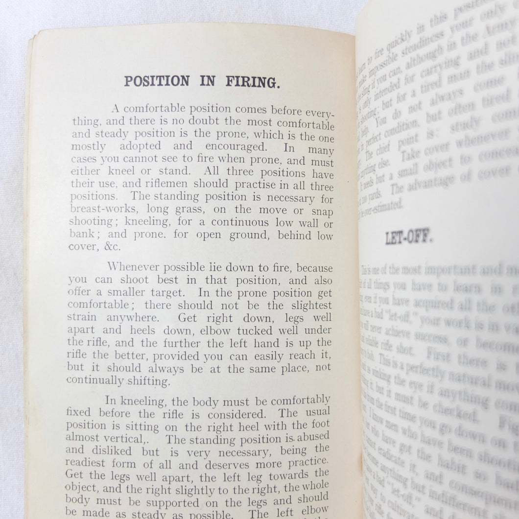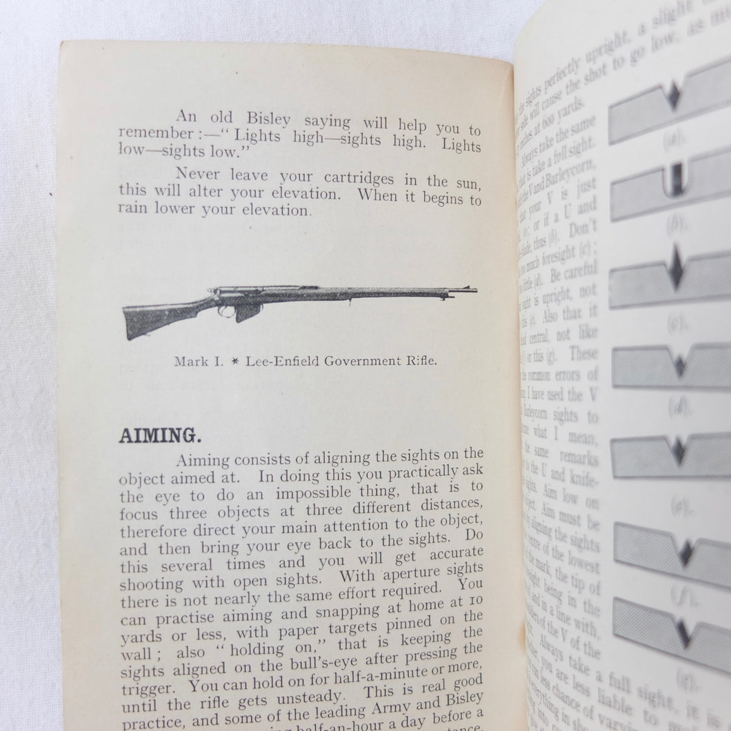 Practical Points in Musketry is a rare original WW1 Musketry handbook published c.1914. Illustrated with photographs and diagrams, the book covers the standard issue service rifles of the British Army before and during WW1: the Lee Enfield MK II charger loading magazine rifle, the Lee Enfield MK III SMLE, and the Martini Enfield Rifle (which was used by Volunteer Training Corps units before the start of the war). The book includes information on parts of the rifle, cleaning, sights and sighting, judging distance, allowance for wind, zeroing, elevation, aiming, firing positions, snap shooting, bullets, zone of fire, and range practice.