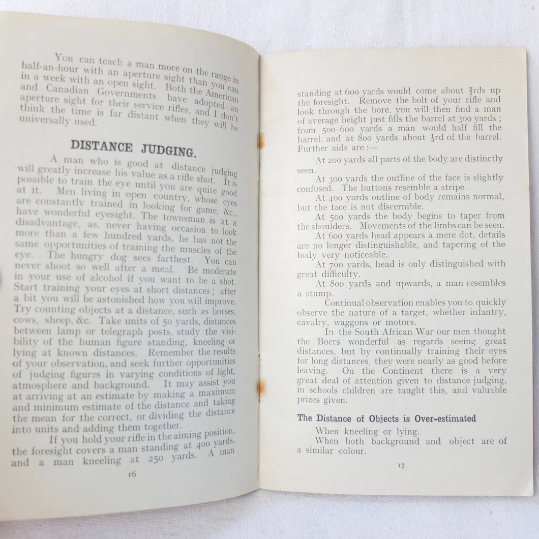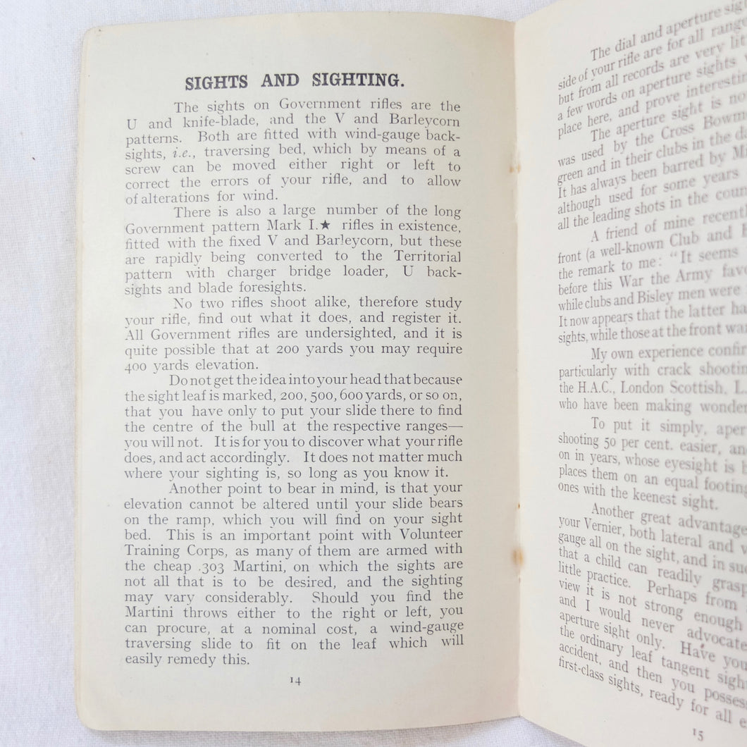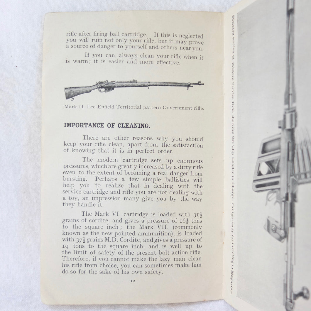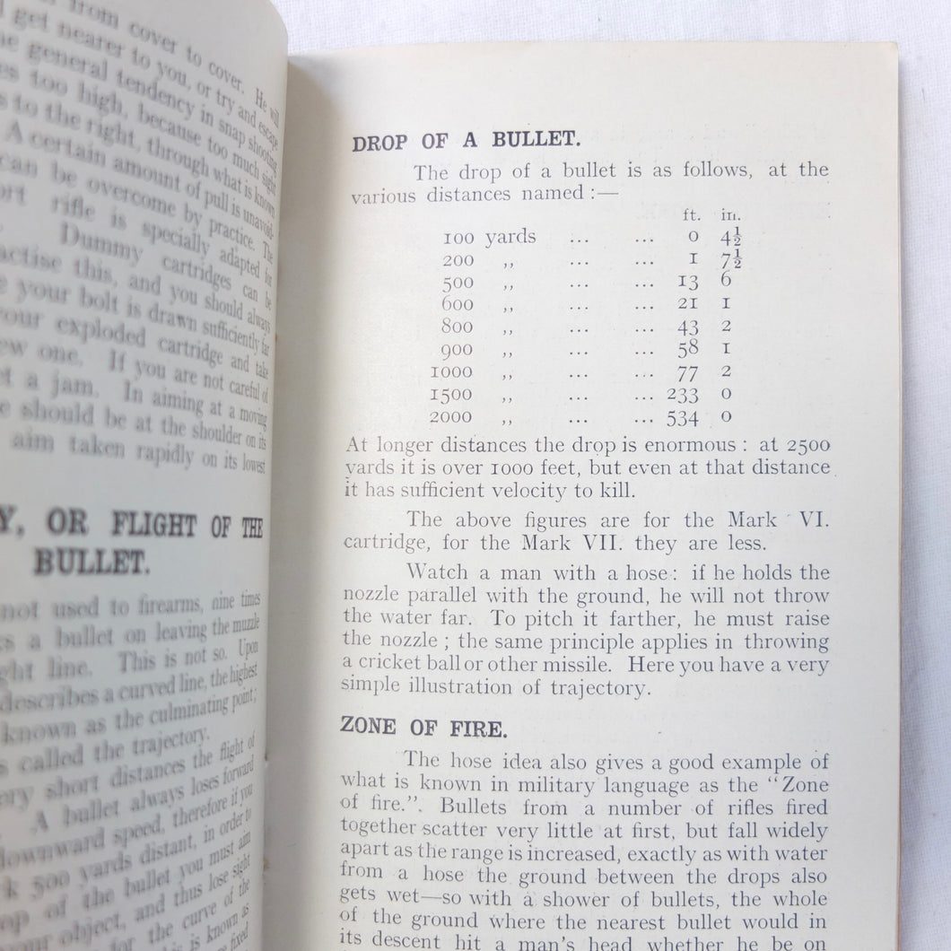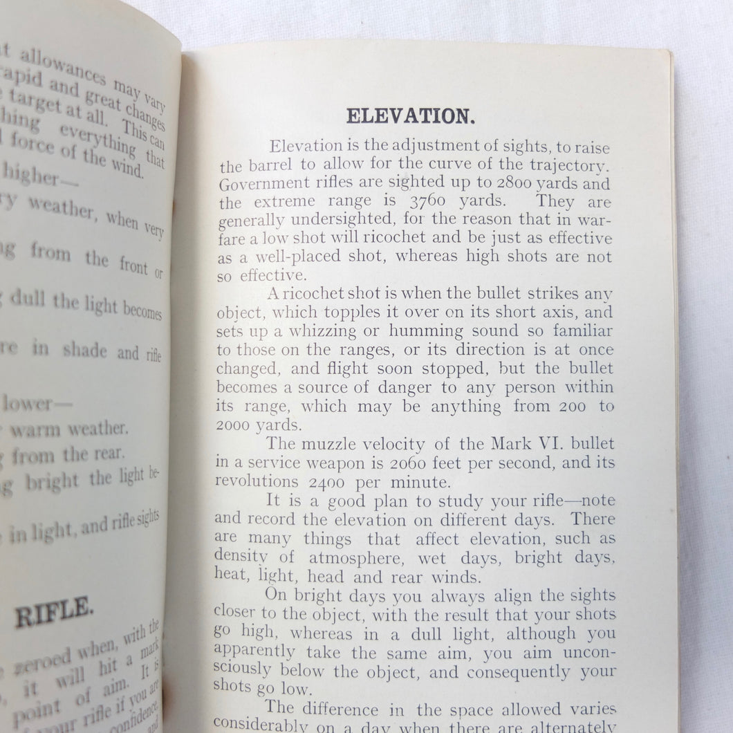 Practical Points in Musketry is a rare original WW1 Musketry handbook published c.1914. Illustrated with photographs and diagrams, the book covers the standard issue service rifles of the British Army before and during WW1: the Lee Enfield MK II charger loading magazine rifle, the Lee Enfield MK III SMLE, and the Martini Enfield Rifle (which was used by Volunteer Training Corps units before the start of the war). The book includes information on parts of the rifle, cleaning, sights and sighting, judging distance, allowance for wind, zeroing, elevation, aiming, firing positions, snap shooting, bullets, zone of fire, and range practice.