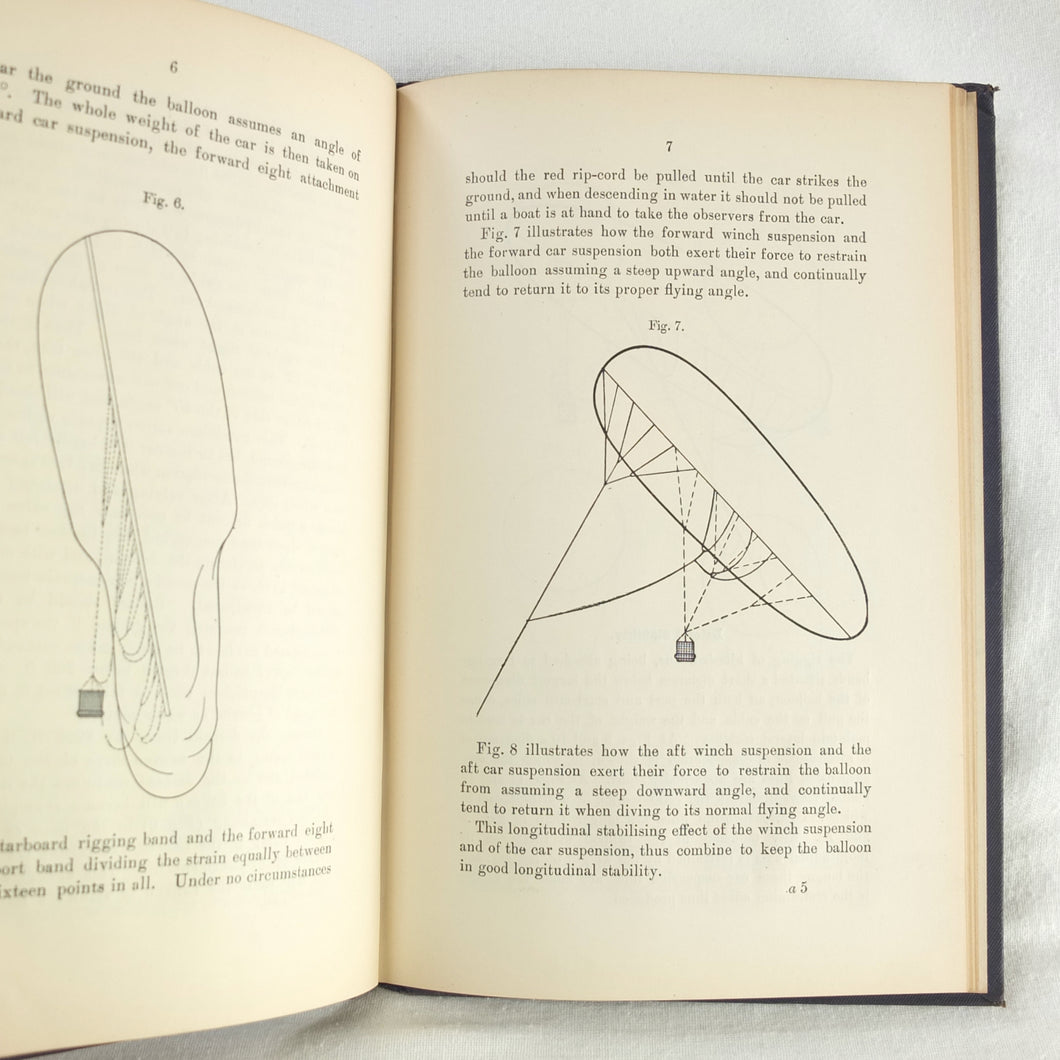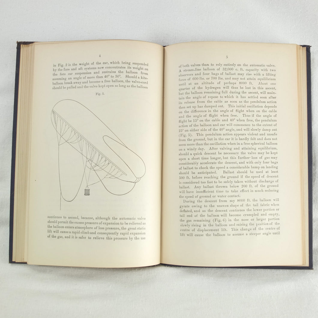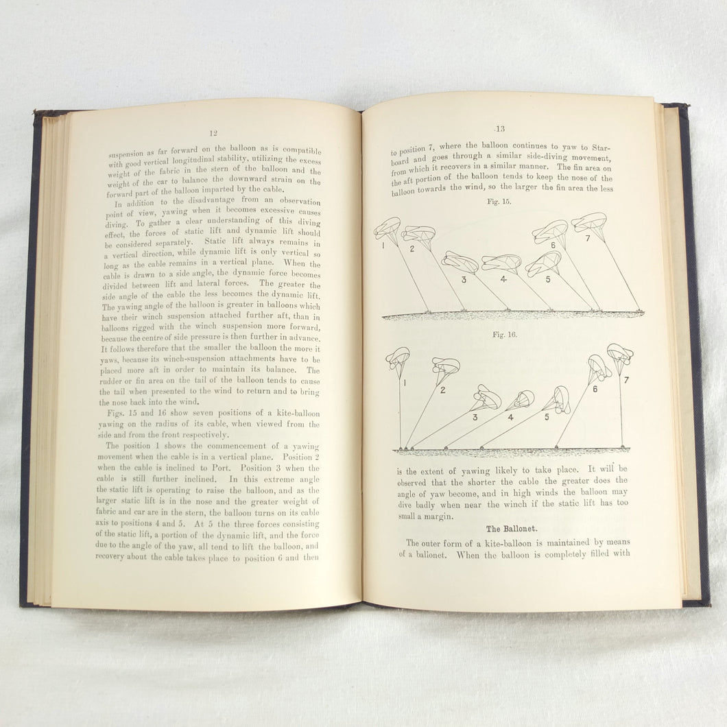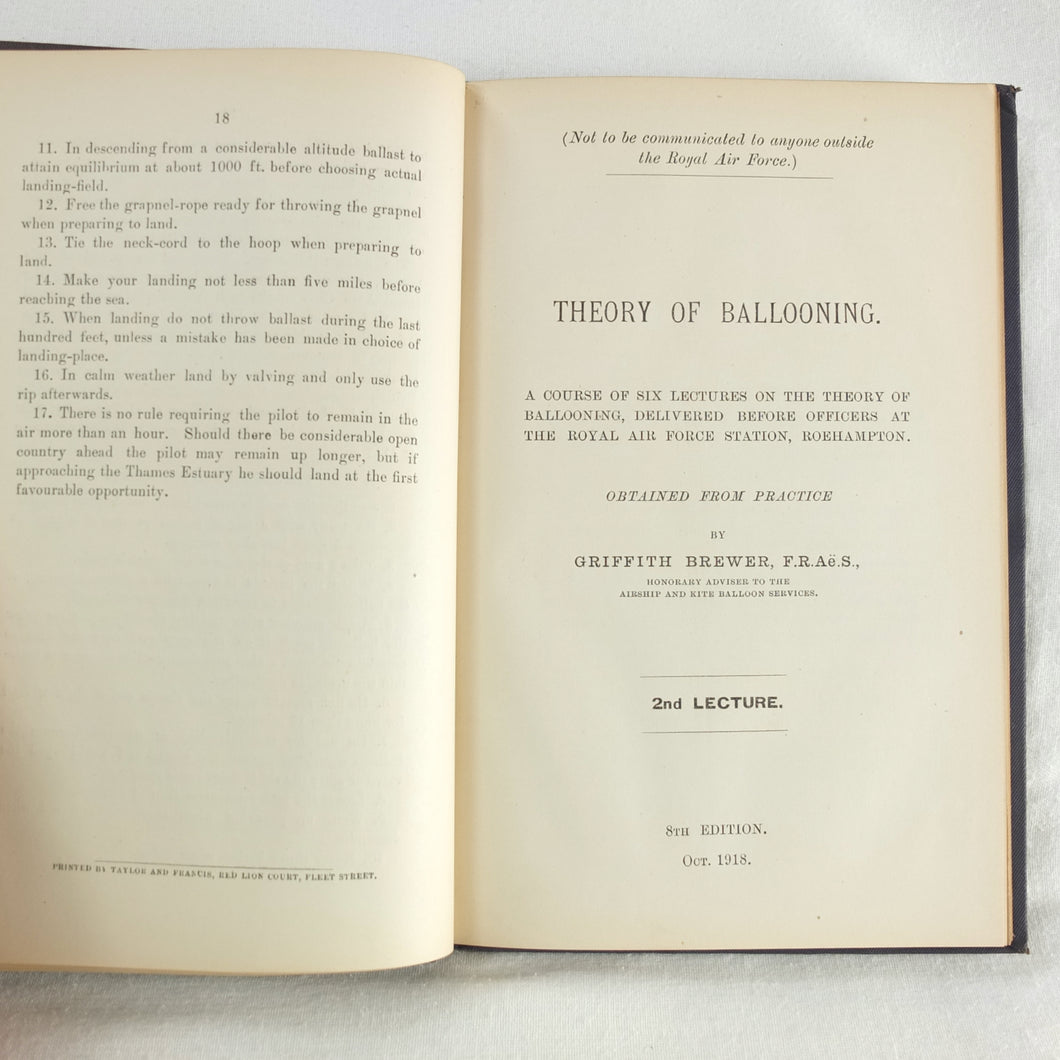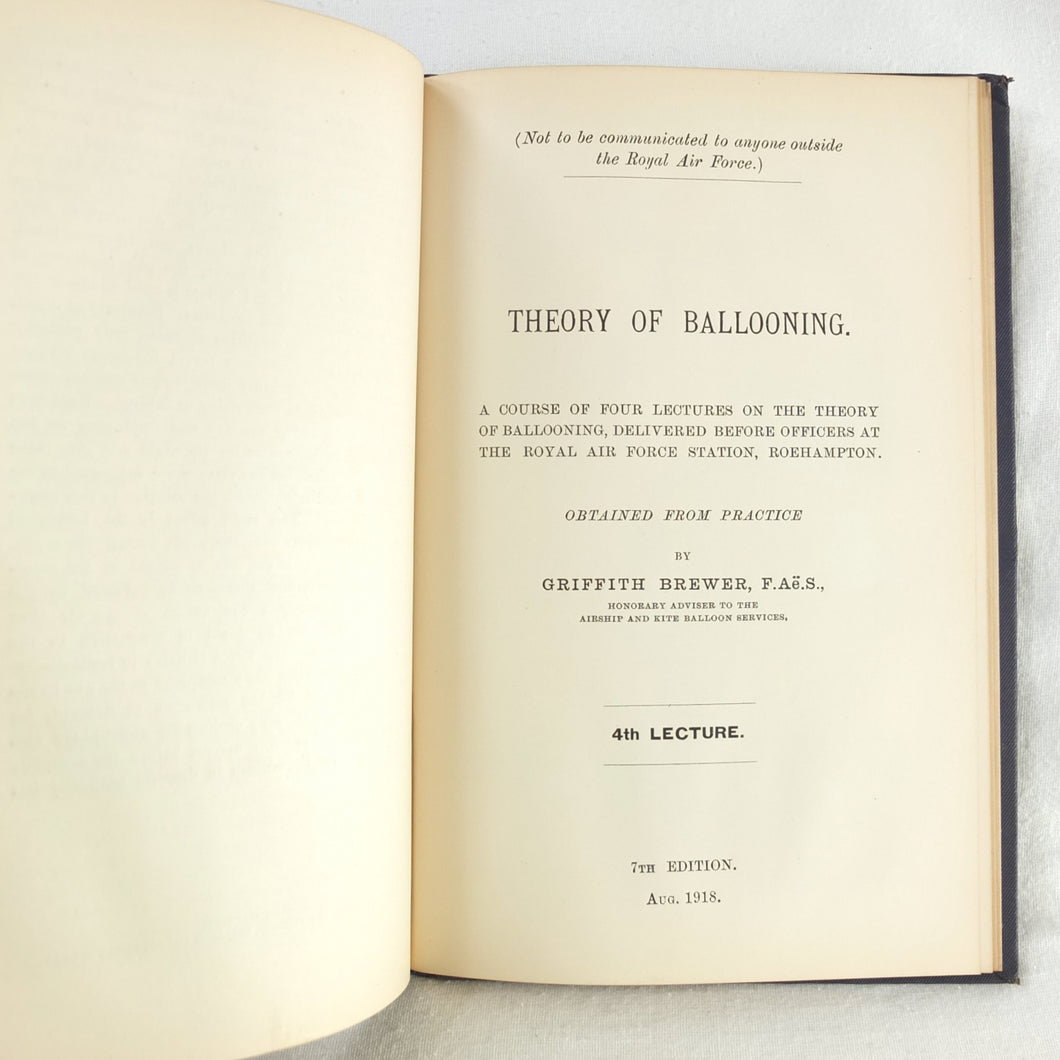 Theory of Ballooning (1918) is a collection of lectures on military ballooning which were delivered to R.N.A.S. and R.A.F. officers at Roehampton Royal Naval Air Service (later R.A.F.) Station between January 1916 and October 1918. The book was reprinted several times during WW1 - this is the 8th edition. It includes details of the principles and practice of ballooning, military Kite-Balloons, and ballooning & aviation instruments, including air speed indicators, barometers, barographs and statoscopes. Well illustrated with line drawings and diagrams, this is an important and very early work on the military use of balloons.