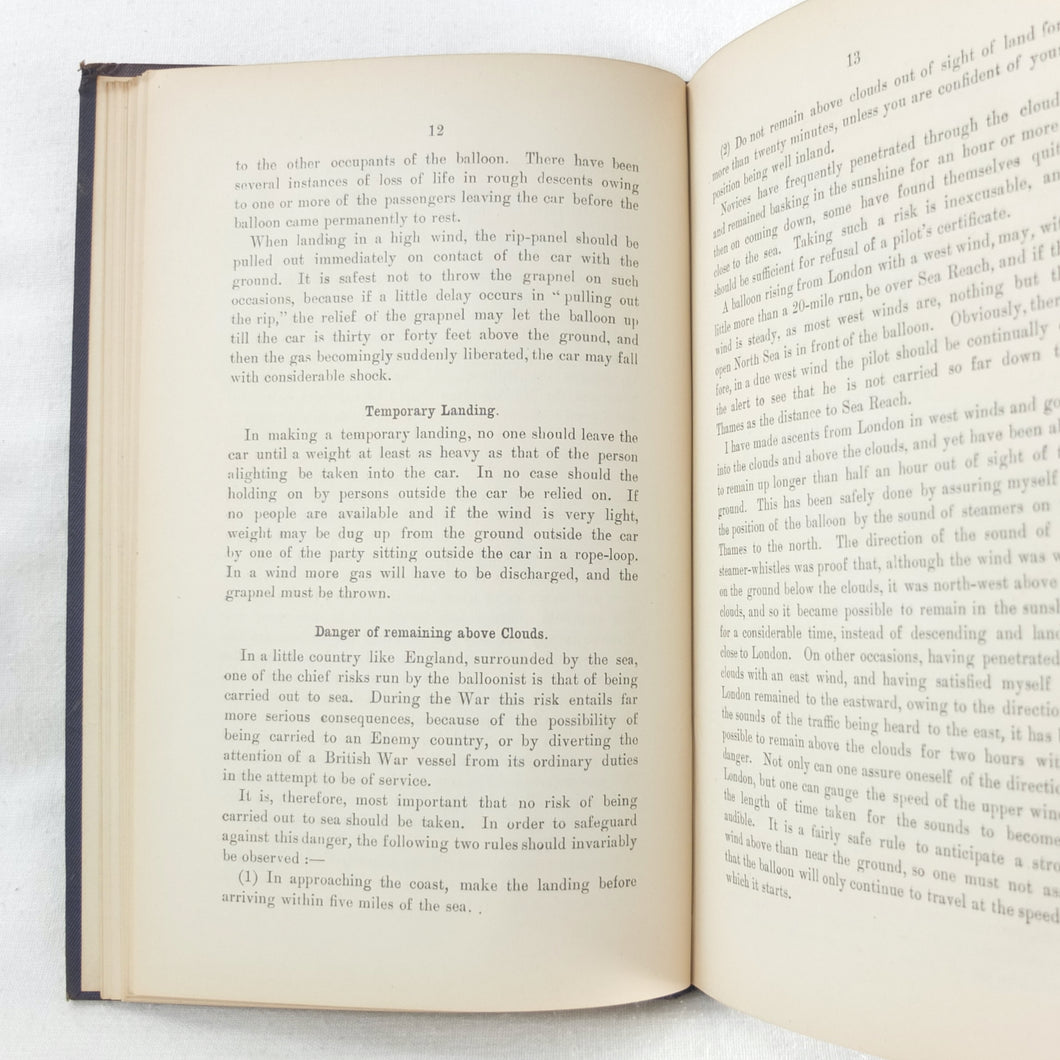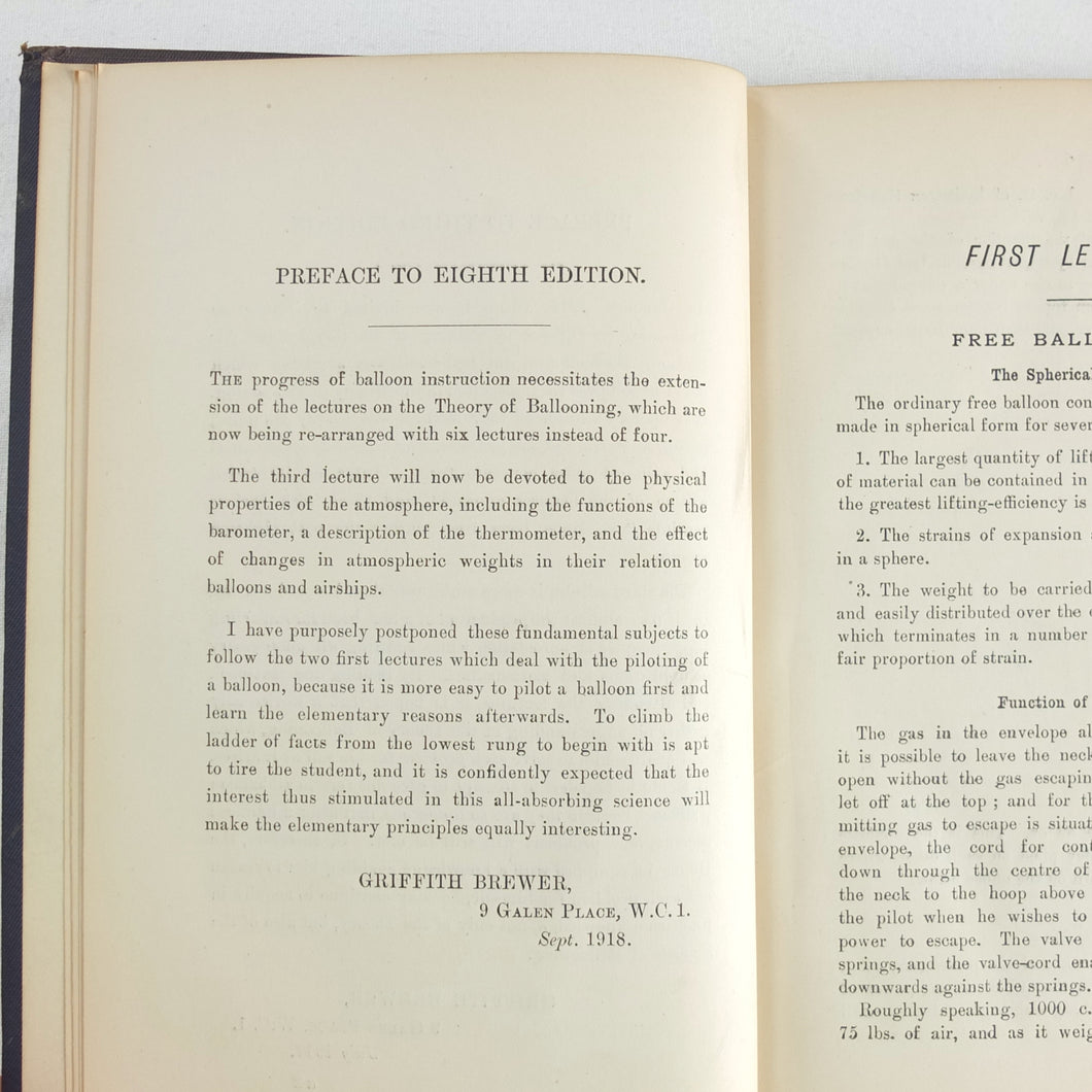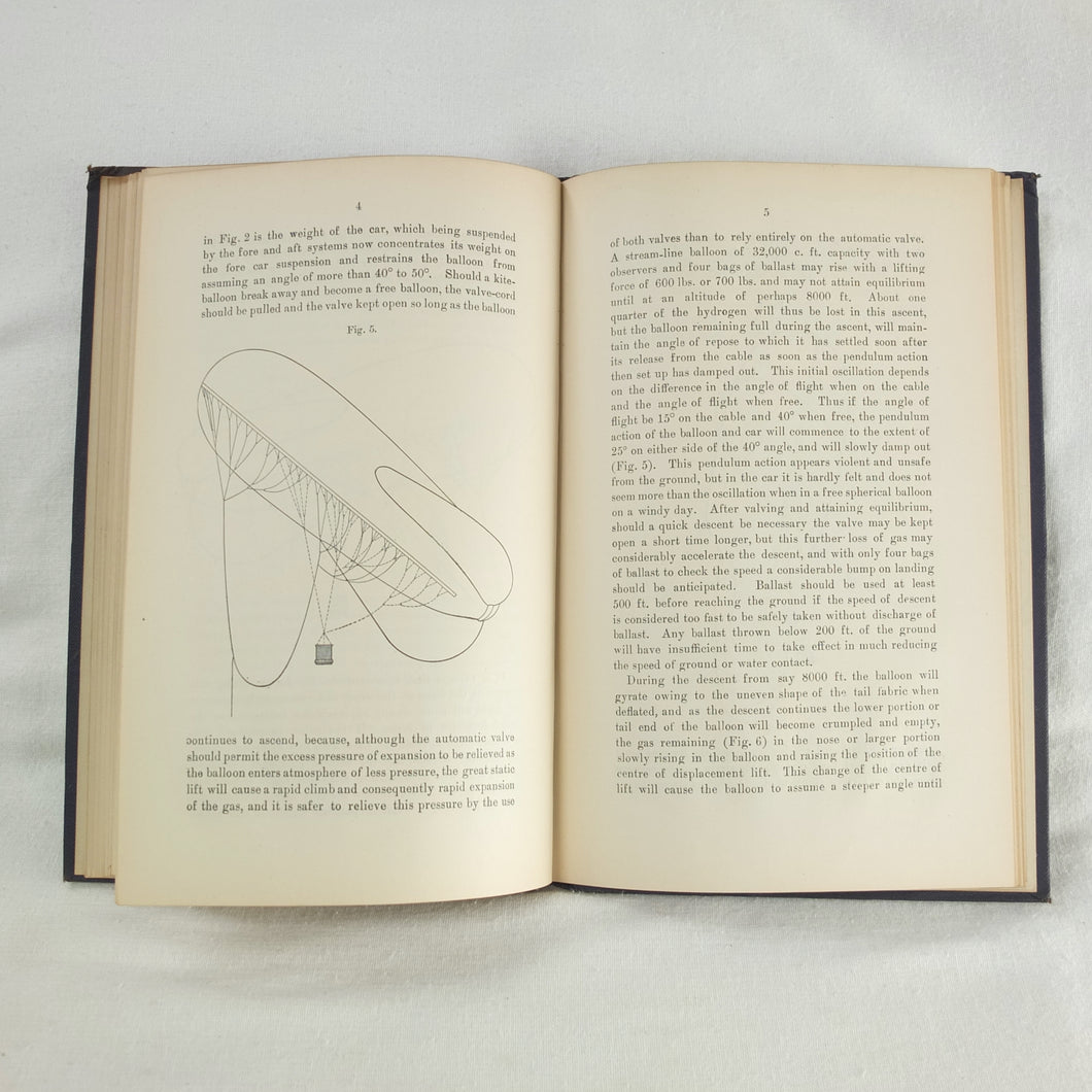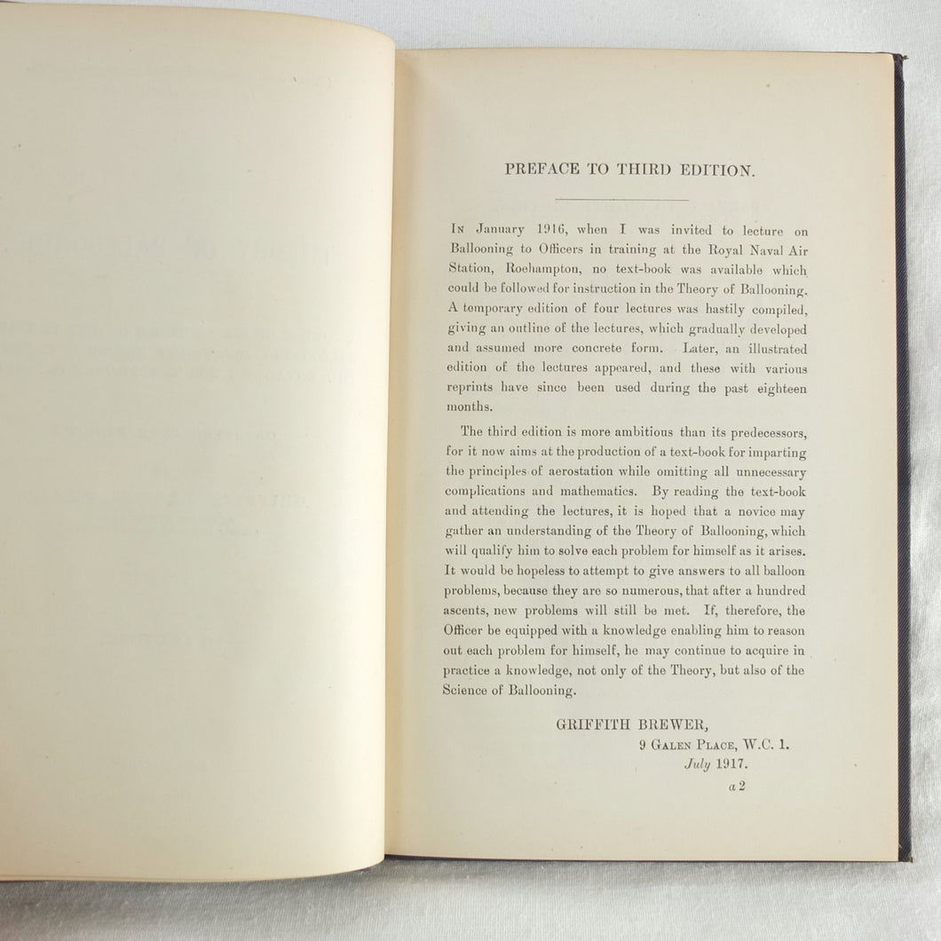 Theory of Ballooning (1918) is a collection of lectures on military ballooning which were delivered to R.N.A.S. and R.A.F. officers at Roehampton Royal Naval Air Service (later R.A.F.) Station between January 1916 and October 1918. The book was reprinted several times during WW1 - this is the 8th edition. It includes details of the principles and practice of ballooning, military Kite-Balloons, and ballooning & aviation instruments, including air speed indicators, barometers, barographs and statoscopes. Well illustrated with line drawings and diagrams, this is an important and very early work on the military use of balloons.