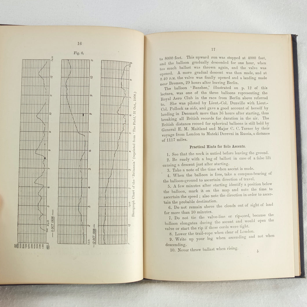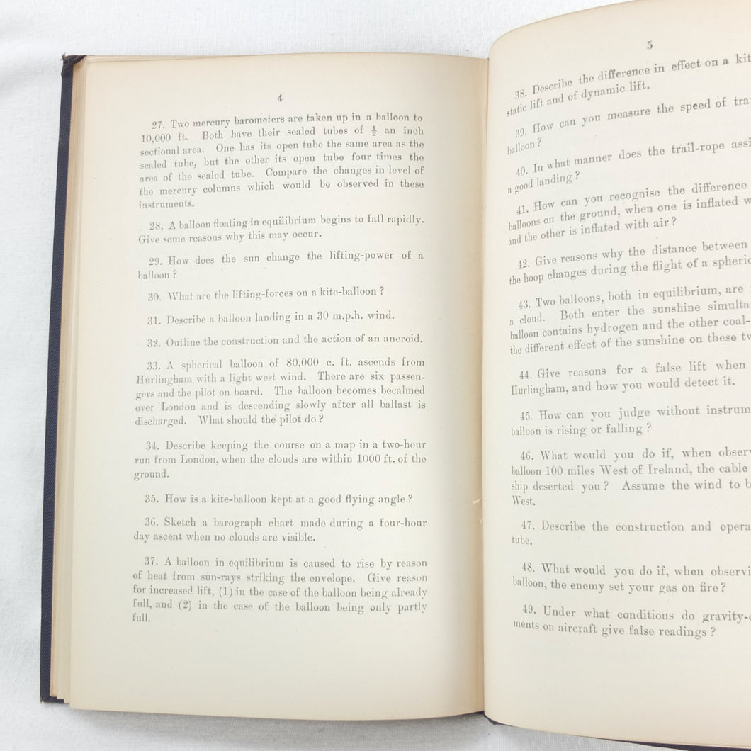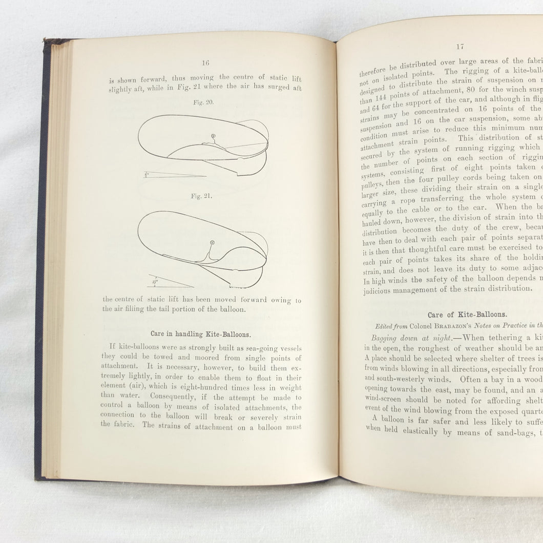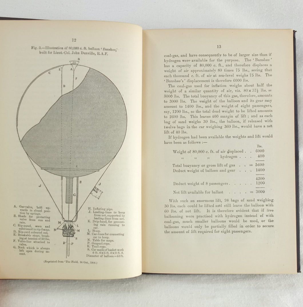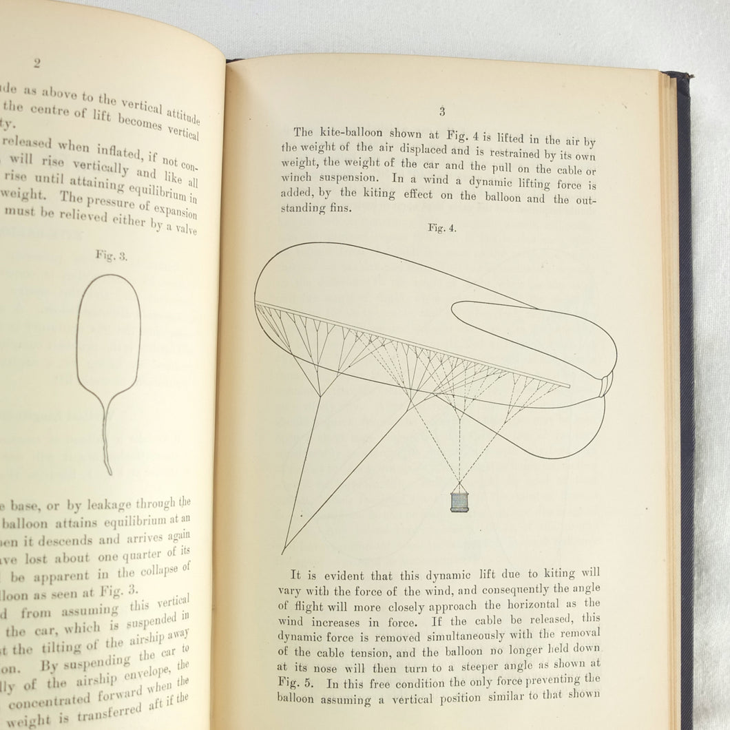 Theory of Ballooning (1918) is a collection of lectures on military ballooning which were delivered to R.N.A.S. and R.A.F. officers at Roehampton Royal Naval Air Service (later R.A.F.) Station between January 1916 and October 1918. The book was reprinted several times during WW1 - this is the 8th edition. It includes details of the principles and practice of ballooning, military Kite-Balloons, and ballooning & aviation instruments, including air speed indicators, barometers, barographs and statoscopes. Well illustrated with line drawings and diagrams, this is an important and very early work on the military use of balloons.