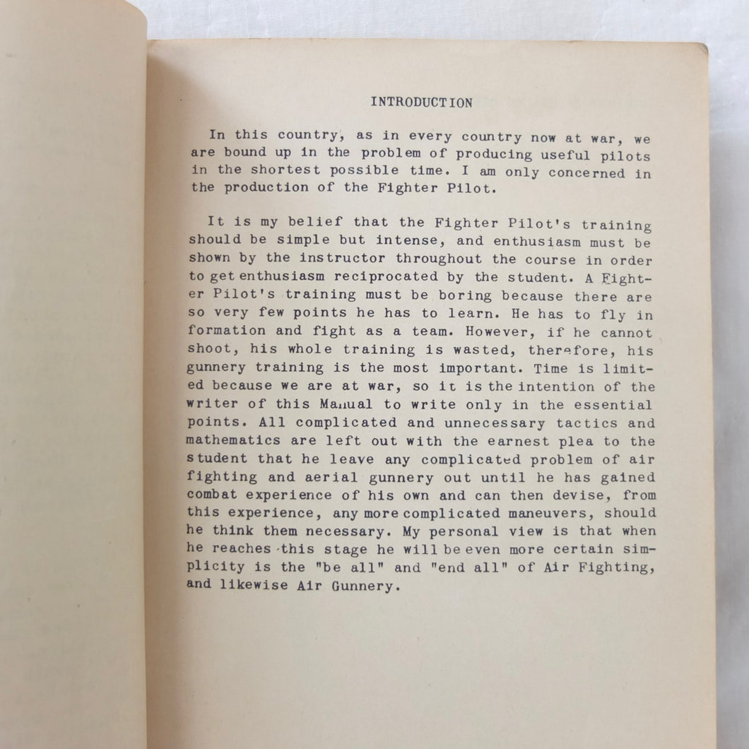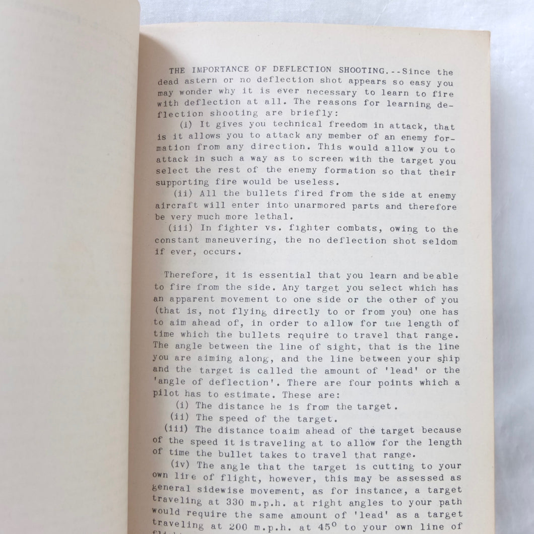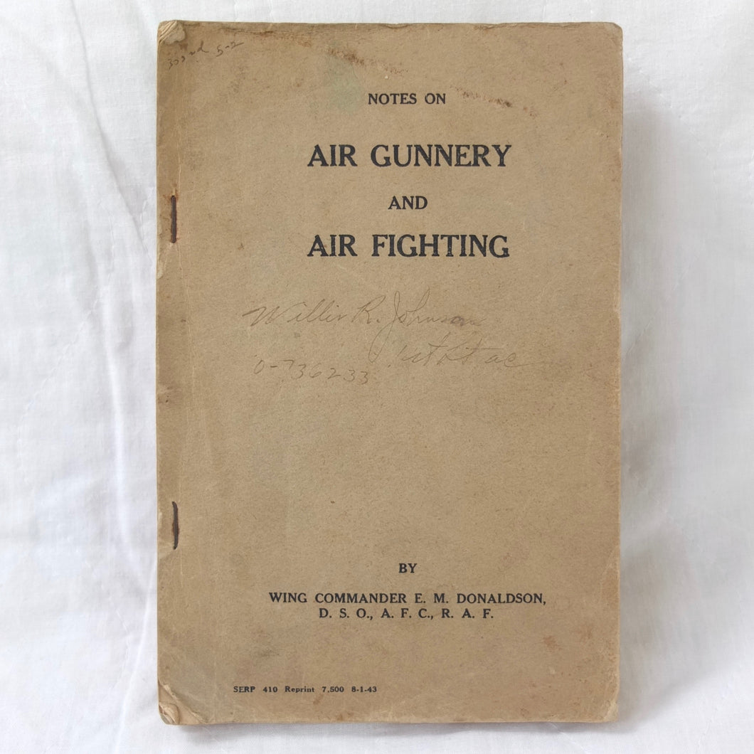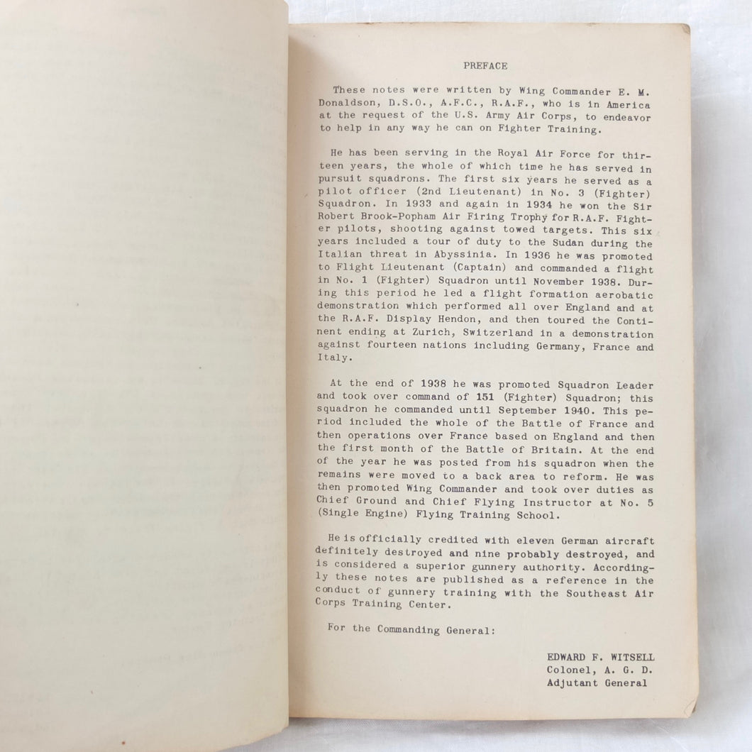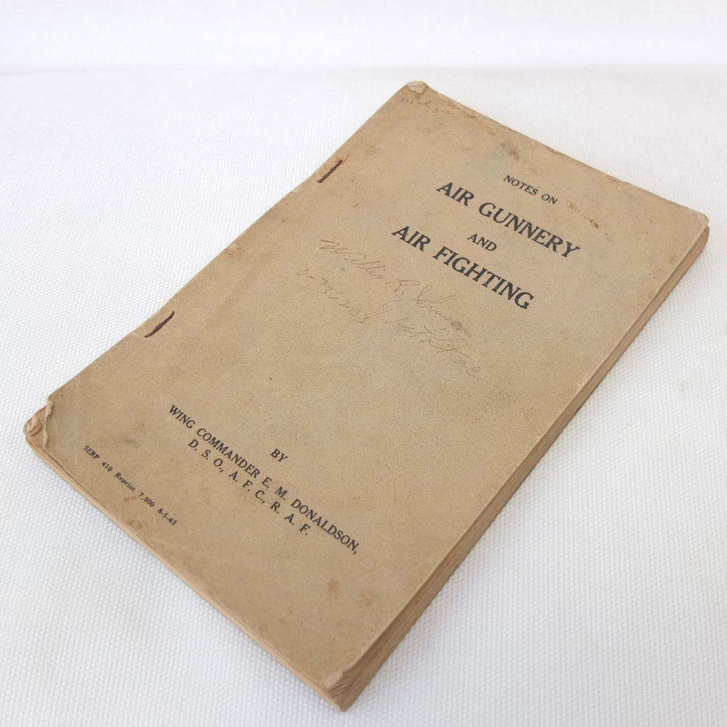 A very rare original WW2 Air Gunnery manual, published in 1943. Written by RAF Wing Commander E. M. Donaldson, a battle of Britain fighter ace, this is a detailed, practical guide to aerial gunnery and air combat for RAF and Allied air forces fighter pilots. It was produced while Donaldson was working with the USAAF as a senior instructor in air combat flying. The book includes instructions on fighter squadron deployment, escort of bombers, ground strafing, night operations, firepower, anti-aircraft fire, sighting, estimating range, angles of attack, and deflection shooting. The book also includes 'Sailor' Malan's famous 'Golden Rules' on air fighting, and much other very useful advice on all aspects of aerial combat.