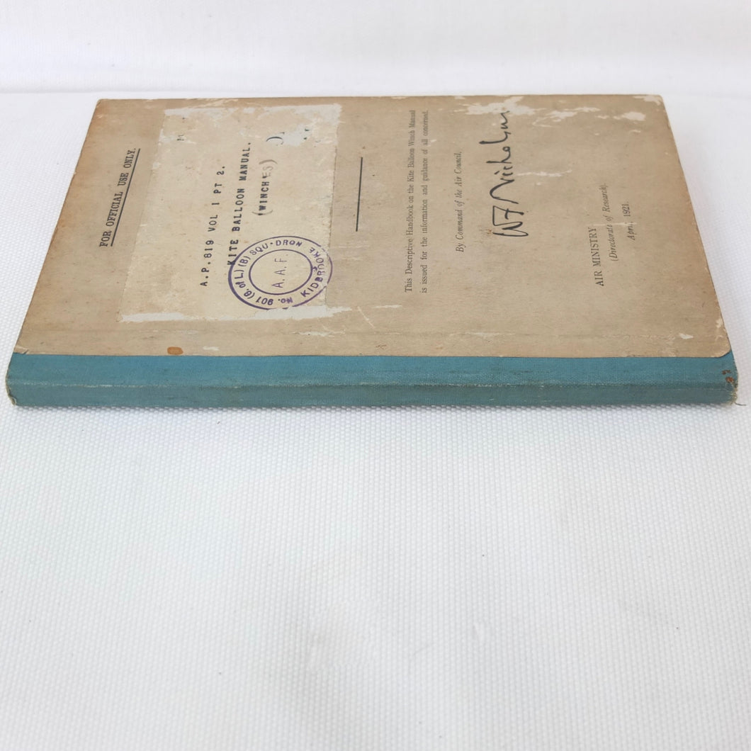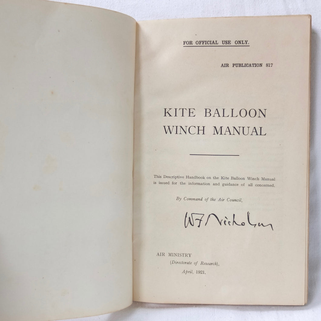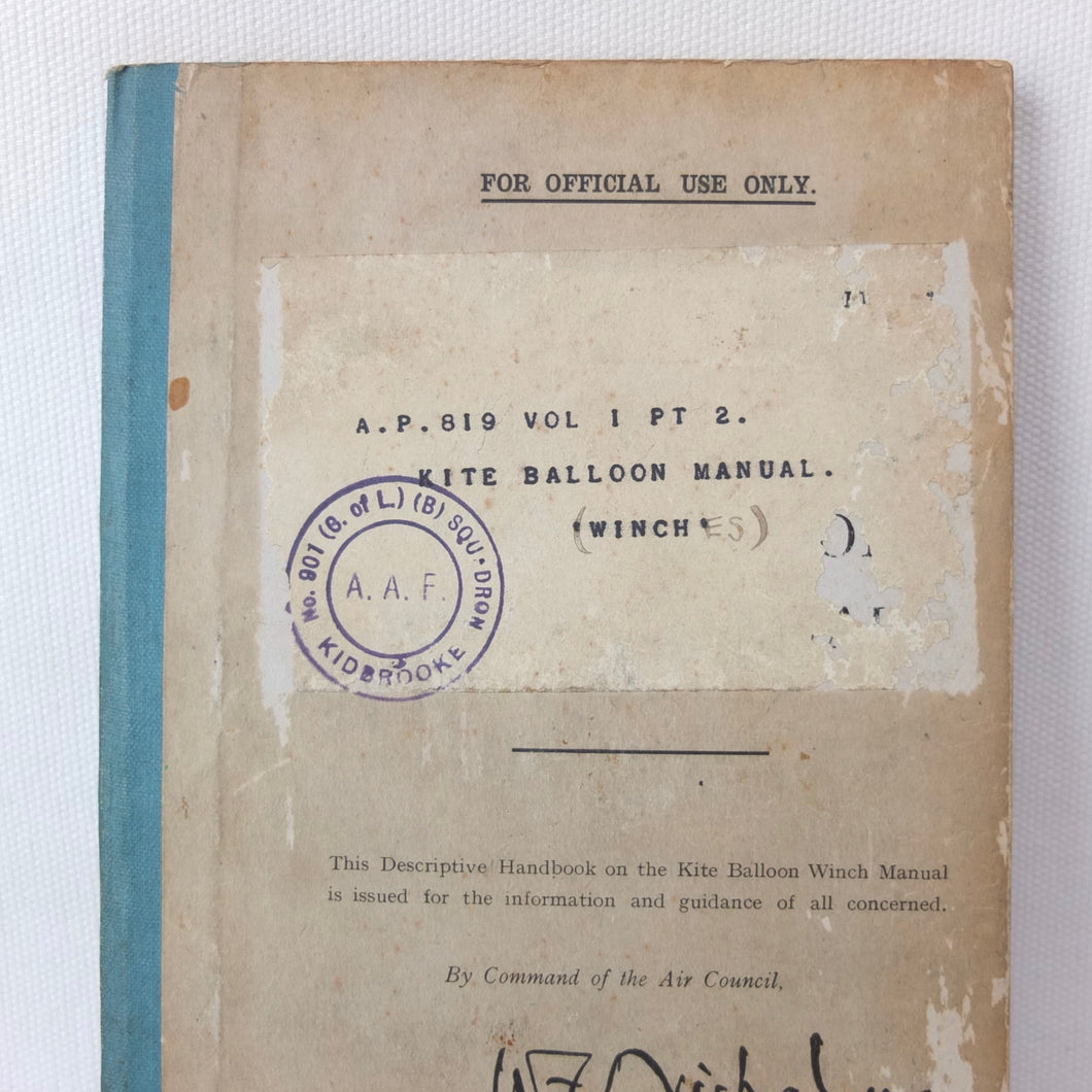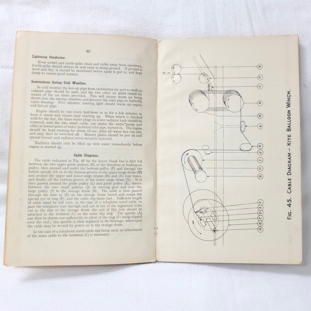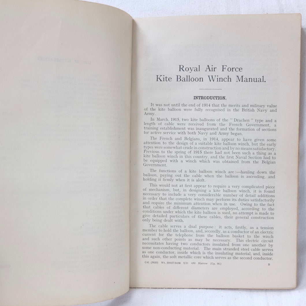 A very rare original WW1-era Air Ministry Kite Balloon Winch Manual, covering the various different winches and associated equipment used by the RAF at the end of WW1. The manual covers the use and maintenance of RAF winches, for both land based and naval operations. Subjects covered include: the history of naval and military kite balloons, kite balloon installation in H. M. Ships, hydraulic wincjes, winding units, standard steam engines, transferring winch, electric winch, gears, wire-leading units, snatch blocks, instruments, Royal Air Force Balloon winches: Scammell and Caquot types. The book is well illustrated with 48 photographs and diagrams of RAF kite balloons, winches and engines. There is an ink stamp of 'No. 901 Squadron, A.A.F., Kidbrooke' on the front cover
