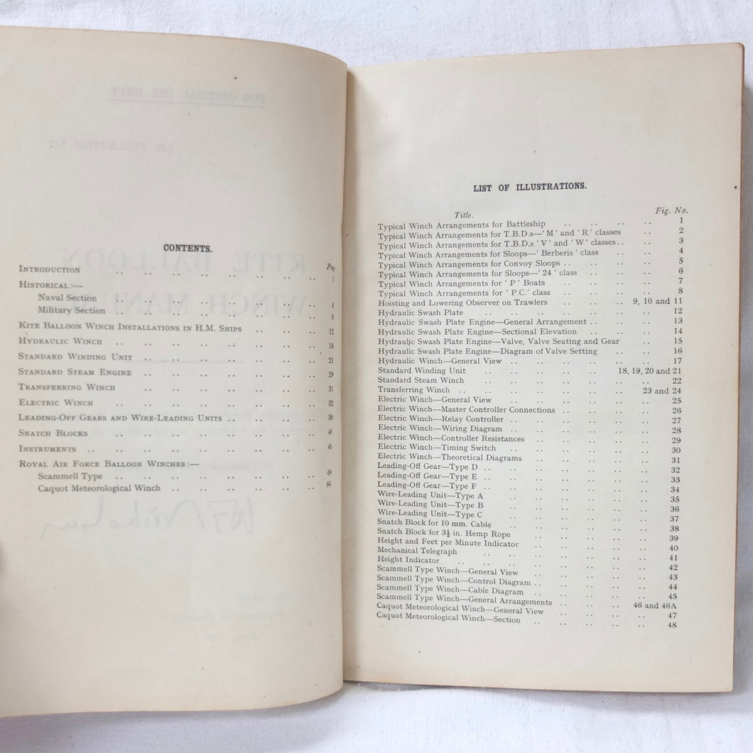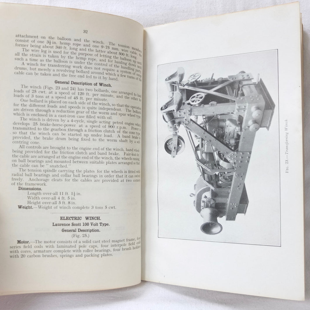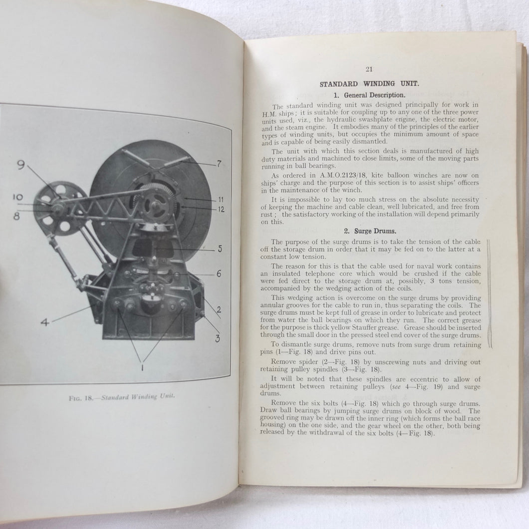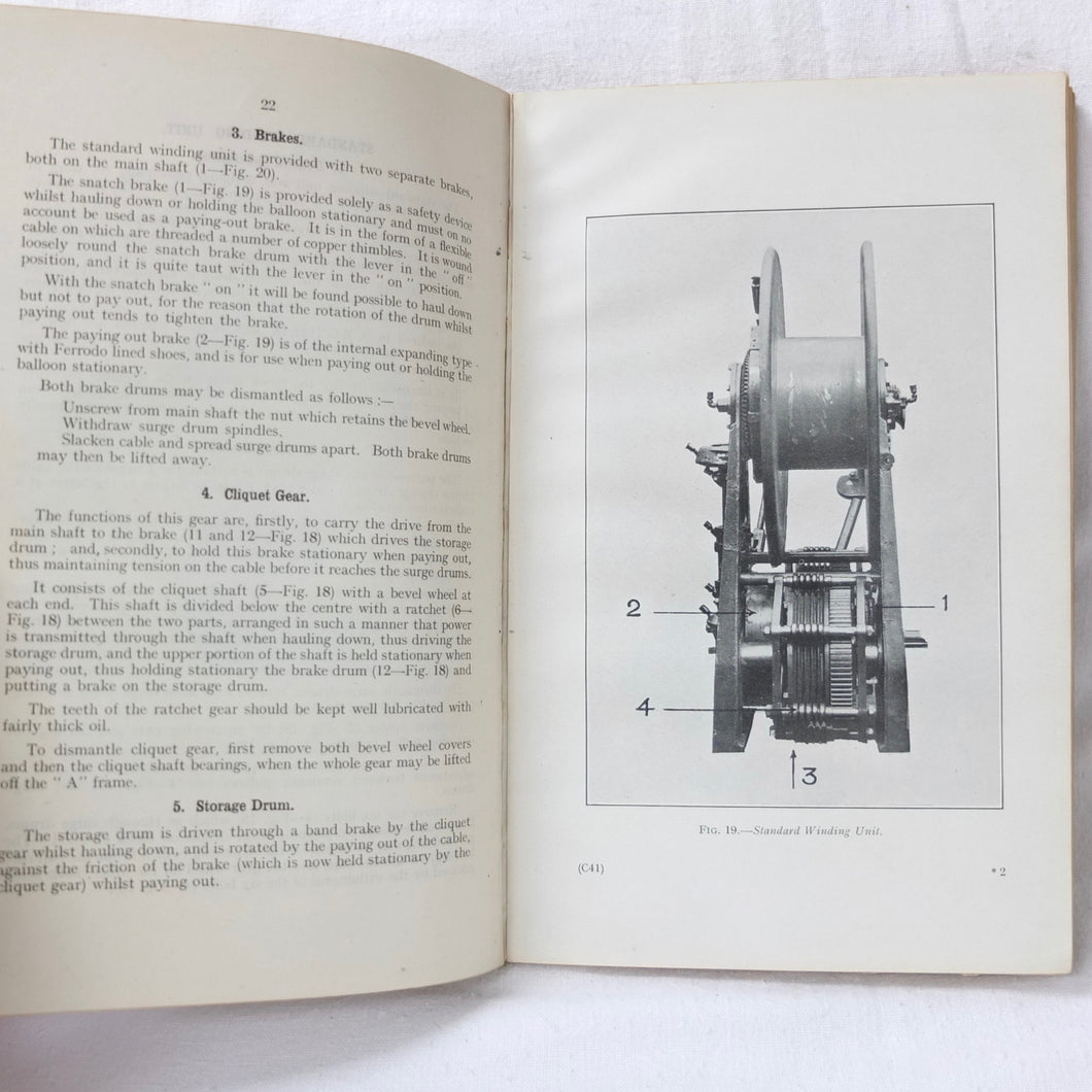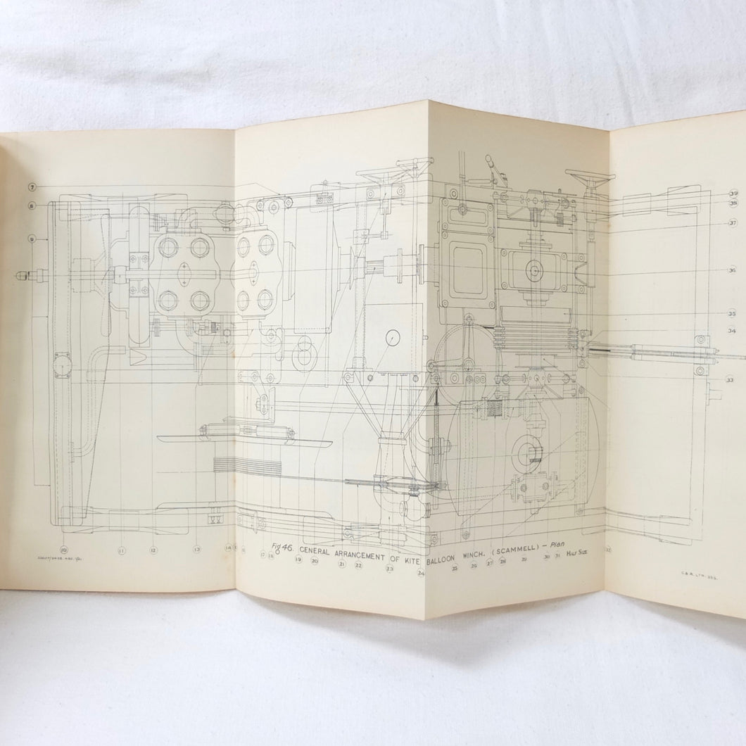 A very rare original WW1-era Air Ministry Kite Balloon Winch Manual, covering the various different winches and associated equipment used by the RAF at the end of WW1. The manual covers the use and maintenance of RAF winches, for both land based and naval operations. Subjects covered include: the history of naval and military kite balloons, kite balloon installation in H. M. Ships, hydraulic wincjes, winding units, standard steam engines, transferring winch, electric winch, gears, wire-leading units, snatch blocks, instruments, Royal Air Force Balloon winches: Scammell and Caquot types. The book is well illustrated with 48 photographs and diagrams of RAF kite balloons, winches and engines. There is an ink stamp of 'No. 901 Squadron, A.A.F., Kidbrooke' on the front cover