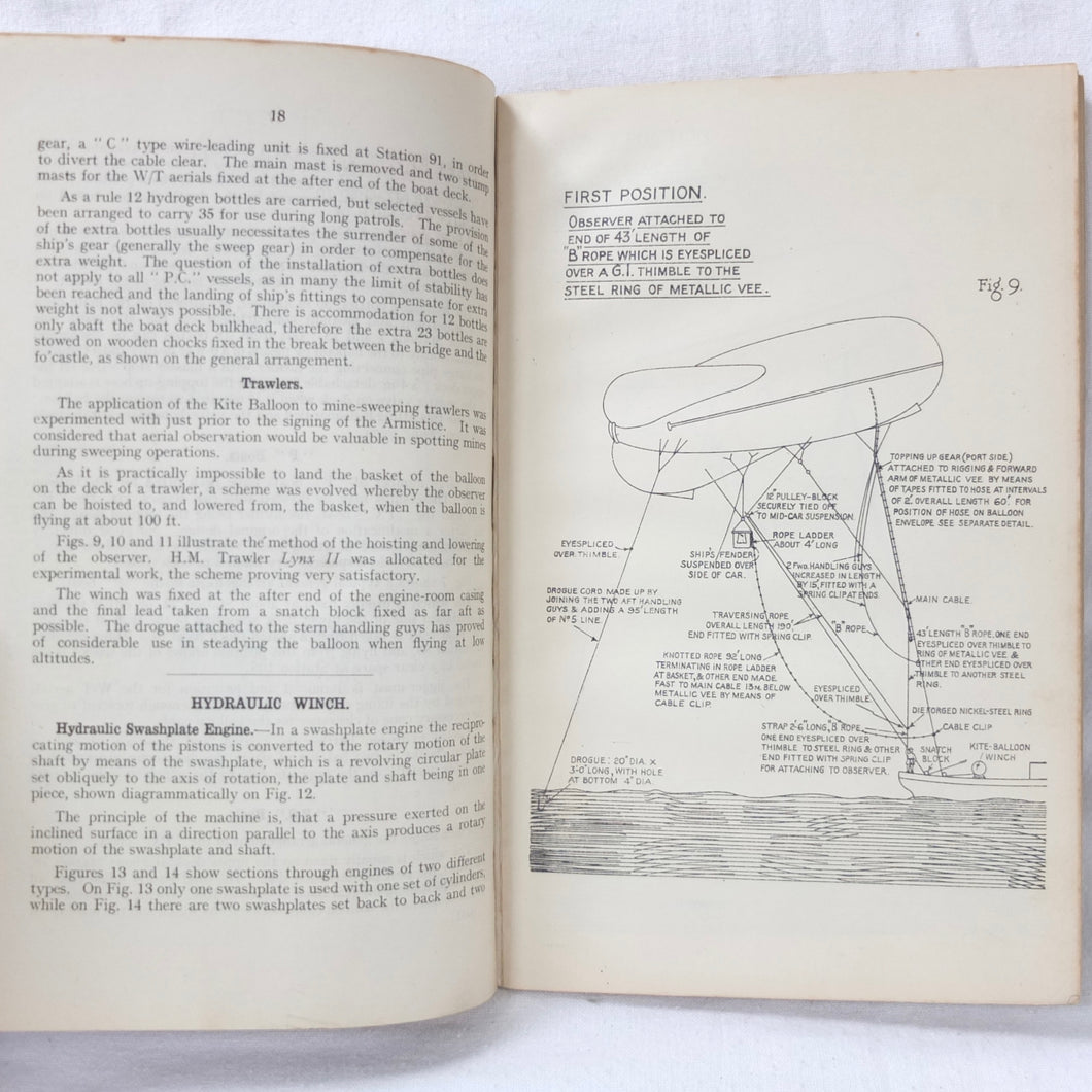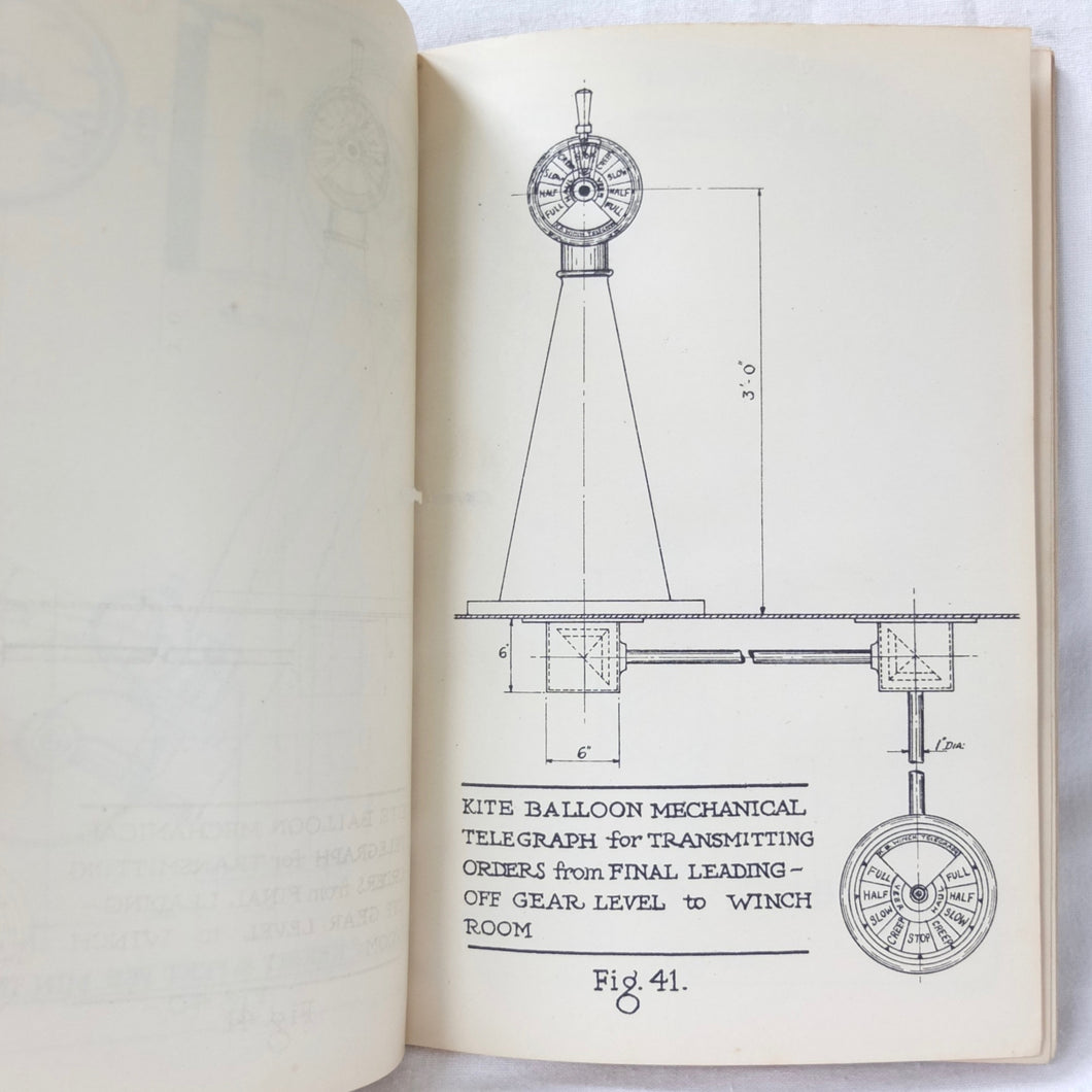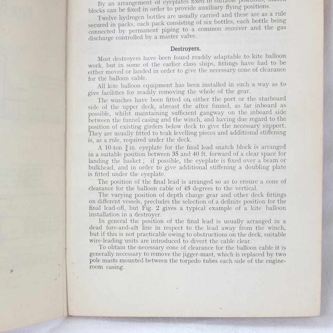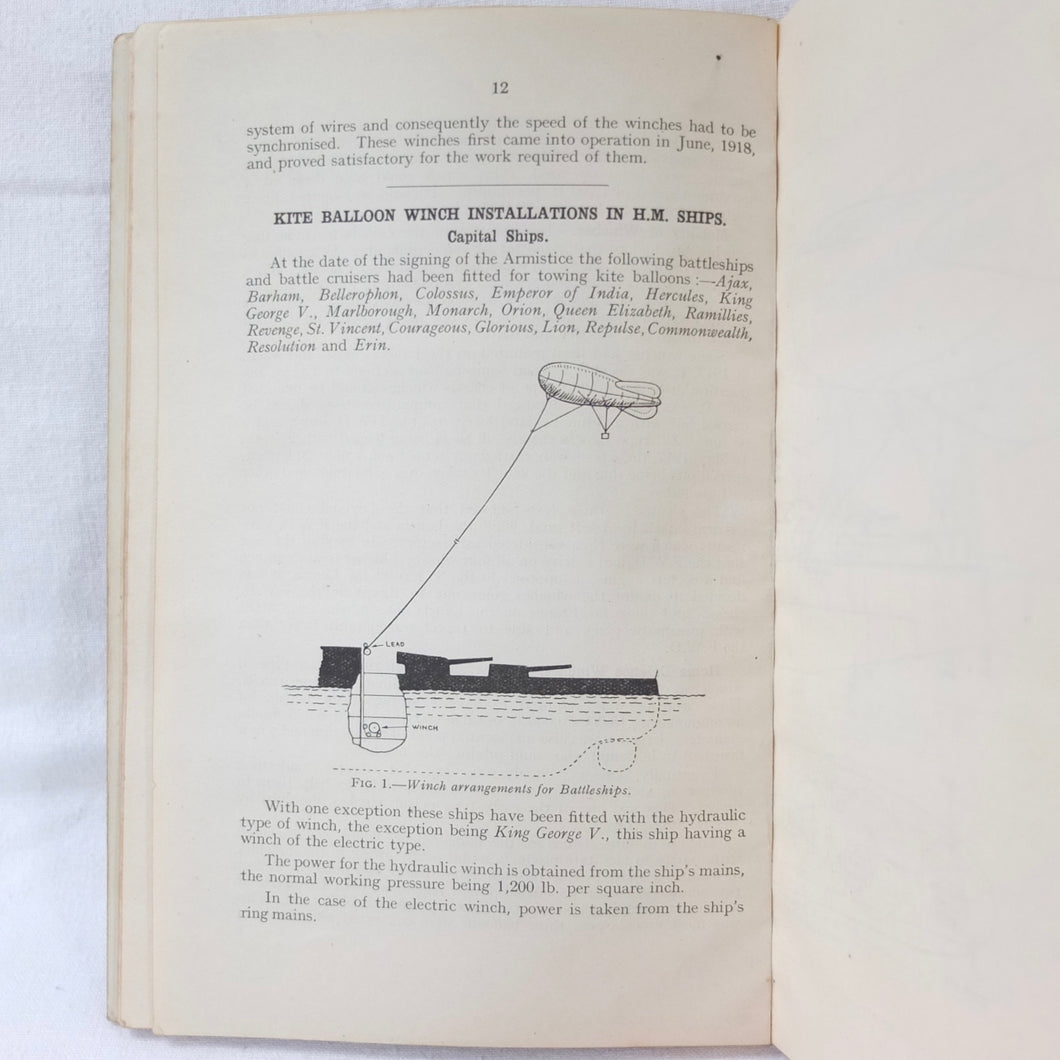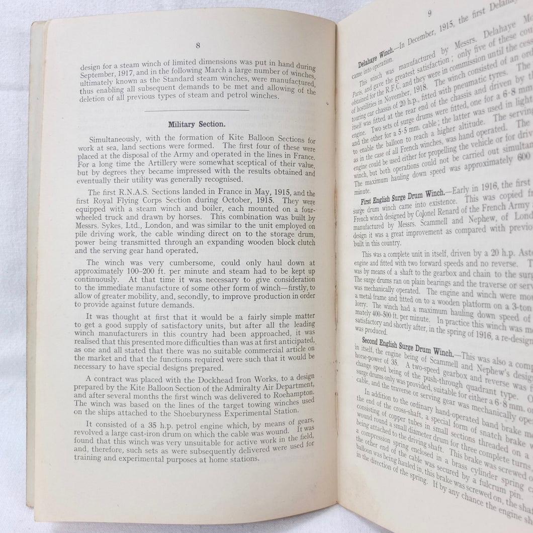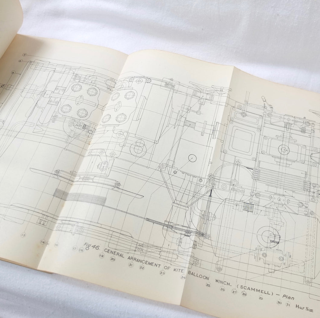 A very rare original WW1-era Air Ministry Kite Balloon Winch Manual, covering the various different winches and associated equipment used by the RAF at the end of WW1. The manual covers the use and maintenance of RAF winches, for both land based and naval operations. Subjects covered include: the history of naval and military kite balloons, kite balloon installation in H. M. Ships, hydraulic wincjes, winding units, standard steam engines, transferring winch, electric winch, gears, wire-leading units, snatch blocks, instruments, Royal Air Force Balloon winches: Scammell and Caquot types. The book is well illustrated with 48 photographs and diagrams of RAF kite balloons, winches and engines. There is an ink stamp of 'No. 901 Squadron, A.A.F., Kidbrooke' on the front cover