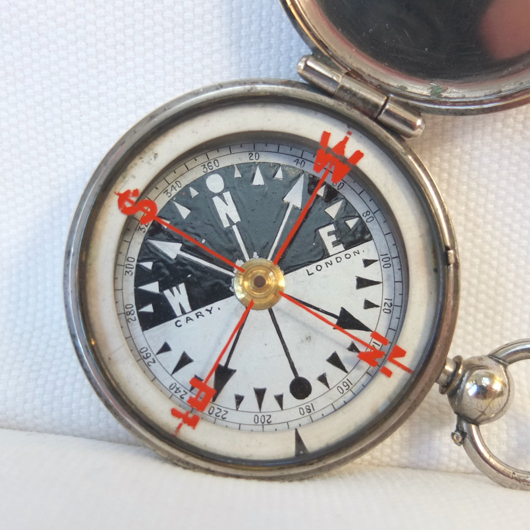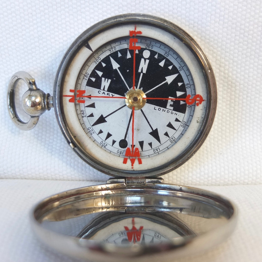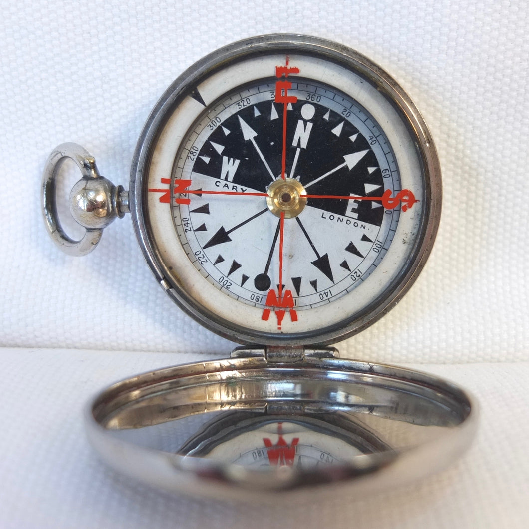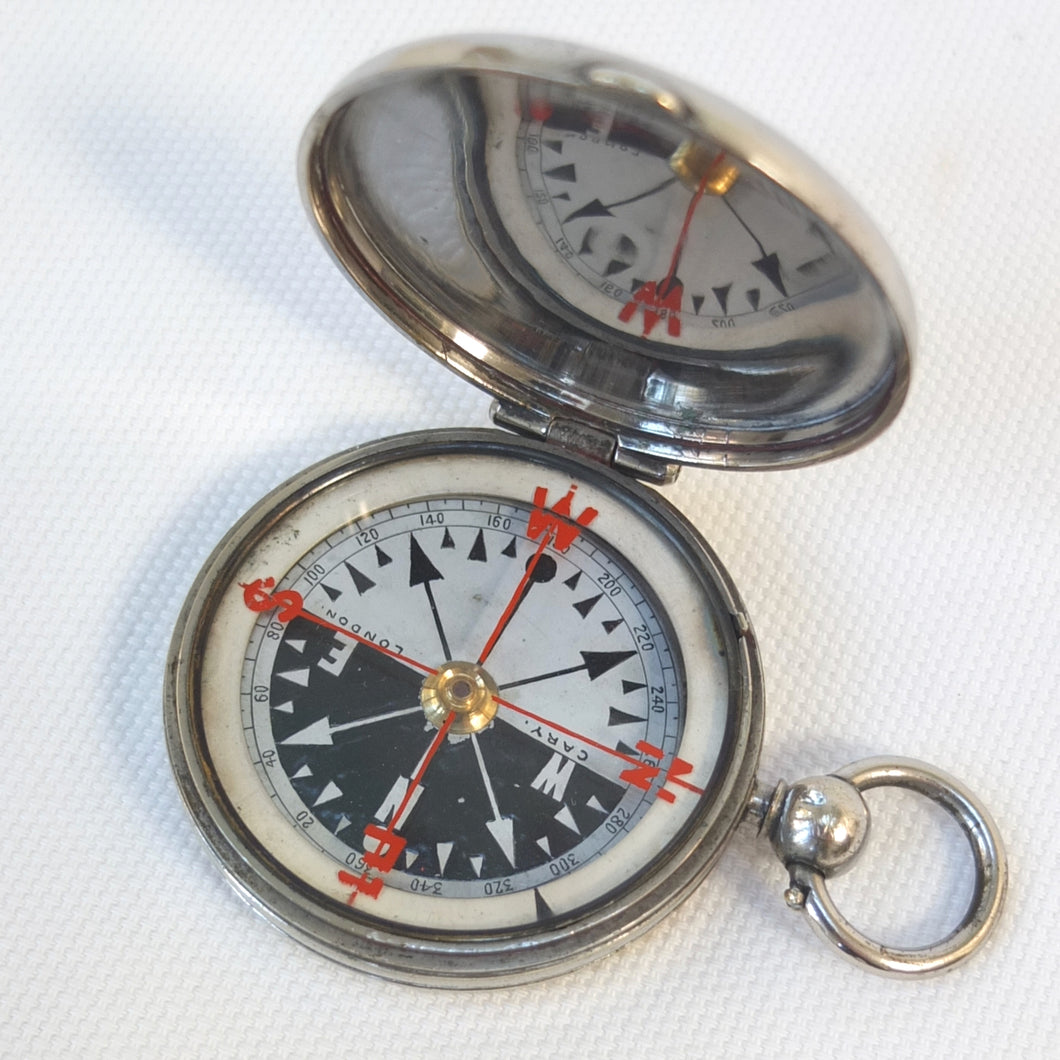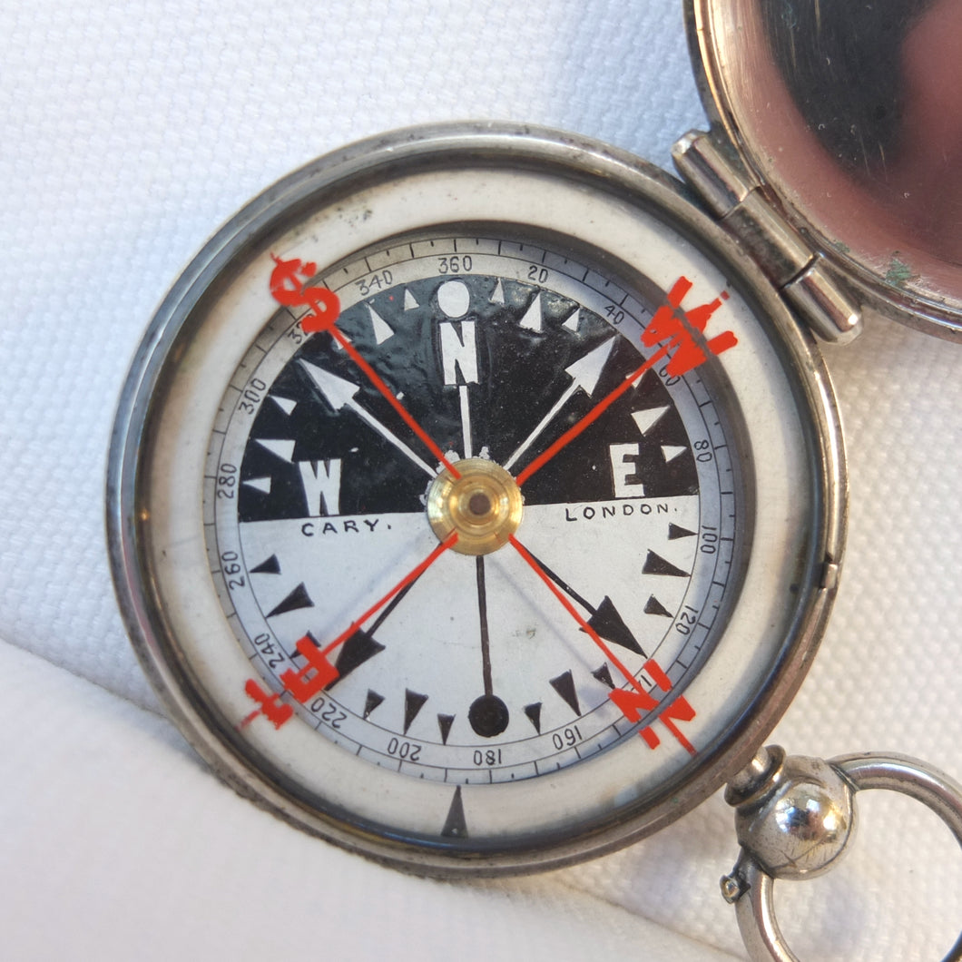 A Francis Barker & Son ‘RGS’ type pocket compass, dating from c.1900. The compass card is marked with the retailers details: ‘Cary, London’. The compass has a nickel plated brass hunter case, and an aluminium card with a jewelled pivot. The card is hand painted in black, with the four cardinal points painted in red on the underside of the glass. The compass has an automatic transit lock, operated when the lid is closed. This is a well documented Barker design, which was supplied unsigned by the maker to Cary and several other well known London retailers (including J. H. Steward). The retailer would then add their own details to the compass card. Cary supplied scientific instruments such as this to explorers and military officers, and the company provided the compasses used by Ernest Shackleton and his team during the celebrated 1907-1909 British Antarctic Expedition.