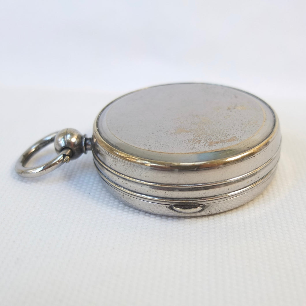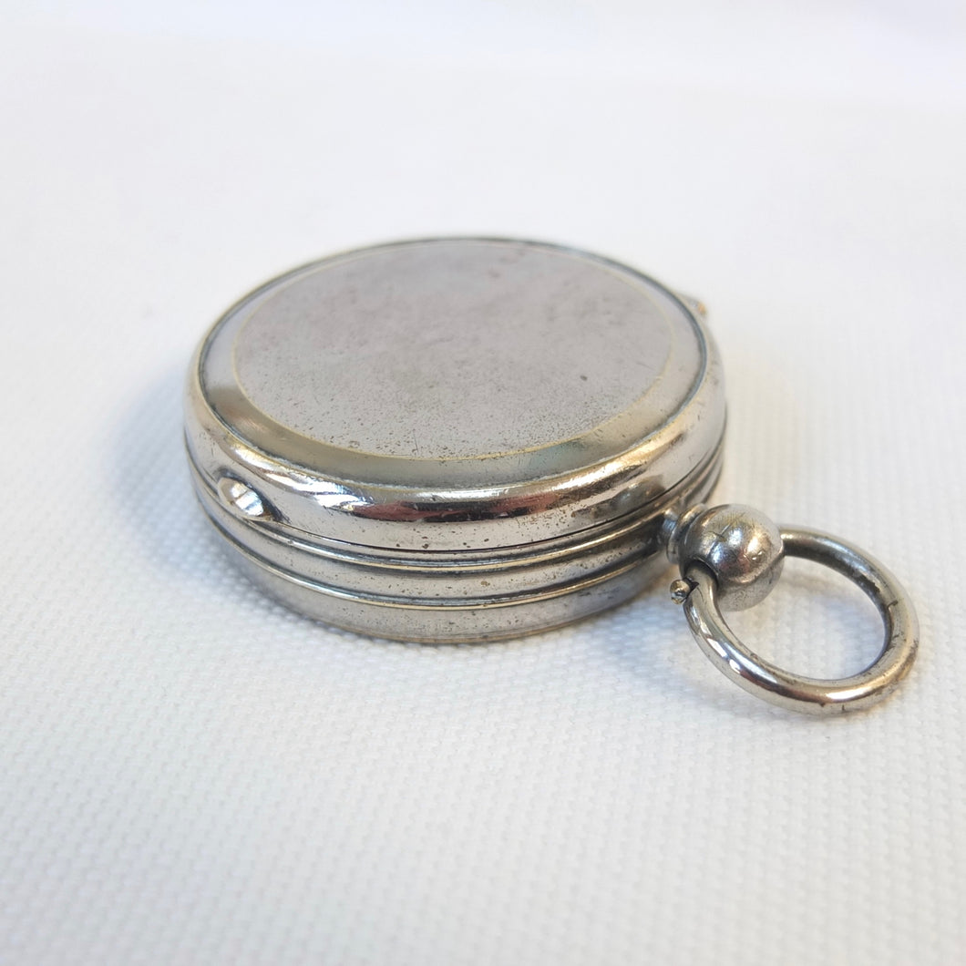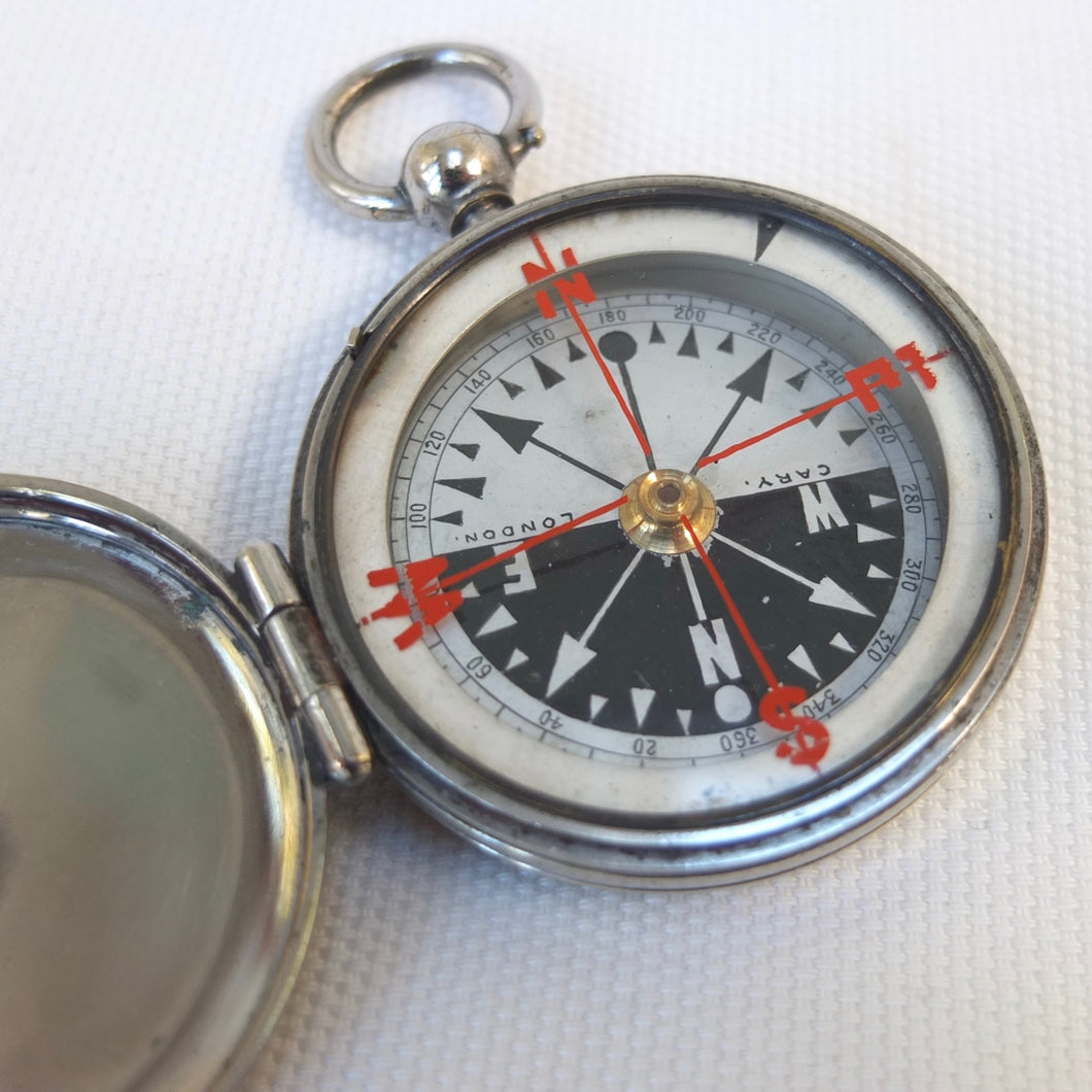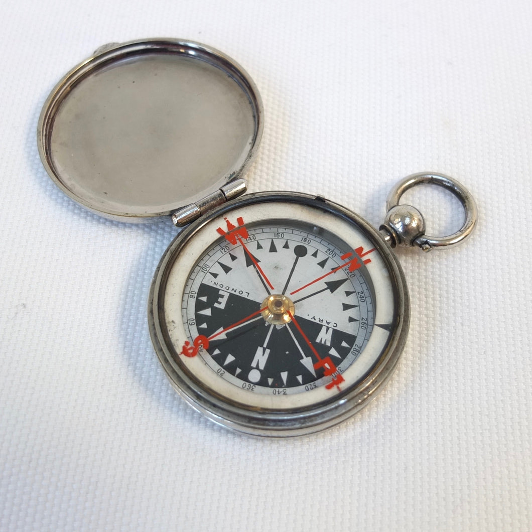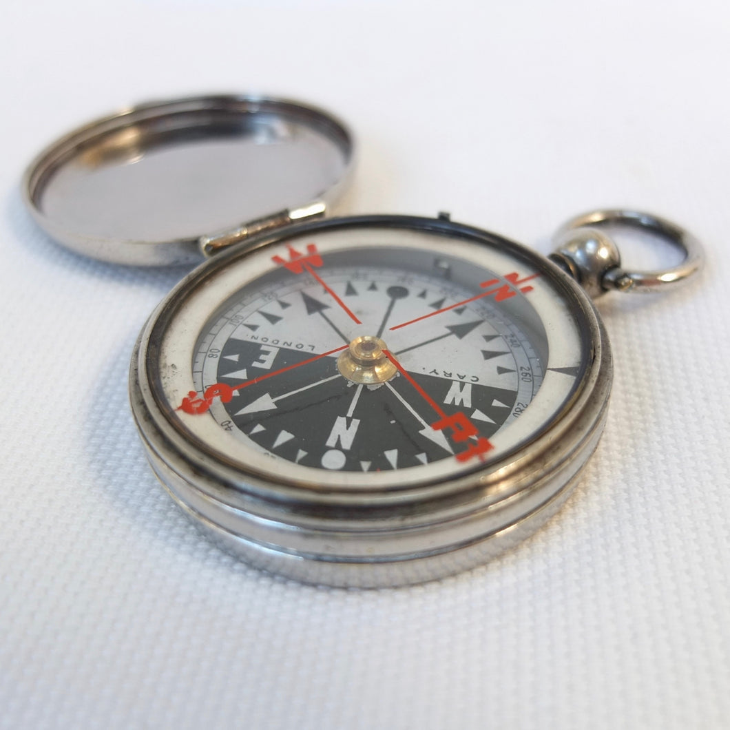 A Francis Barker & Son ‘RGS’ type pocket compass, dating from c.1900. The compass card is marked with the retailers details: ‘Cary, London’. The compass has a nickel plated brass hunter case, and an aluminium card with a jewelled pivot. The card is hand painted in black, with the four cardinal points painted in red on the underside of the glass. The compass has an automatic transit lock, operated when the lid is closed. This is a well documented Barker design, which was supplied unsigned by the maker to Cary and several other well known London retailers (including J. H. Steward). The retailer would then add their own details to the compass card. Cary supplied scientific instruments such as this to explorers and military officers, and the company provided the compasses used by Ernest Shackleton and his team during the celebrated 1907-1909 British Antarctic Expedition.