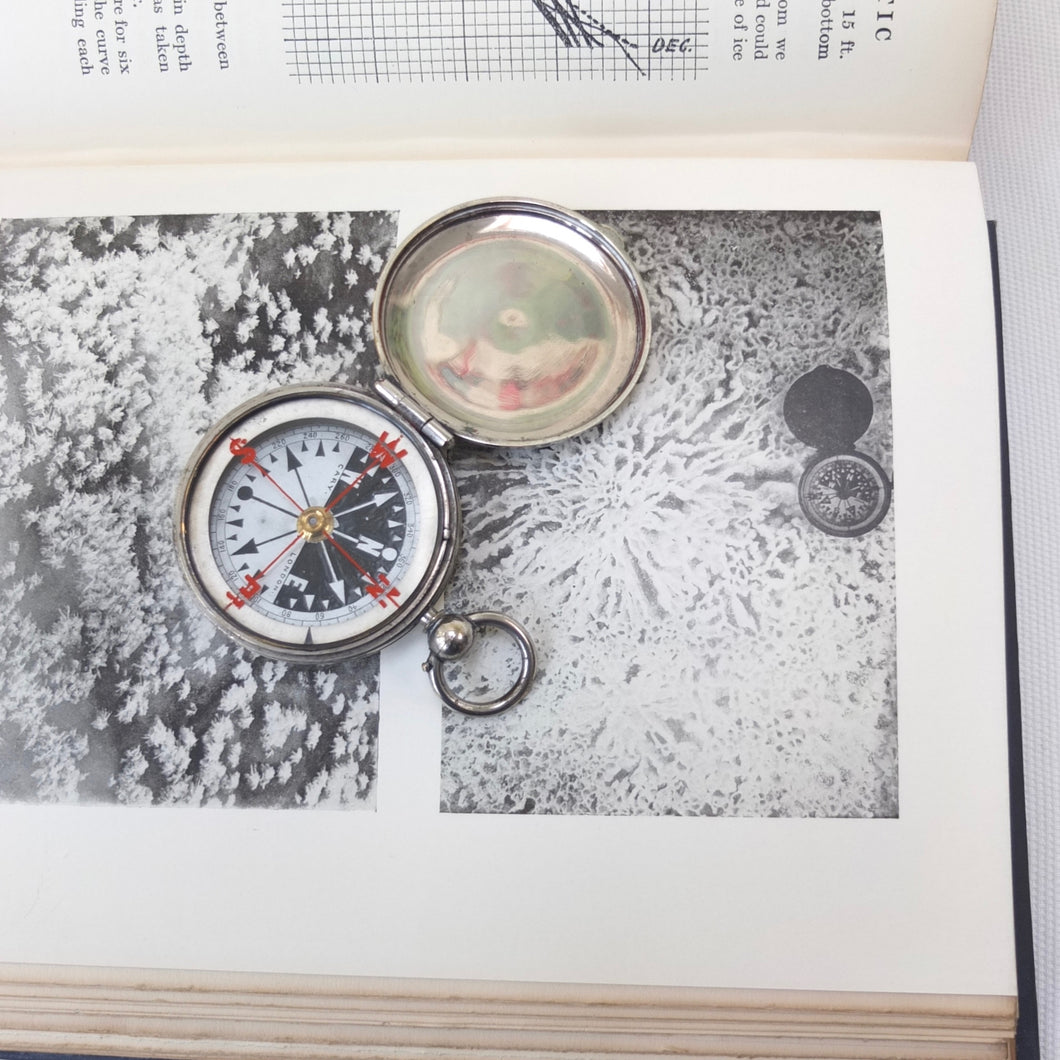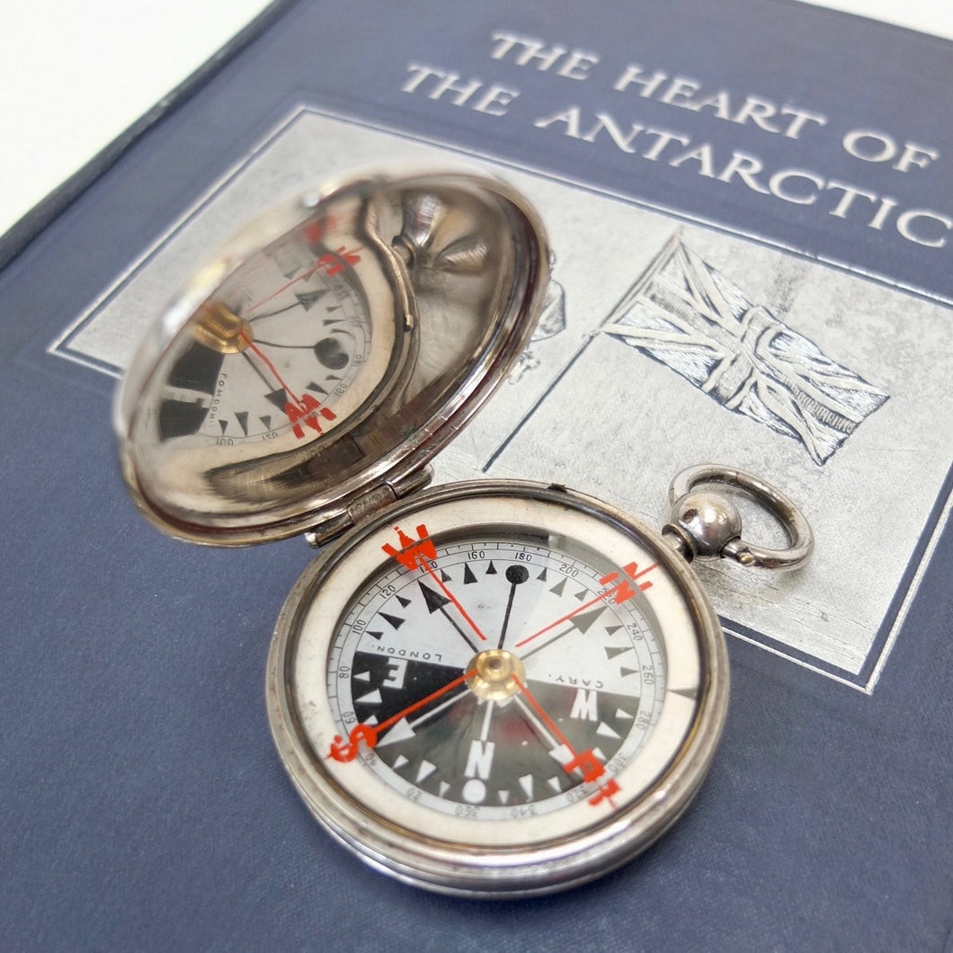 One of the Cary compasses used during the 1907-1909 expedition can be seen in a photographic plate facing p.342 of Volume Two of The Heart of the Antarctic, Shackleton’s classic account of the expedition (see photo). Shackleton took two Cary pocket compasses of this type with him on the expedition, one of which returned to the antarctic in 2008, carried by the explorer Henry Worsley, during the Shackleton Centenary Expedition.