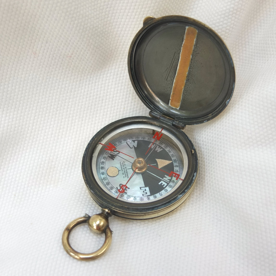 J. H. Steward Singer's Patent-type Military Compass, dating from c.1885 - 1910. This compass appeared in the 1893 edition of the J. H. Steward catalogue of Military Instruments: 'with half black and half white dial, and unmistakable luminous painted N. and S. and luminous direction line on lid, as supplied for the Egyptian Campaign'. The mother-of-pearl compass card is hand painted in the classic Singer's design, and signed by 'J. H. Steward, 406 Strand, London'. The compass has the four cardinal points marked in red on the underside of the glass. There is a triangular marker at the north point, a circular marker at the south point, and a sighting line inside the lid - all of these would originally have been luminous. The type of luminous paint used was most probably 'Balmain's Luminous Paint', a compound of calcium sulphide that was made luminous by exposure to sunlight or by burning a strip of magnesium ribbon near the compass card. It was patented in England by William Balmain in 1877, and was often used in compasses during the last quarter of the 19th century. The compass has a jewelled pivot, brass hunter case, and a transit lock operated when the lid is closed. The brass case would originally have had a 'bronzed' finish - this has worn away from the exterior, but is still present on the interior of the lid.