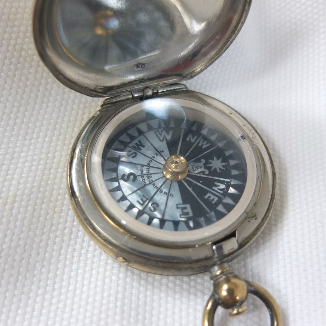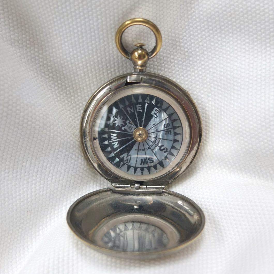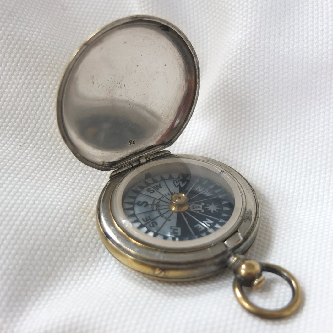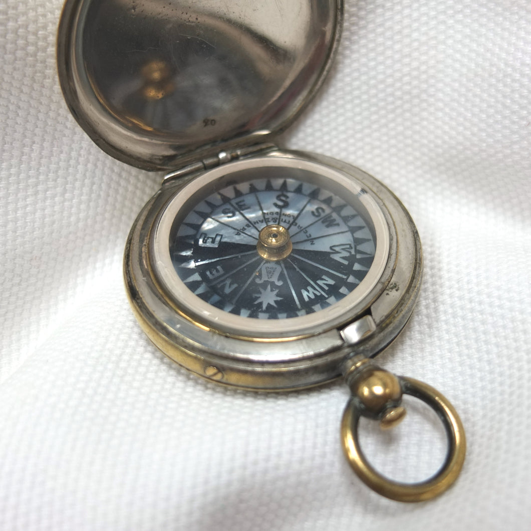 The compass has a mother of pearl card, jewelled pivot, slightly domed glass, and brass hunter case. The brass case would originally have had a nickel-plated finish - this has worn away from the exterior to reveal the brass underneath, but is still present on the interior of the lid. The glass is a high quality modern mineral glass replacement.
