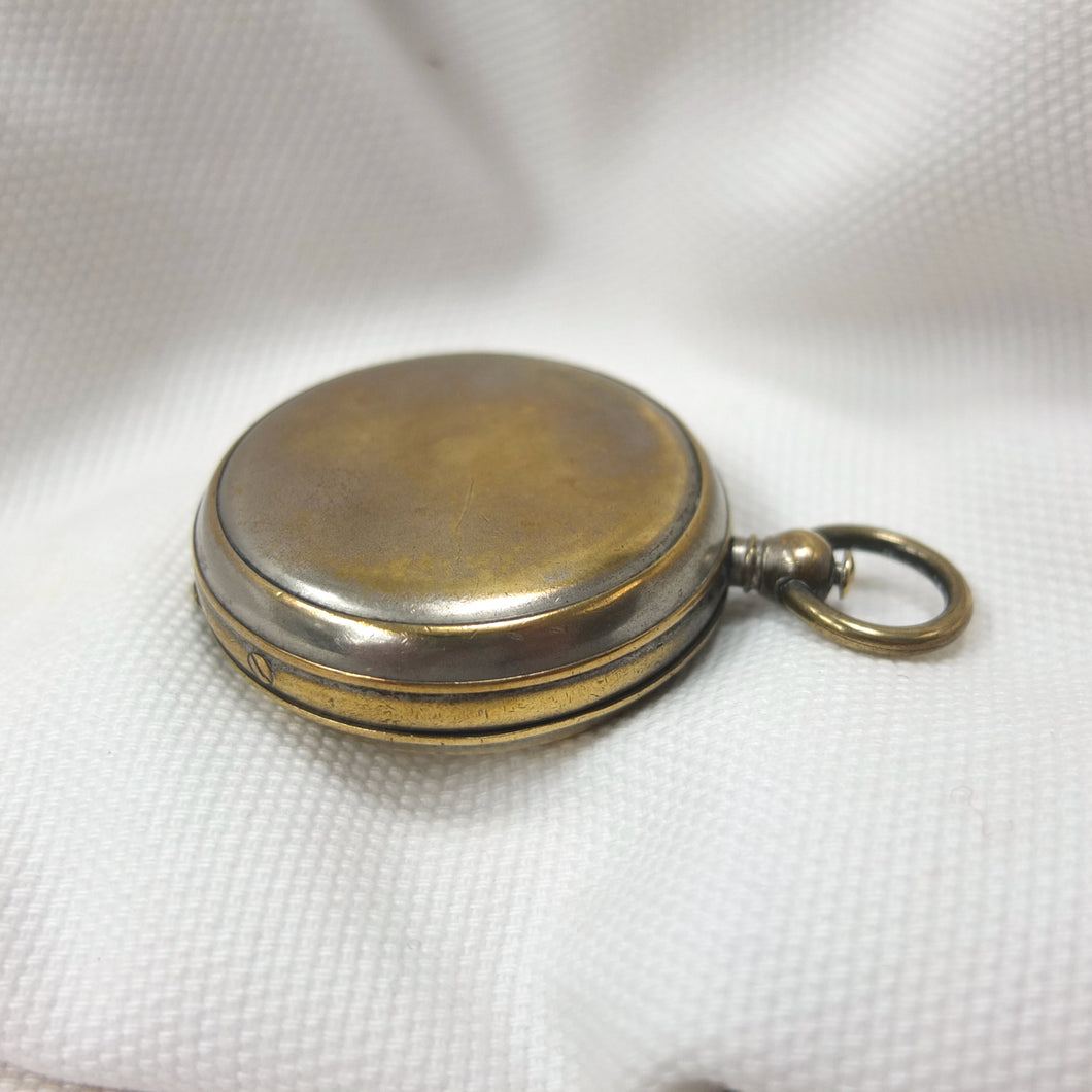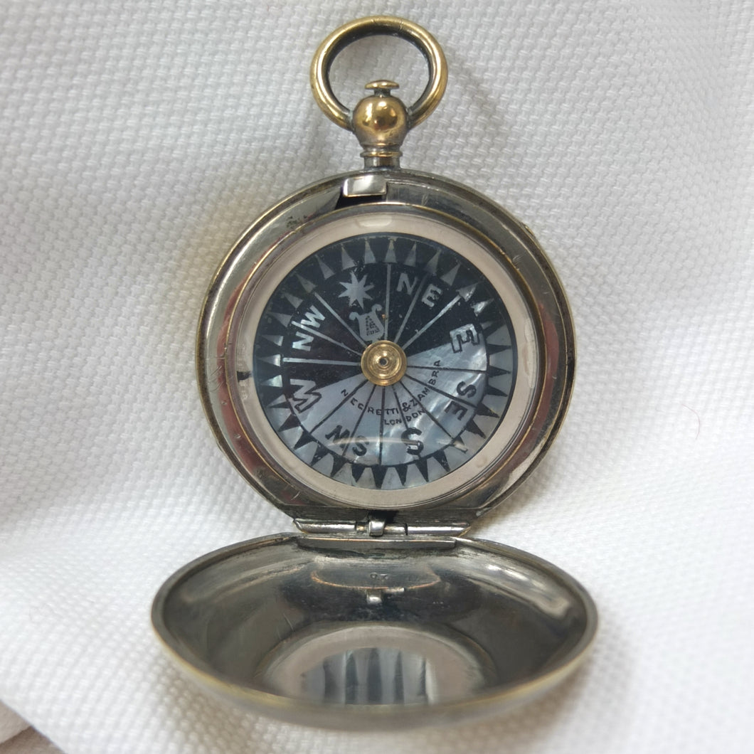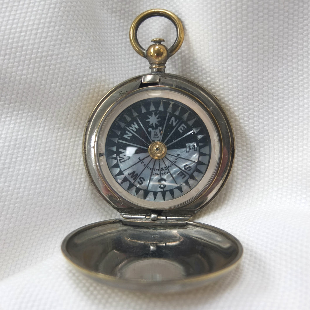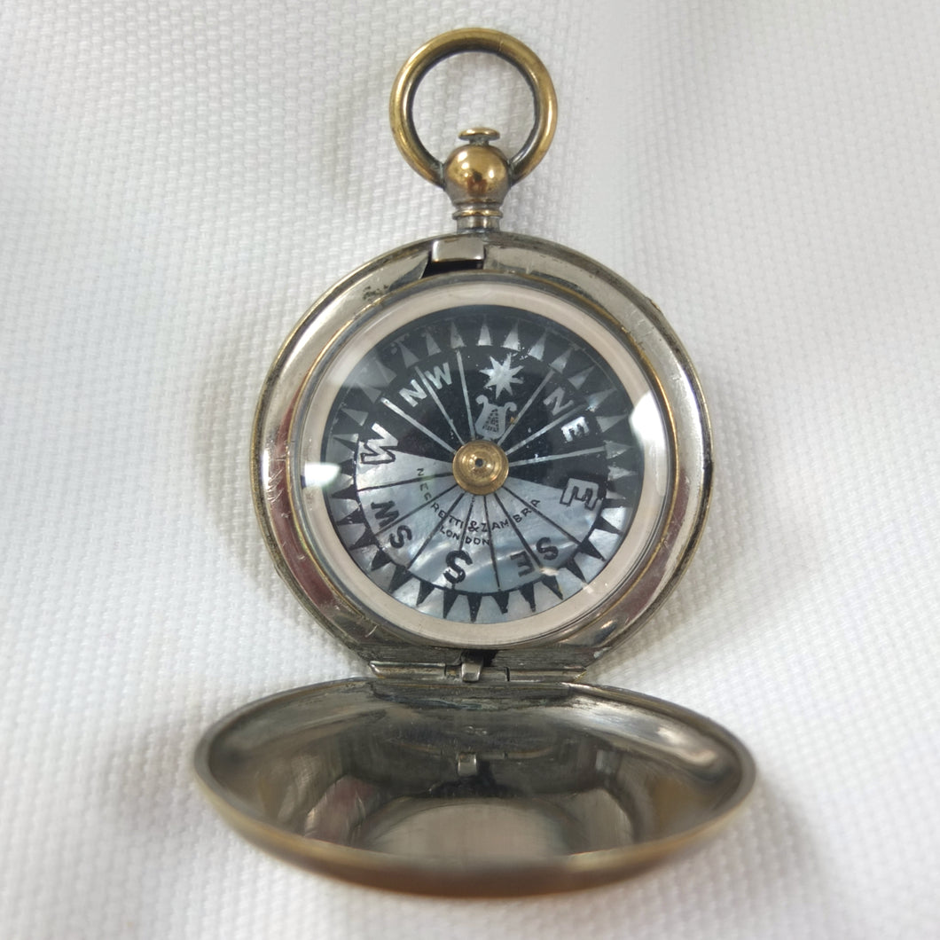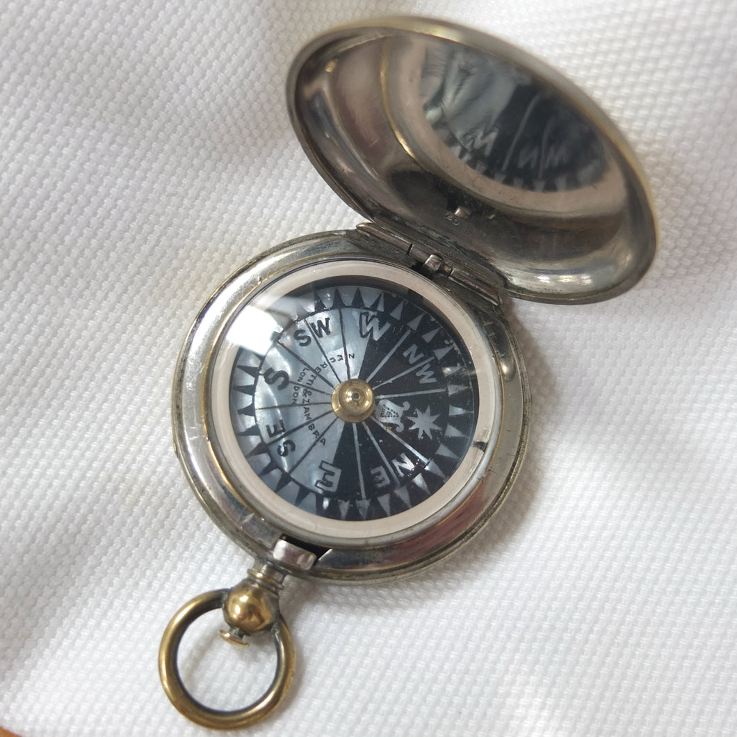The compass has a mother of pearl card, jewelled pivot, slightly domed glass, and brass hunter case. The brass case would originally have had a nickel-plated finish - this has worn away from the exterior to reveal the brass underneath, but is still present on the interior of the lid. The glass is a high quality modern mineral glass replacement.