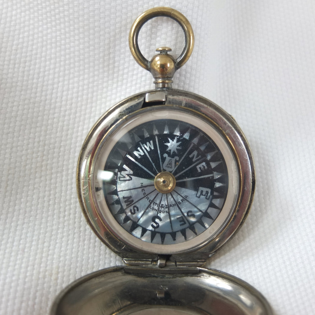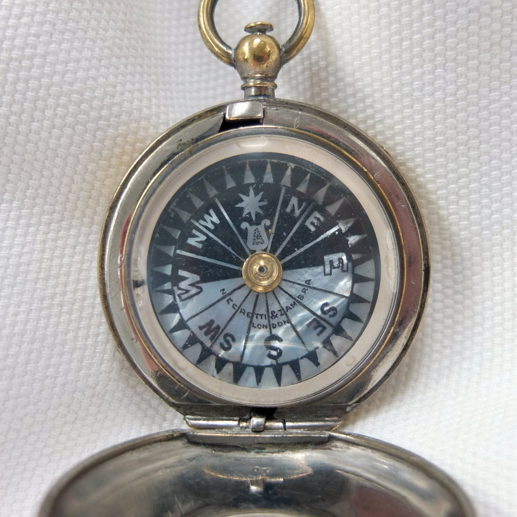 A Negretti & Zambra Singer's Patent-type Pocket Compass, dating from c.1890. The mother of pearl compass card is hand painted in the classic Singer's design, and signed by 'Negretti & Zambra, London'. This compass was made by Francis Barker for retail by Negretti & Zambra - there is a tiny version of the distinctive Barker 'Trade Mark London' maker's mark within the lyre just below the star-shaped North marker. Barker's compasses were usually supplied unsigned to retailers who then signed and sold them on as their own products. It is quite rare to find one with both the maker's and retailers markings.