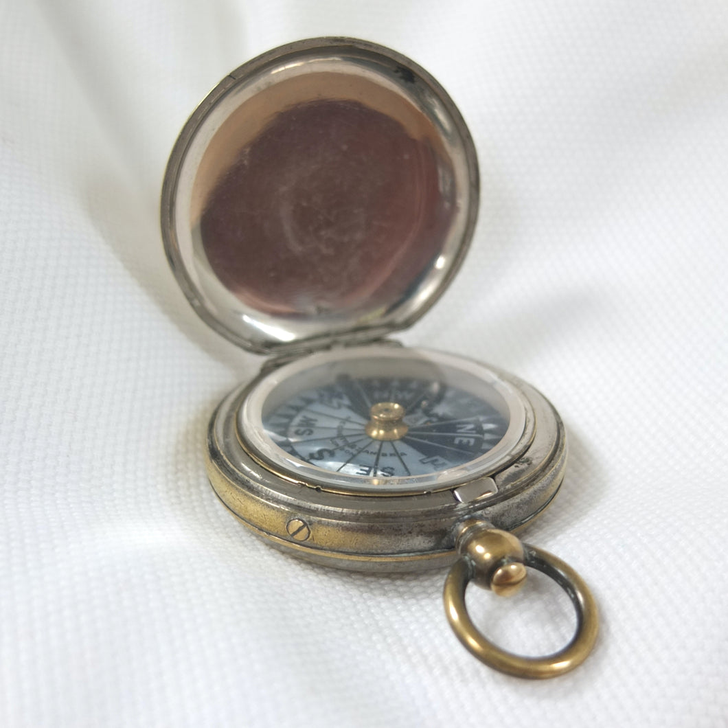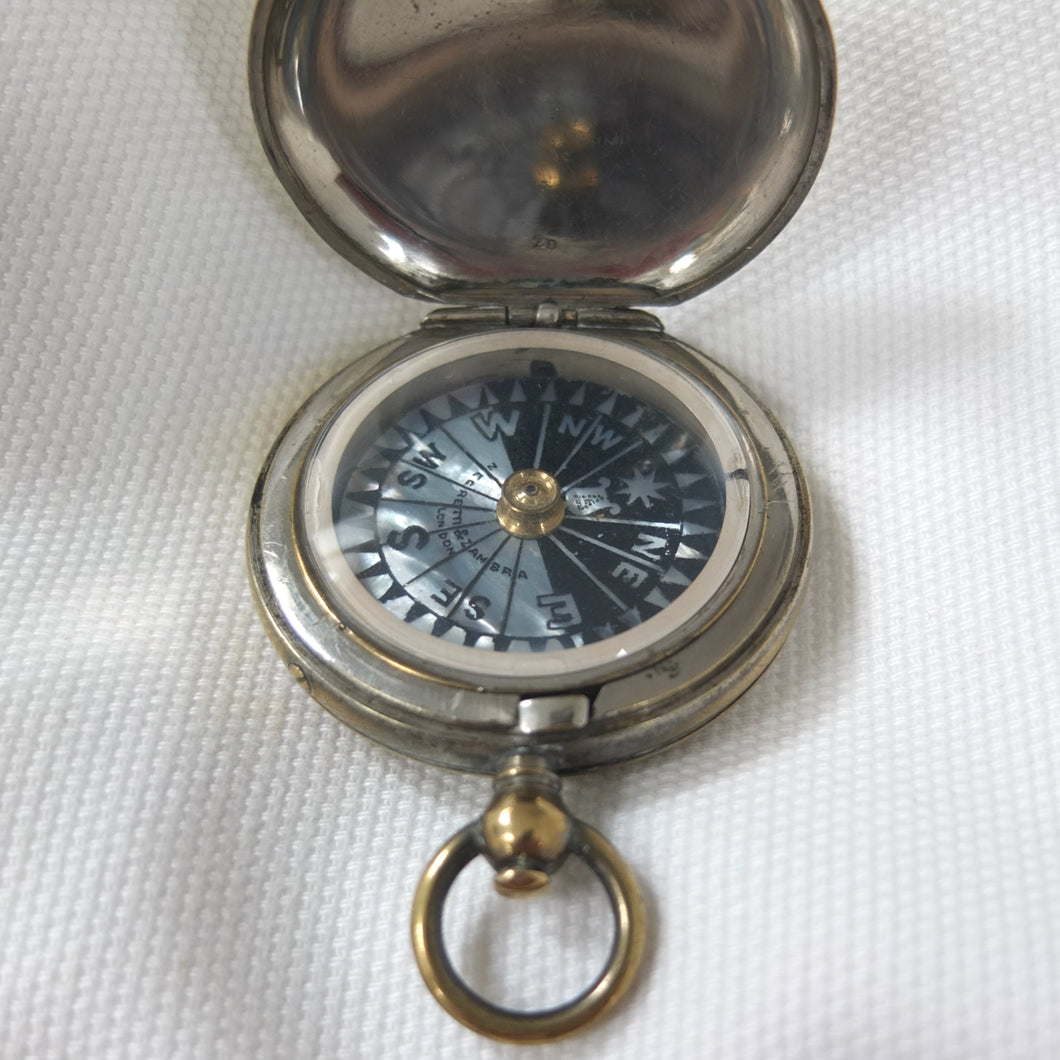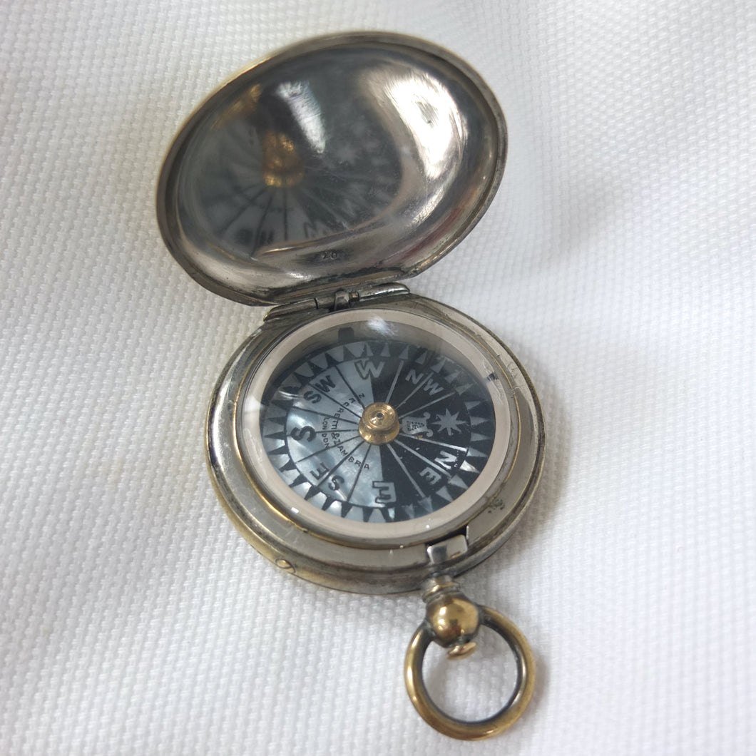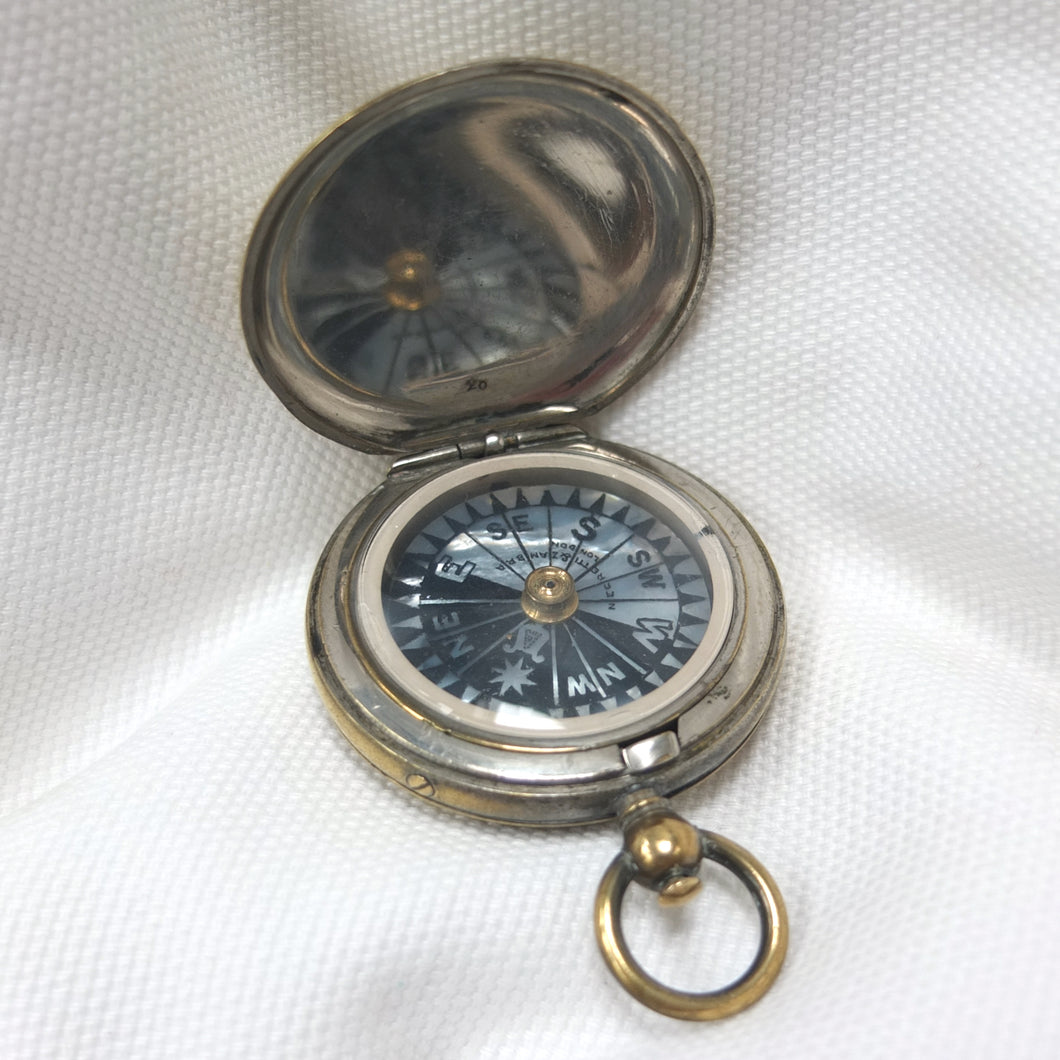 In very good condition and good working order. The compass finds North well. The mother of pearl compass card is in very good condition. The glass is a slightly domed mineral glass replacement. The brass case is in good condition, with most of the original nickel plating worn away from the exterior.