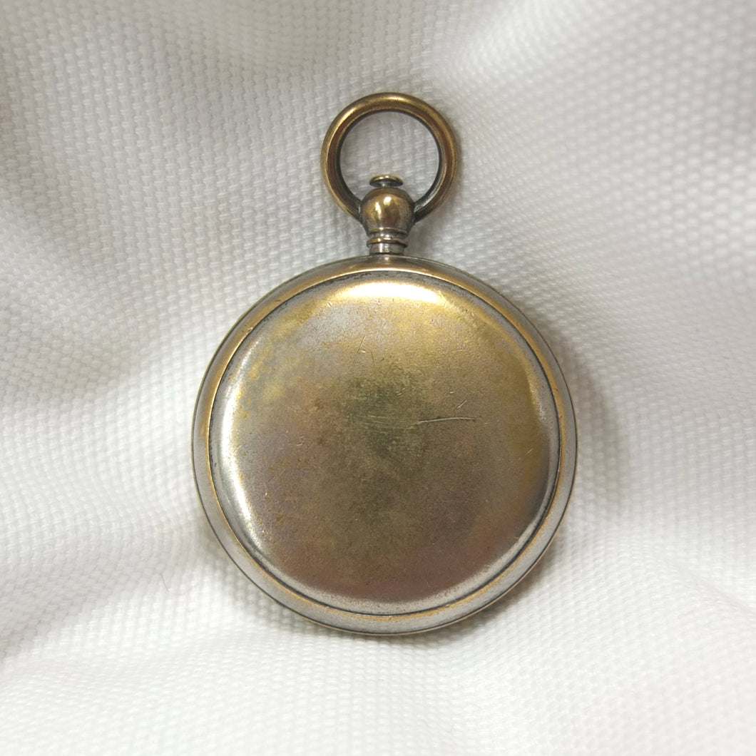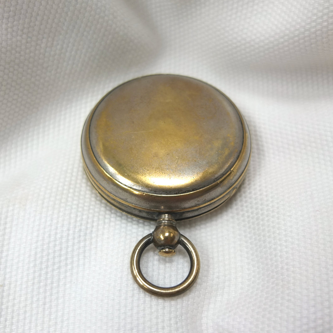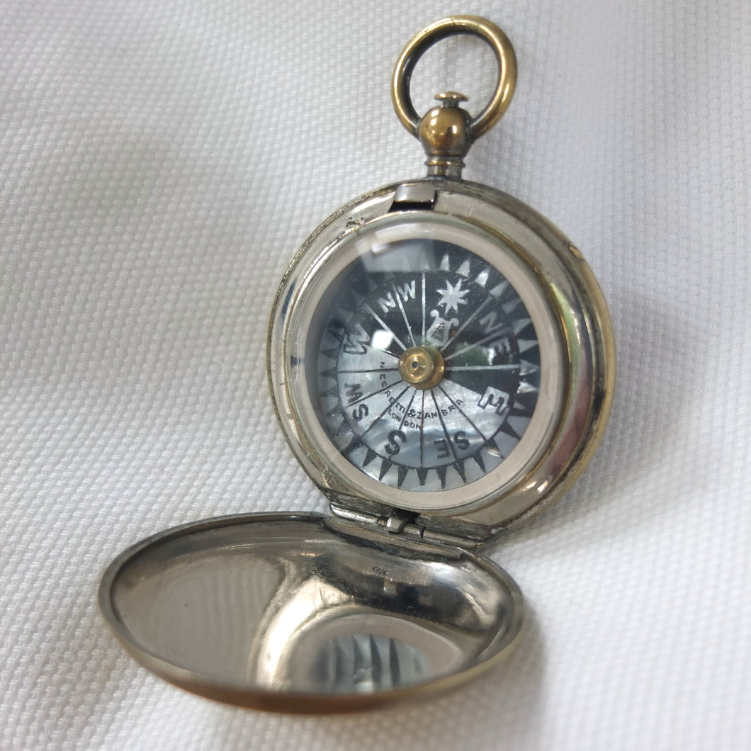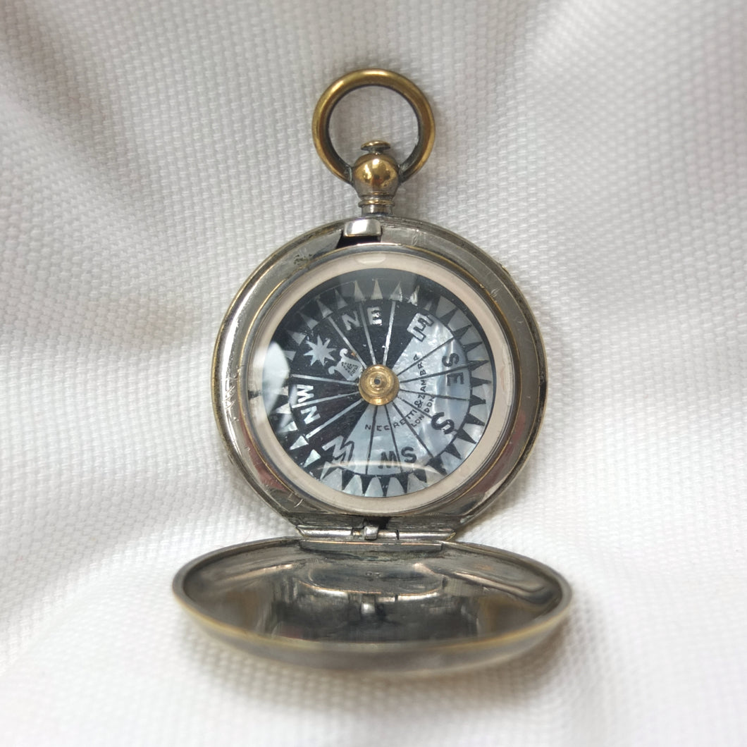 In very good condition and good working order. The compass finds North well. The mother of pearl compass card is in very good condition. The glass is a slightly domed mineral glass replacement. The brass case is in good condition, with most of the original nickel plating worn away from the exterior.