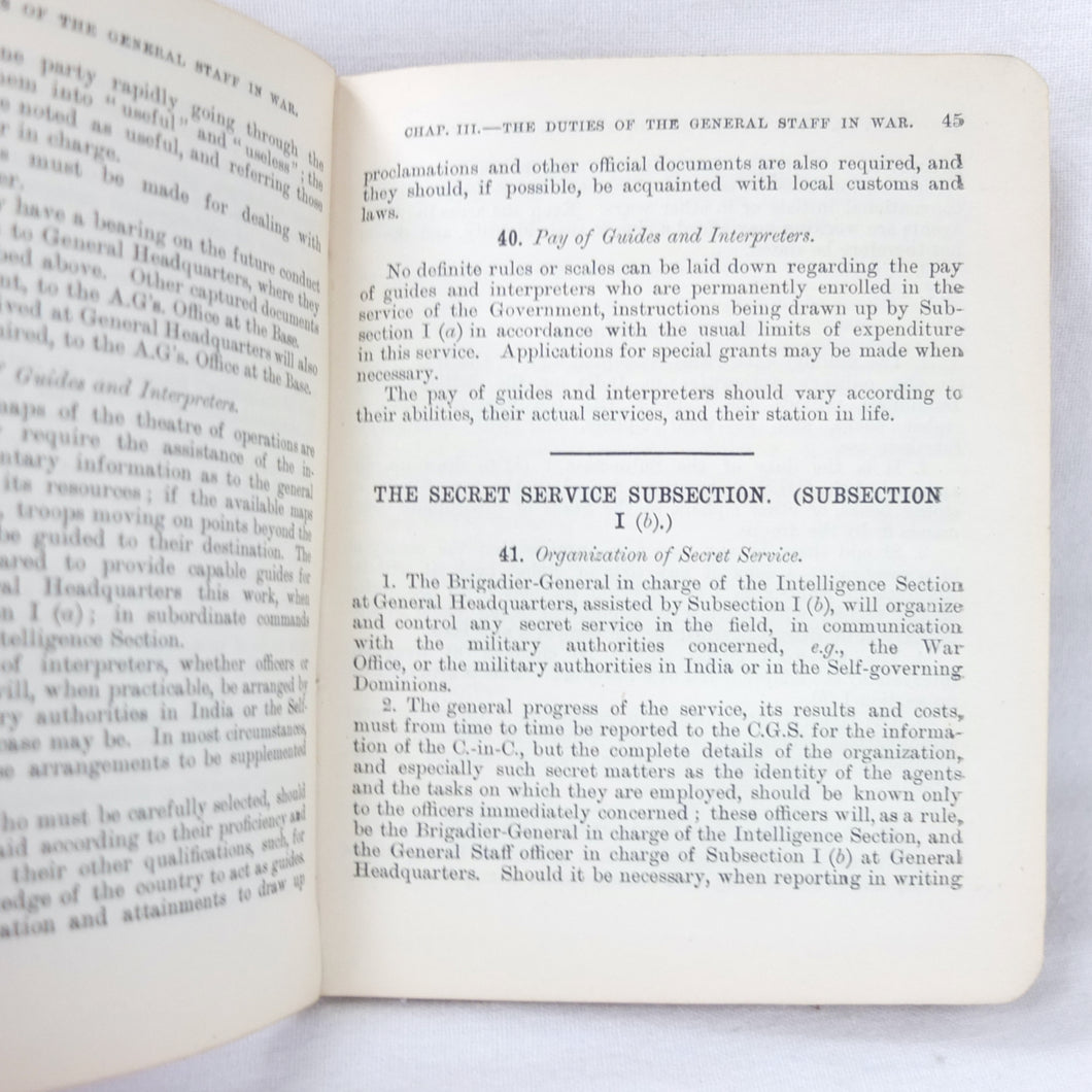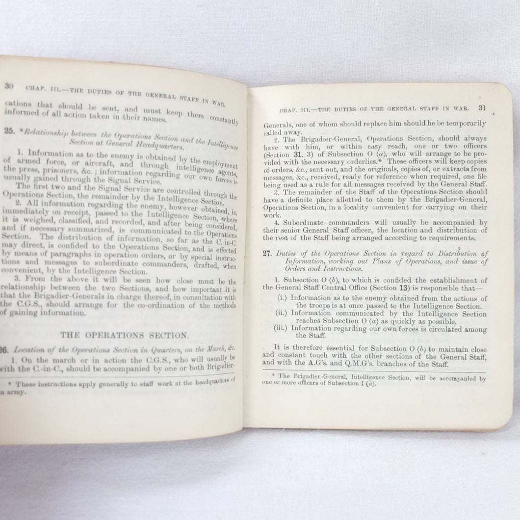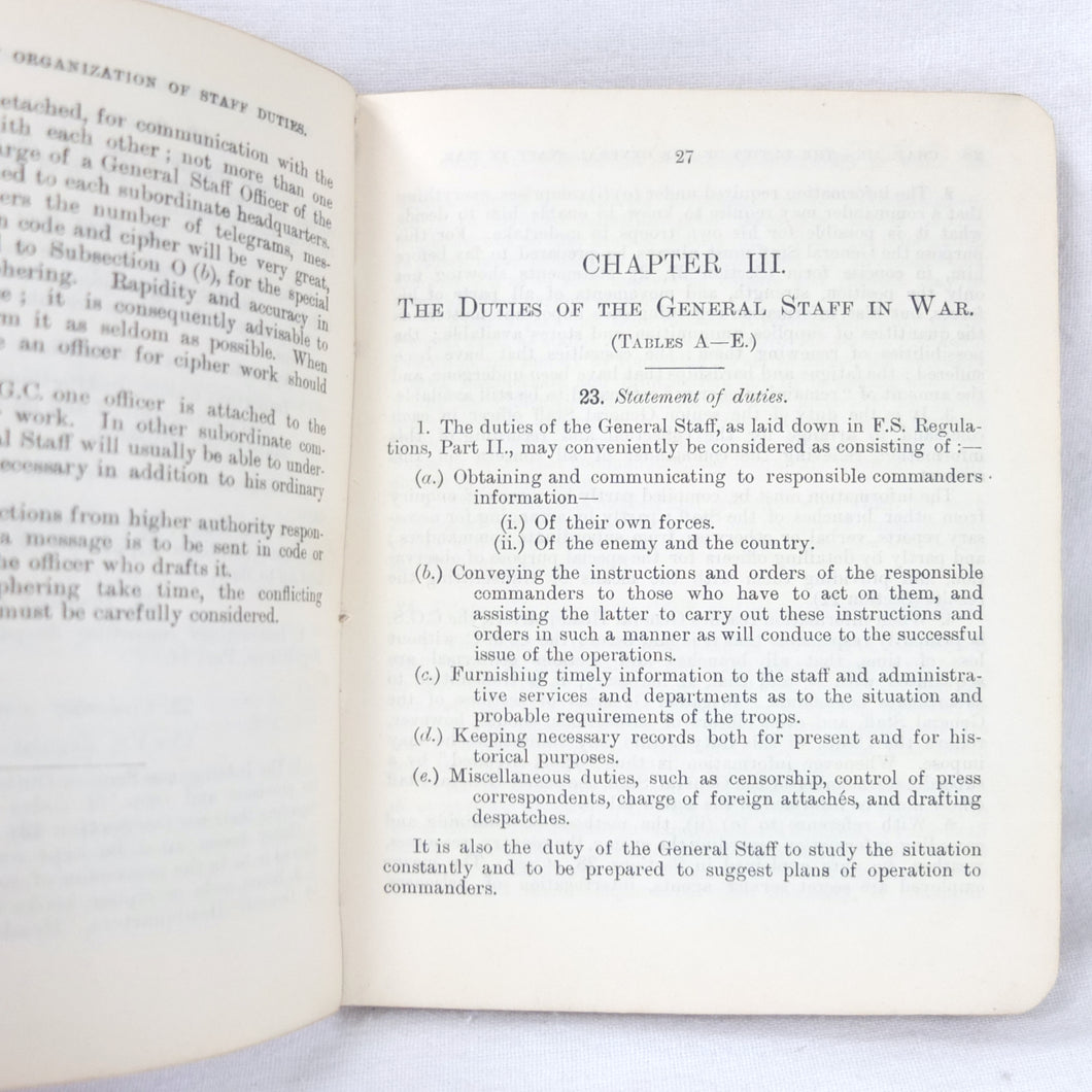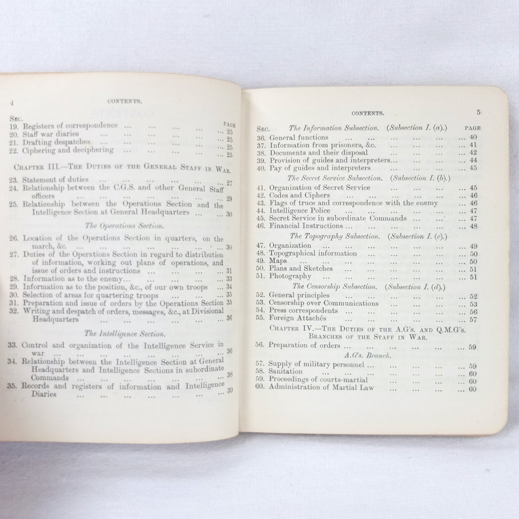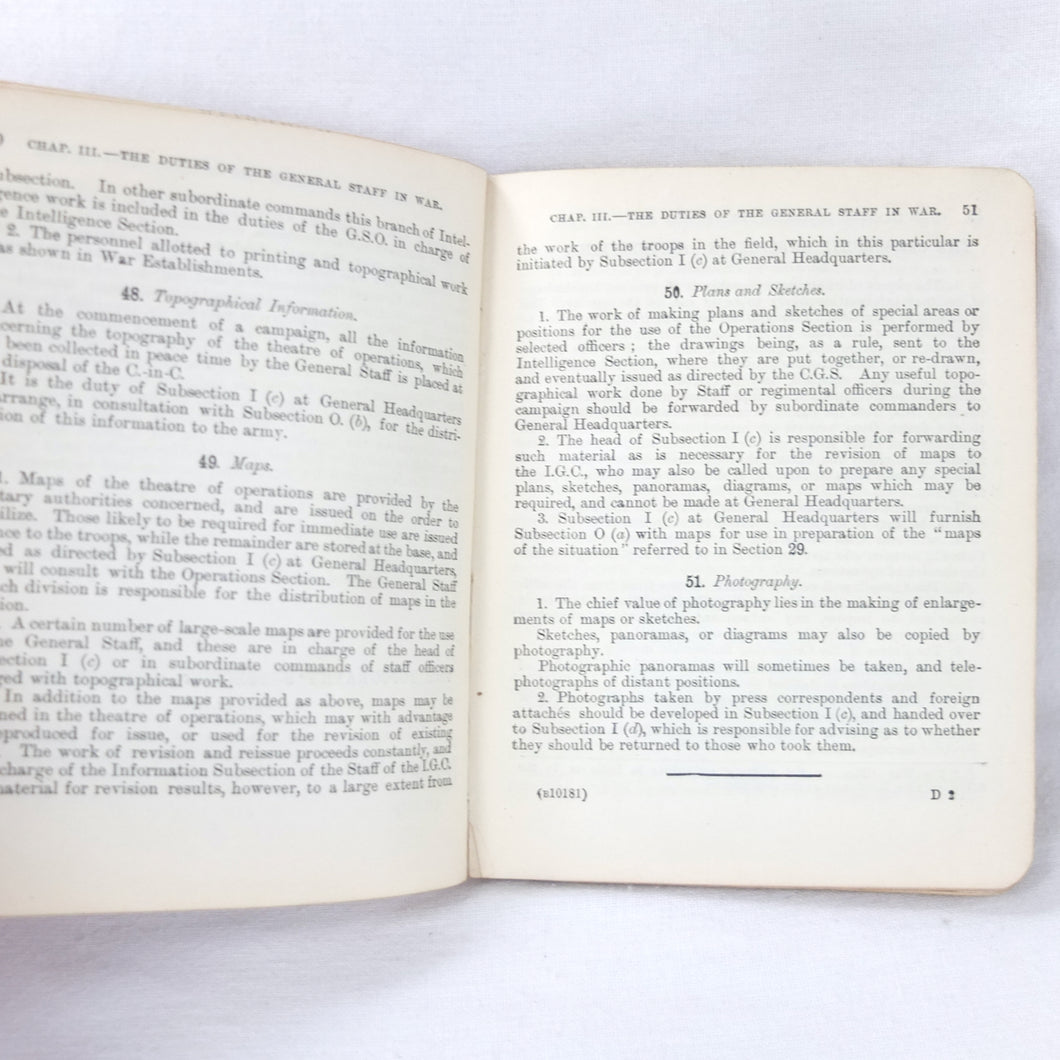Staff Manual-War includes details of the General Principles of Guidance of Staff Officers, covering subjects such as: duties of Staff Officers, duties of the Staff in war, operations of the Intelligence Section, information about the enemy, troop movements, relations between GHQ and the Intelligence Section, war diaries, information from prisoners, organization of the Secret Service, codes and ciphers, flags of truce, censorship, relations with the Press, maps, plans and sketches, topography, photography, Court Martial, transport, ammunition and equipment, Staff Duties in Brigades, etc. The maual is illustrated with fold-out charts.