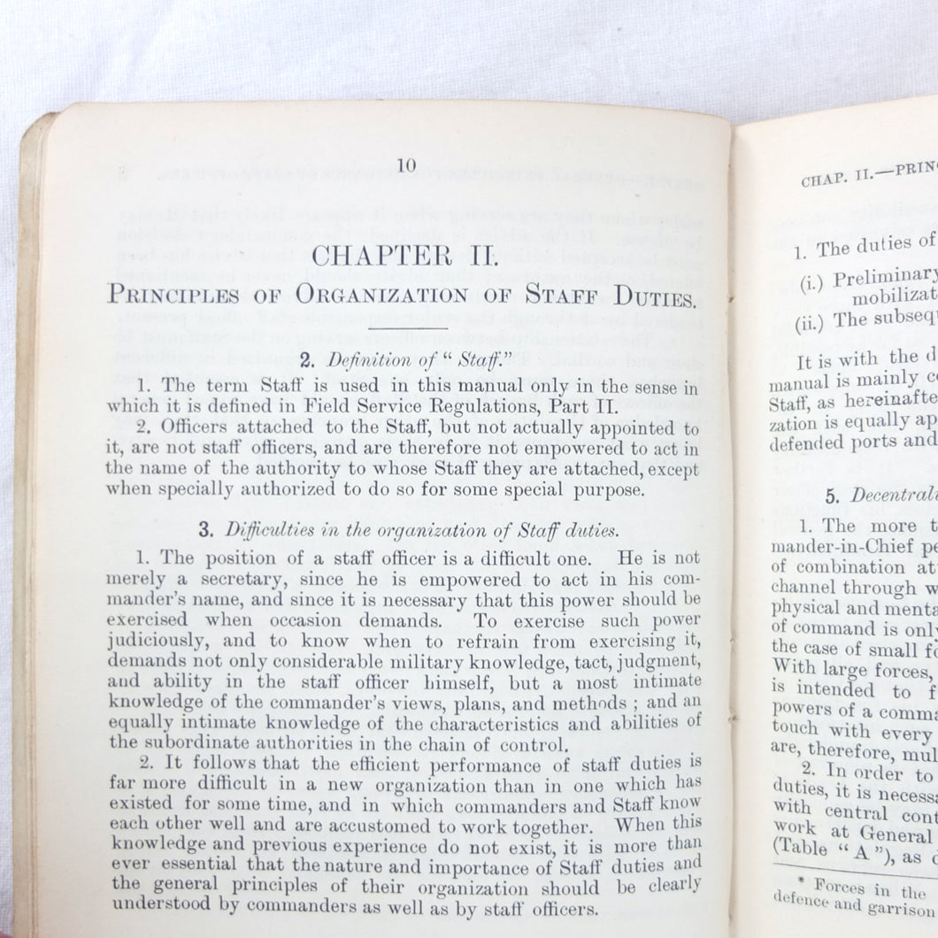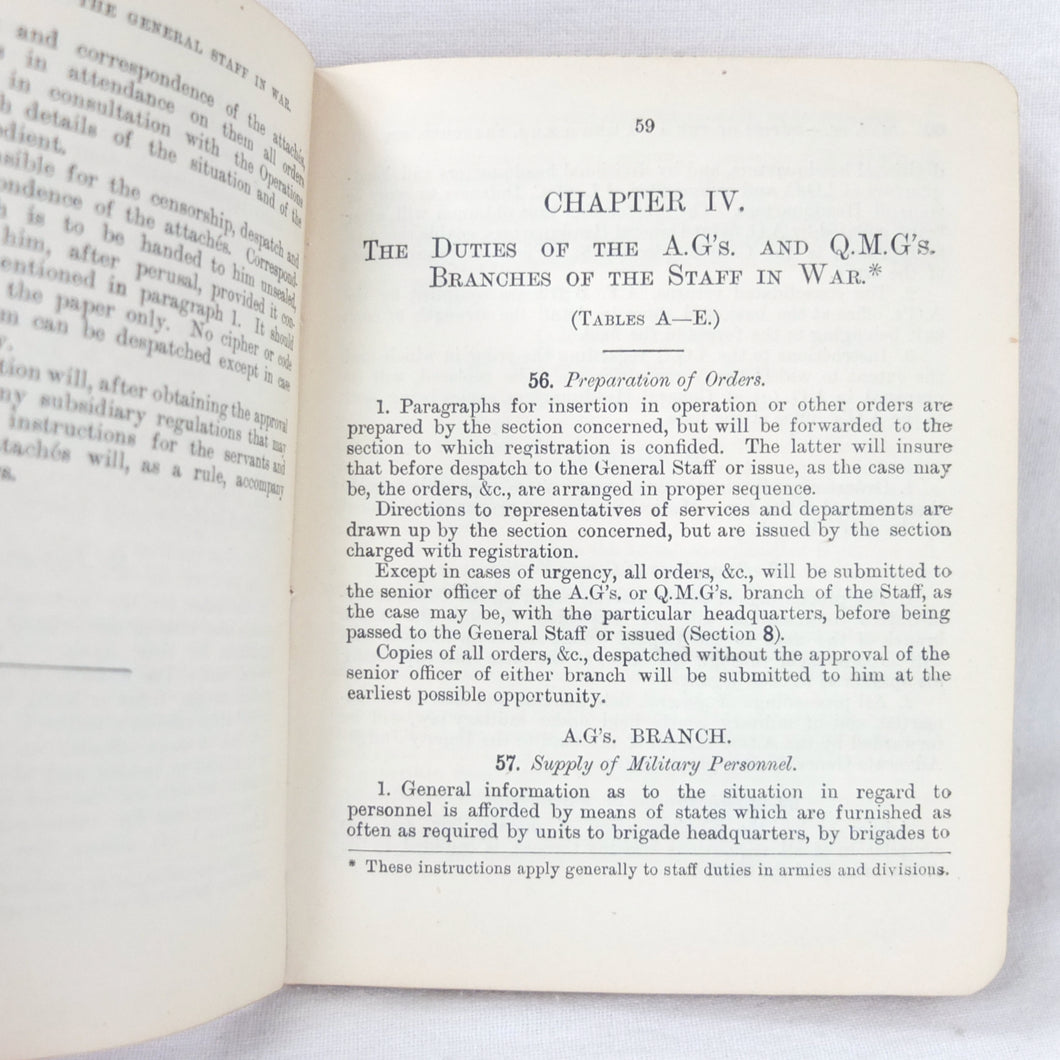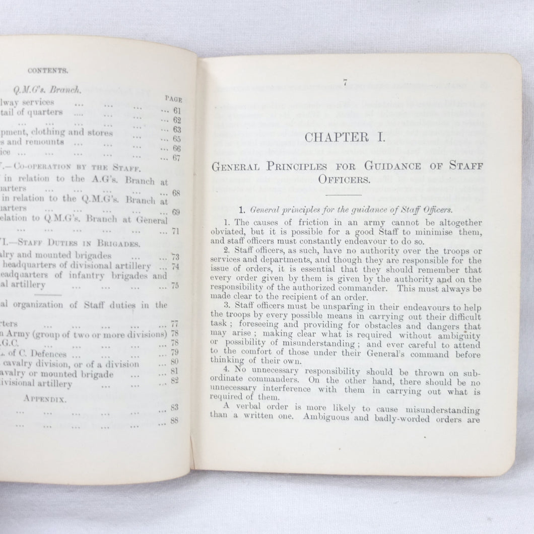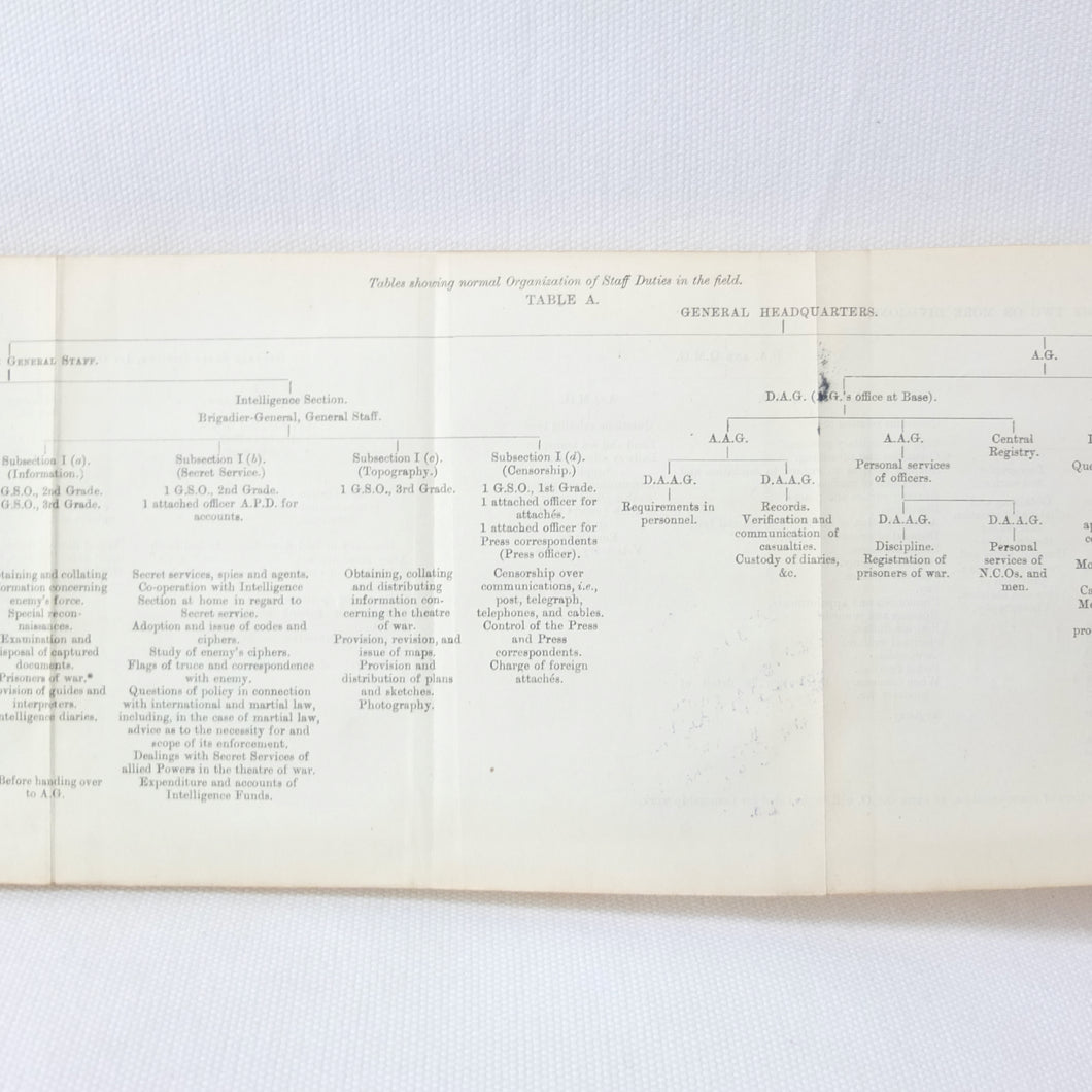 Staff Manual-War includes details of the General Principles of Guidance of Staff Officers, covering subjects such as: duties of Staff Officers, duties of the Staff in war, operations of the Intelligence Section, information about the enemy, troop movements, relations between GHQ and the Intelligence Section, war diaries, information from prisoners, organization of the Secret Service, codes and ciphers, flags of truce, censorship, relations with the Press, maps, plans and sketches, topography, photography, Court Martial, transport, ammunition and equipment, Staff Duties in Brigades, etc. The maual is illustrated with fold-out charts.