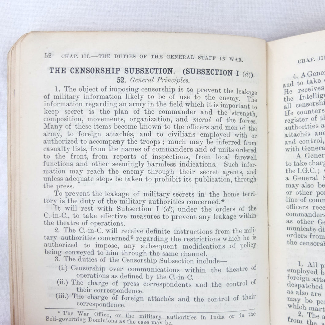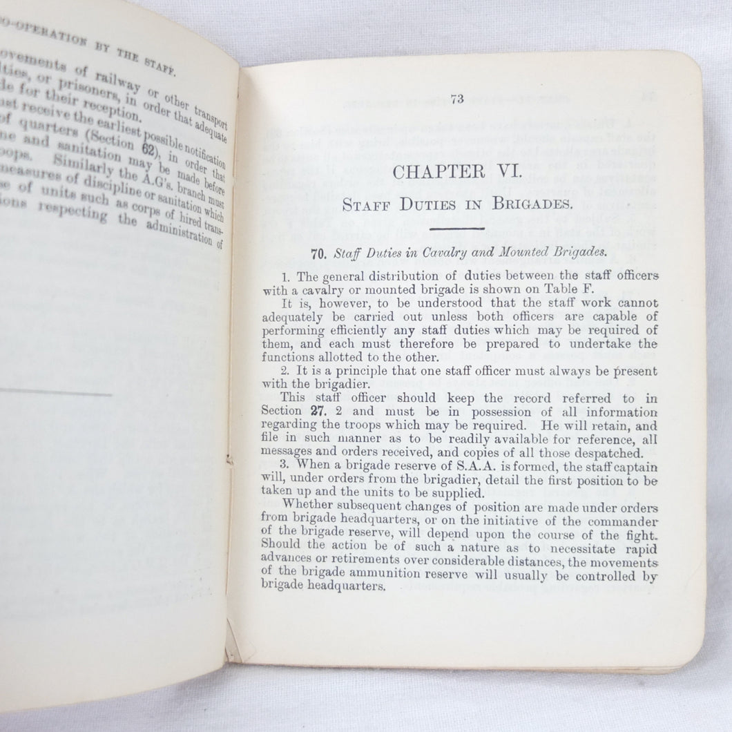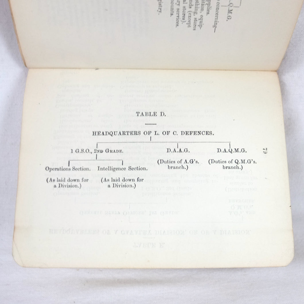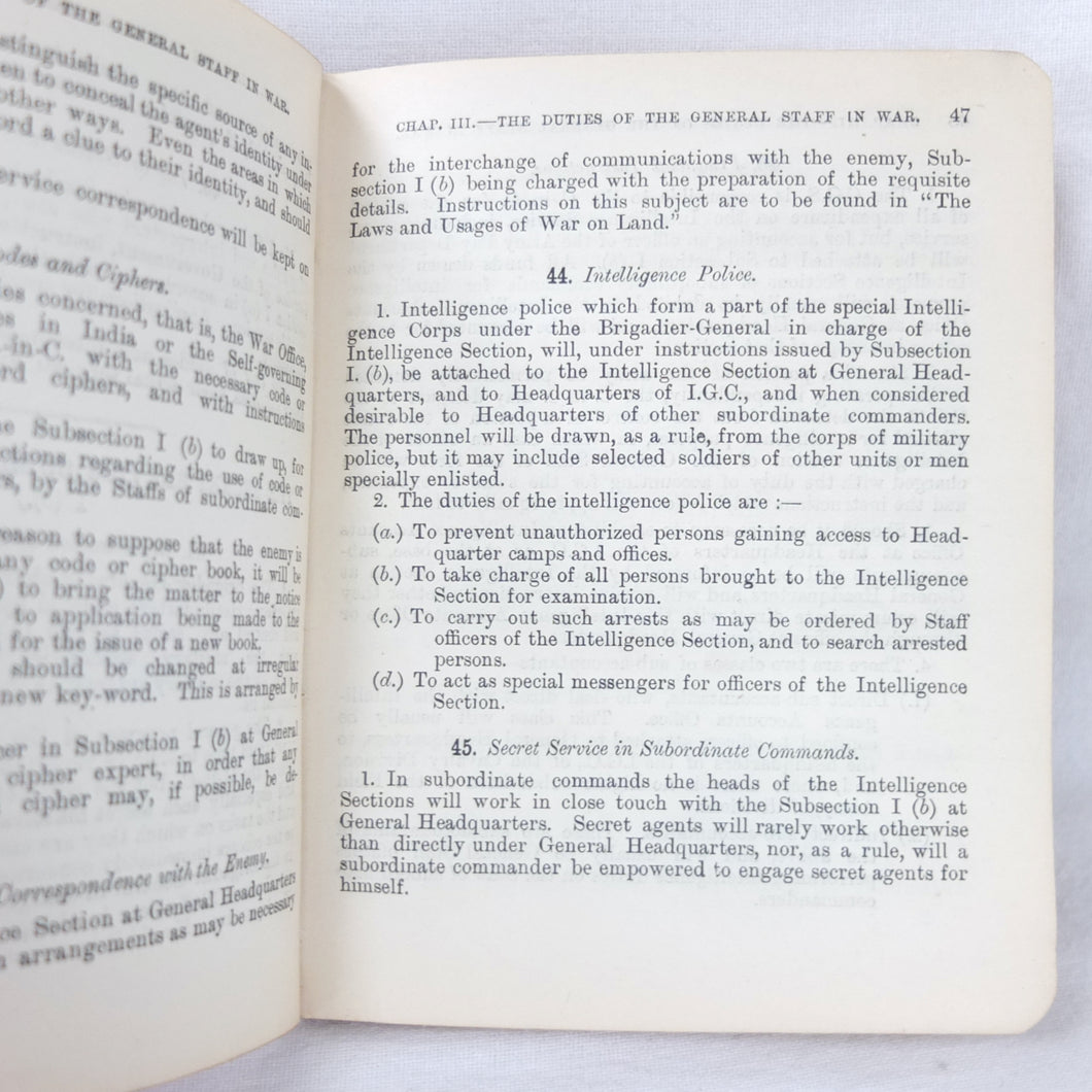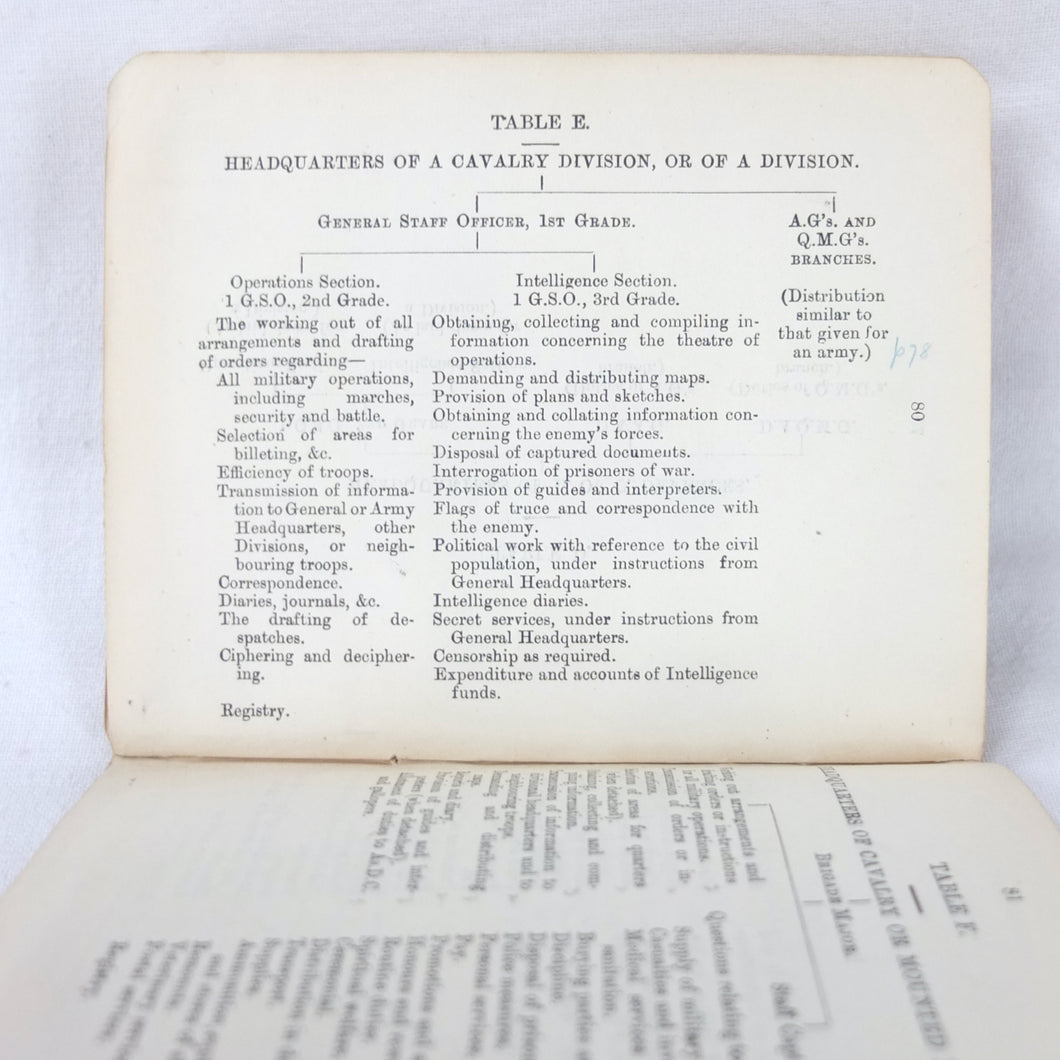 Staff Manual-War includes details of the General Principles of Guidance of Staff Officers, covering subjects such as: duties of Staff Officers, duties of the Staff in war, operations of the Intelligence Section, information about the enemy, troop movements, relations between GHQ and the Intelligence Section, war diaries, information from prisoners, organization of the Secret Service, codes and ciphers, flags of truce, censorship, relations with the Press, maps, plans and sketches, topography, photography, Court Martial, transport, ammunition and equipment, Staff Duties in Brigades, etc. The maual is illustrated with fold-out charts.