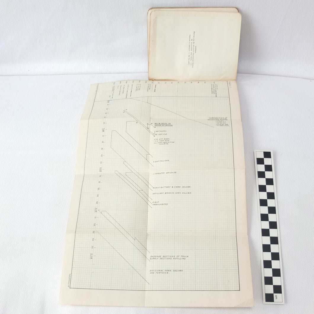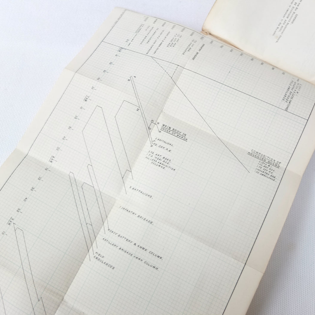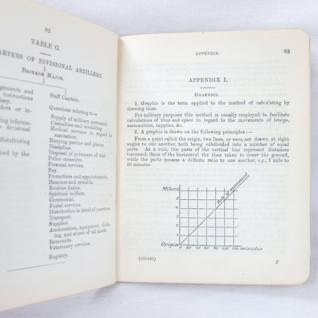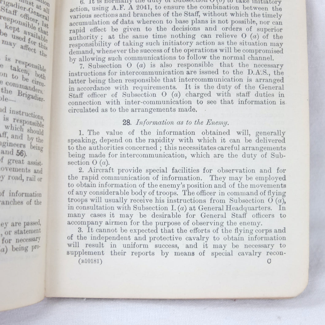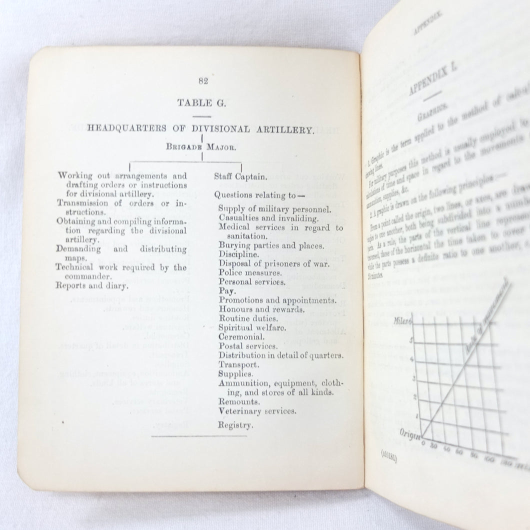 Staff Manual-War includes details of the General Principles of Guidance of Staff Officers, covering subjects such as: duties of Staff Officers, duties of the Staff in war, operations of the Intelligence Section, information about the enemy, troop movements, relations between GHQ and the Intelligence Section, war diaries, information from prisoners, organization of the Secret Service, codes and ciphers, flags of truce, censorship, relations with the Press, maps, plans and sketches, topography, photography, Court Martial, transport, ammunition and equipment, Staff Duties in Brigades, etc. The maual is illustrated with fold-out charts.