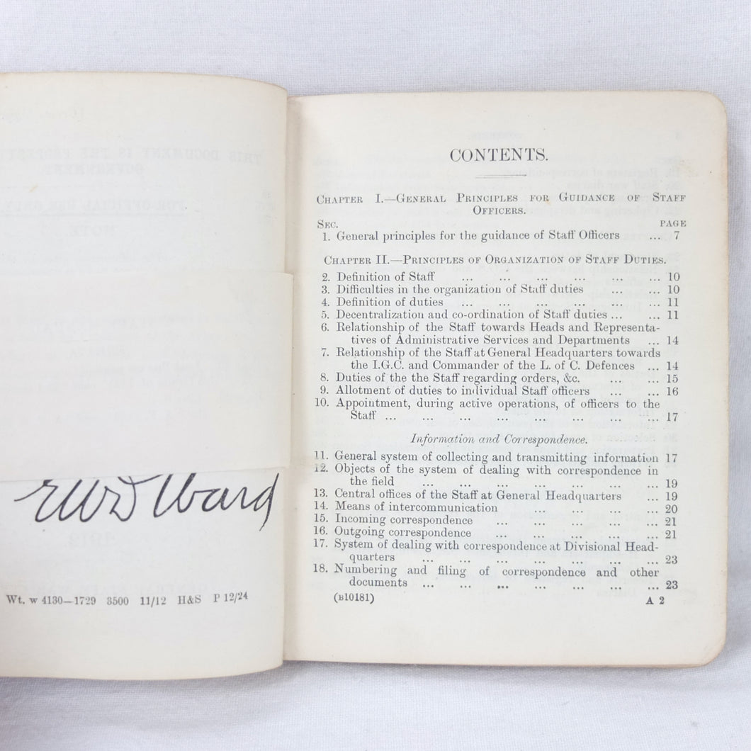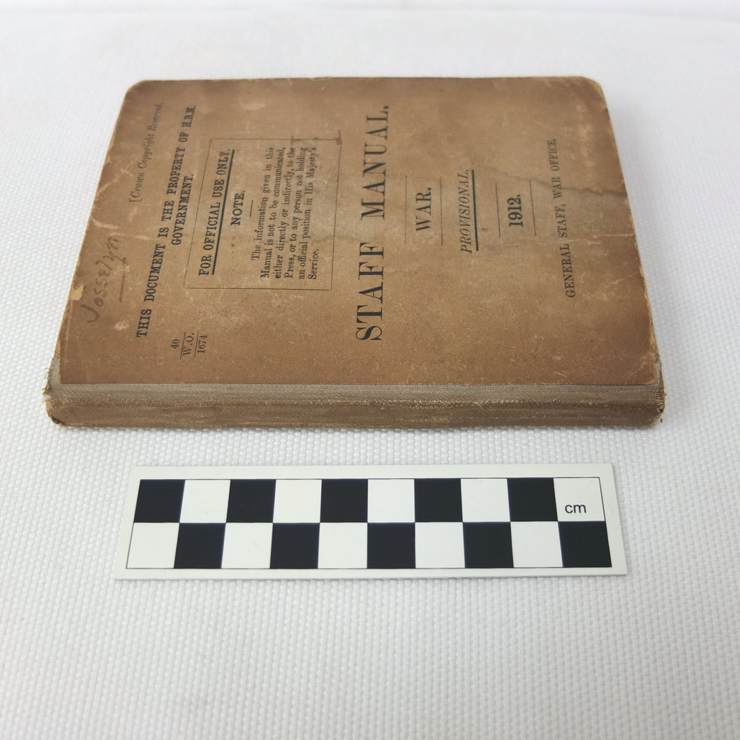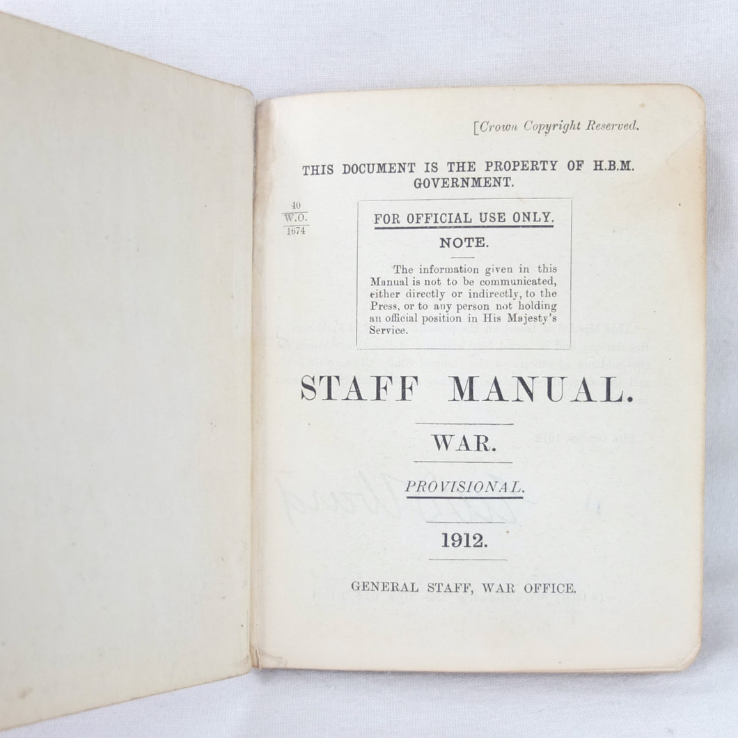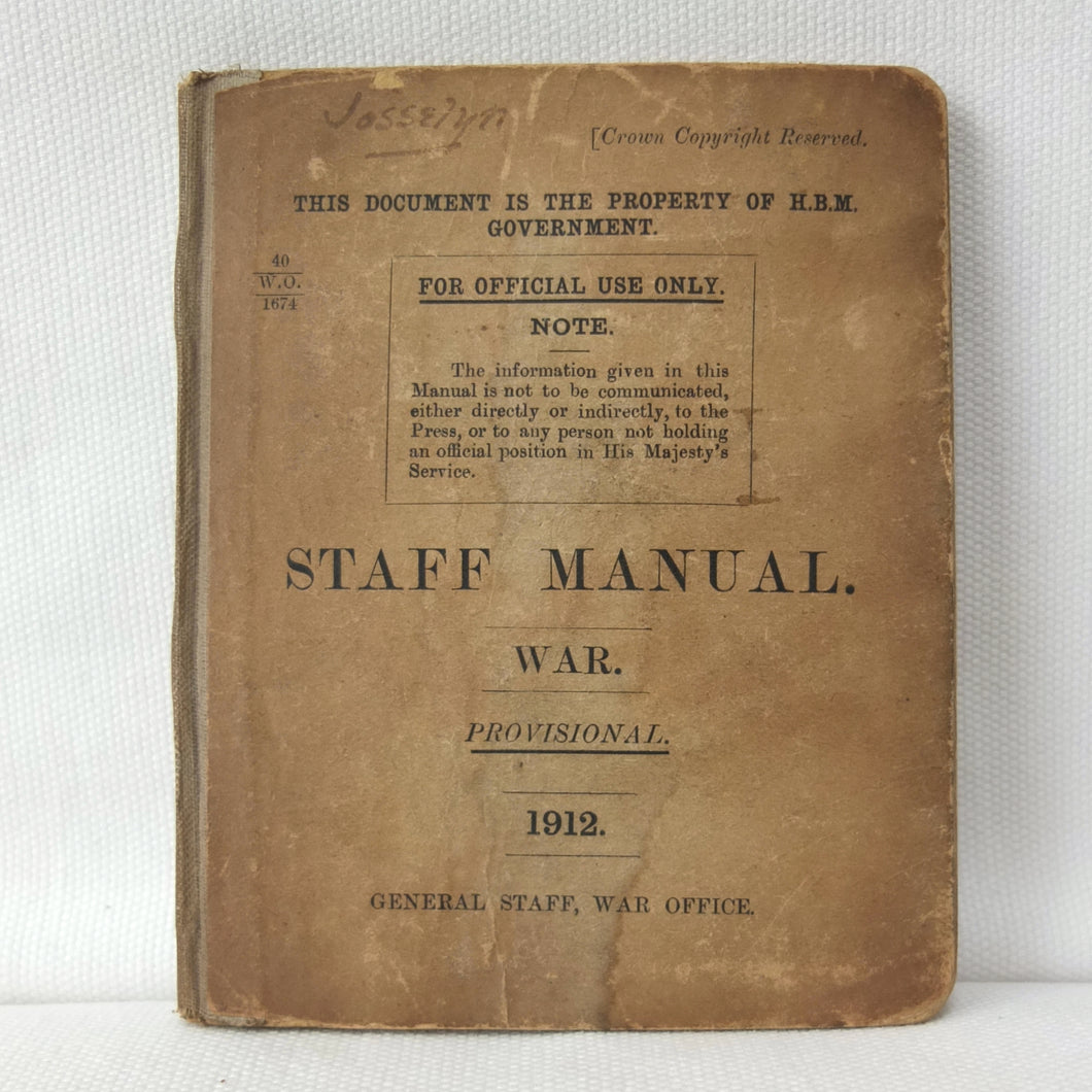 A rare 1912 edition of Staff Manual - War, a British Army officer's manual, published by the War Office just before the First World War. The book is signed on the front cover by its original owner, ‘Josselyn’. There was only one officer of that name in the British Army in August 1914, Captain J. Josselyn, 6th Battalion, Suffolk Regiment (late Major, Madras Artillery).