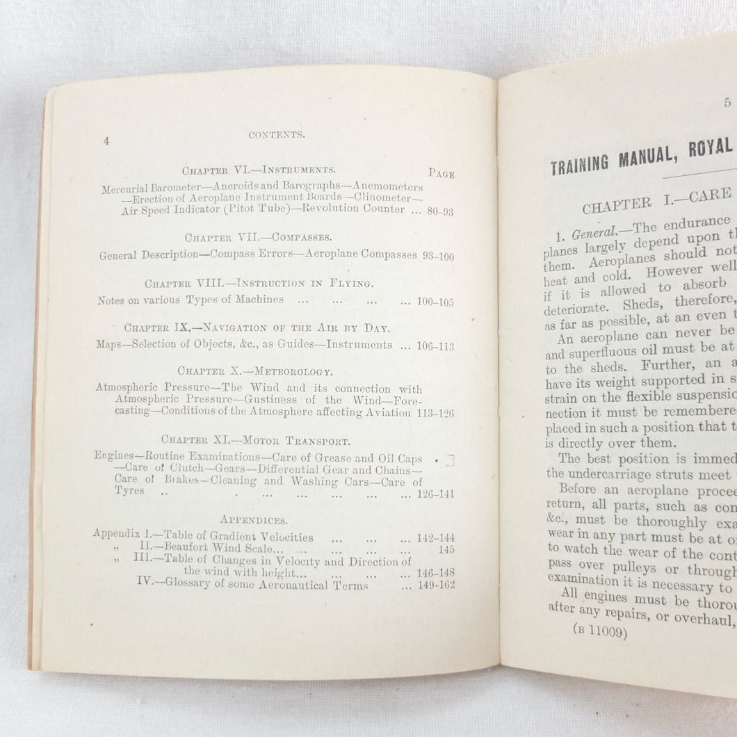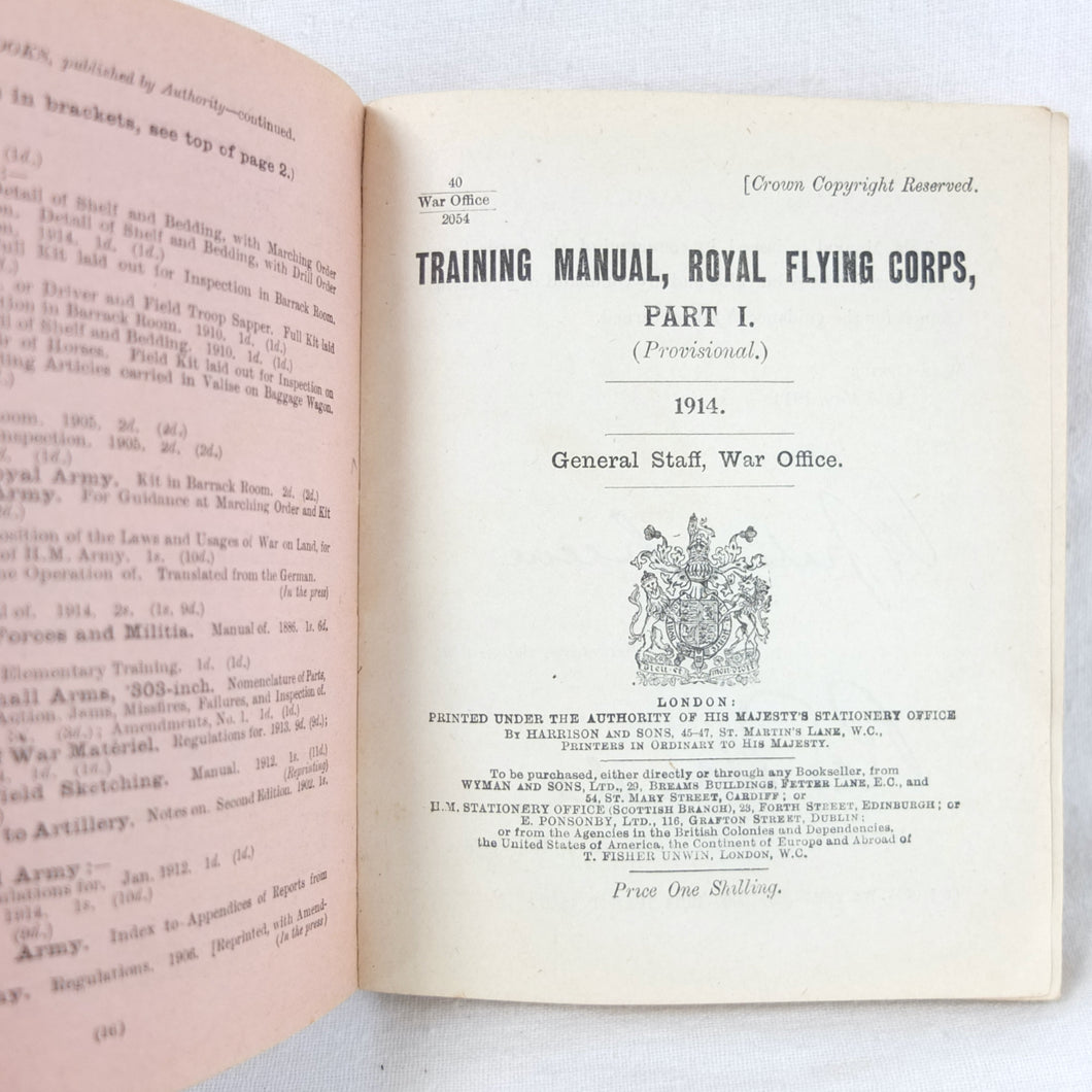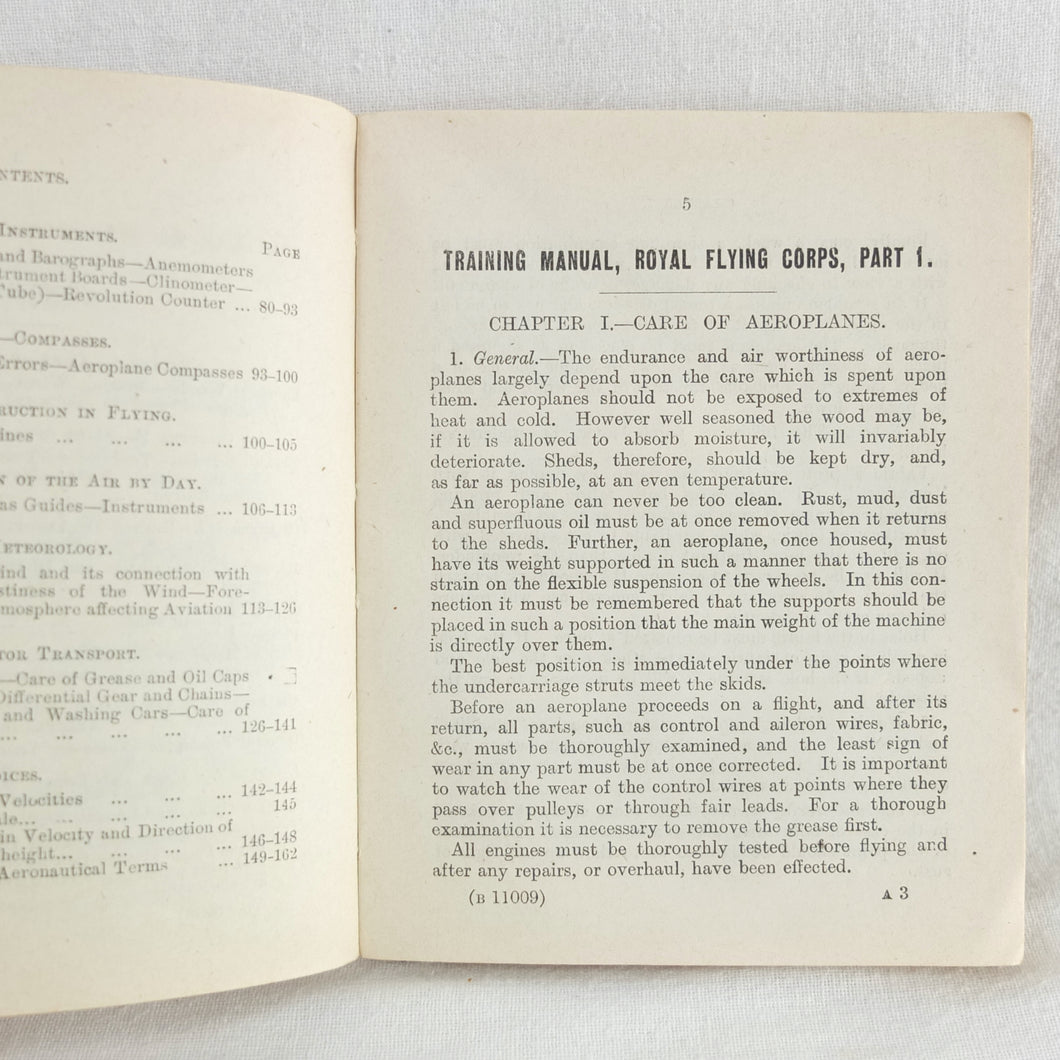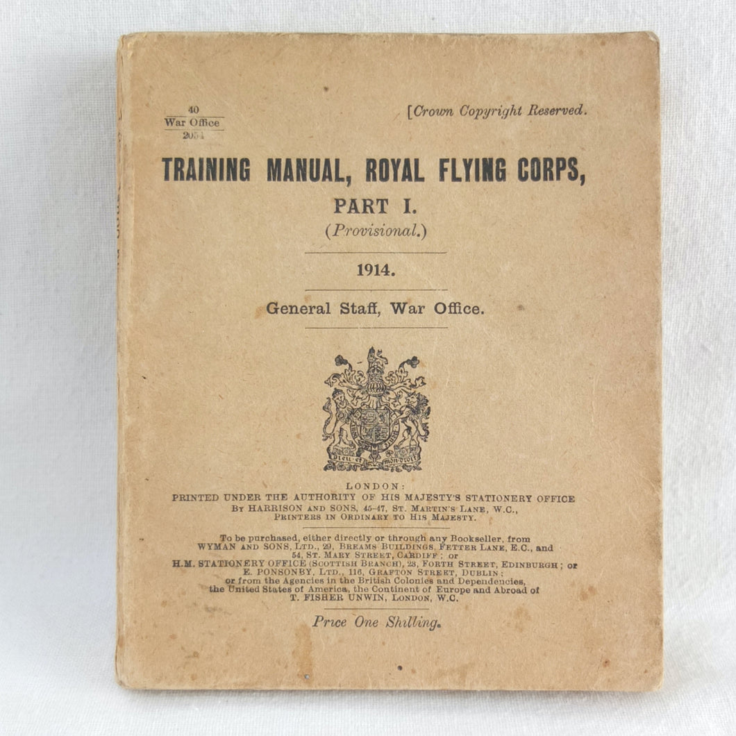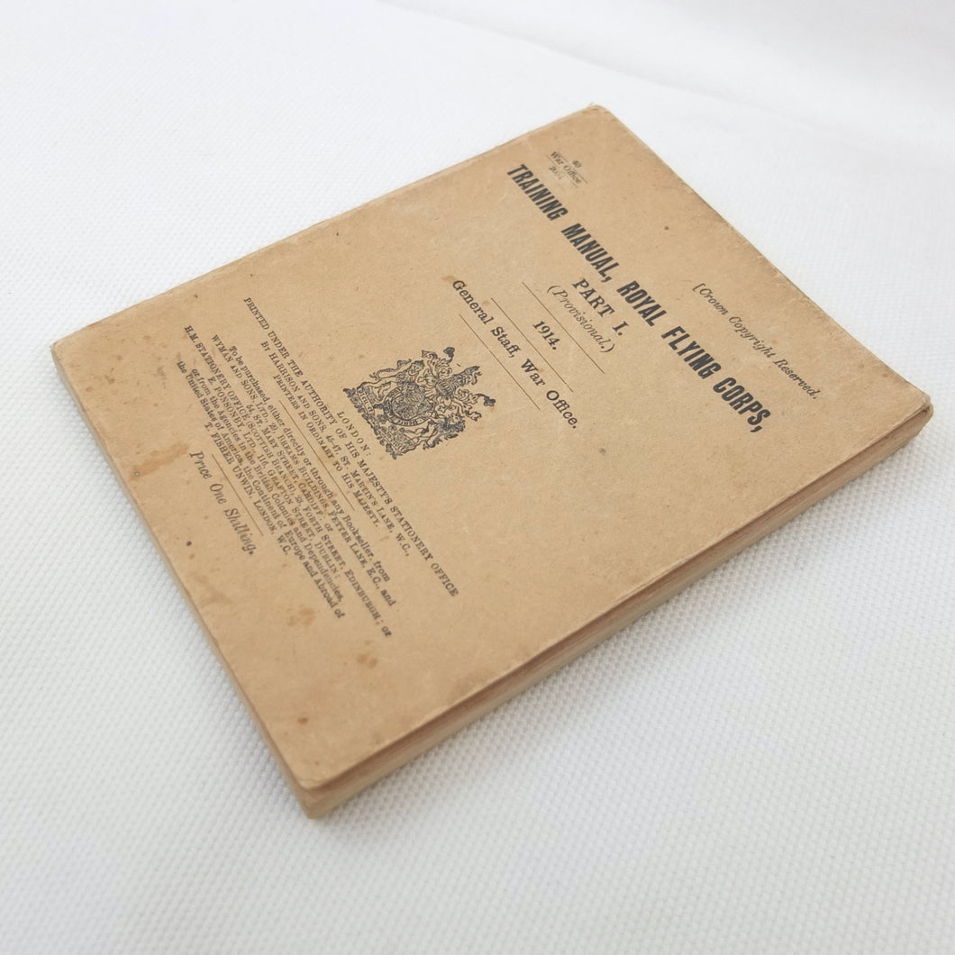 A rare original WW1 Royal Flying Corps manual, produced by the General Staff, War Office, and published in 1914 (this edition was printed in October 1914). It was intended to be used by pilots, observers, riggers, airmen, mechanics and fitters of the recently established Royal Flying Corps. The book includes details of flying instruction, the care and maintenance of aeroplanes, engines, instruments, etc. Subjects covered include: care of aeroplanes, fabric, wood, wires, engines, propellors, engine sheds, workshops, aeroplane repairs, assembling and trueing up, rigging, brief notes on various types of aircraft,  care and repair of engines, aircraft instruments, compasses, flying instruction, aerial navigation, meteorology, motor transport, etc. The manual is illustrated with line drawings and diagrams.