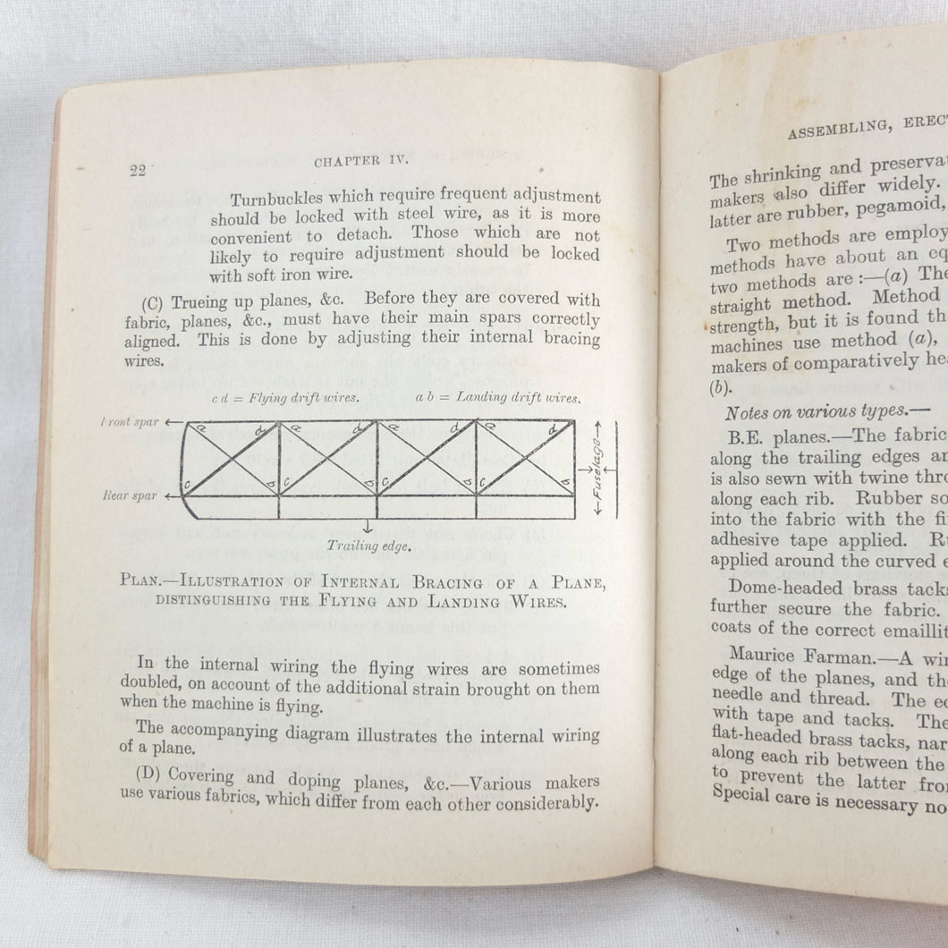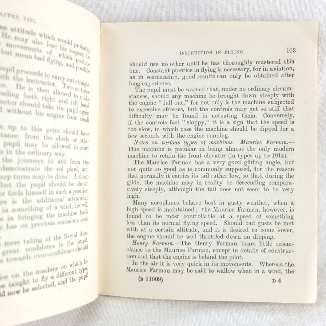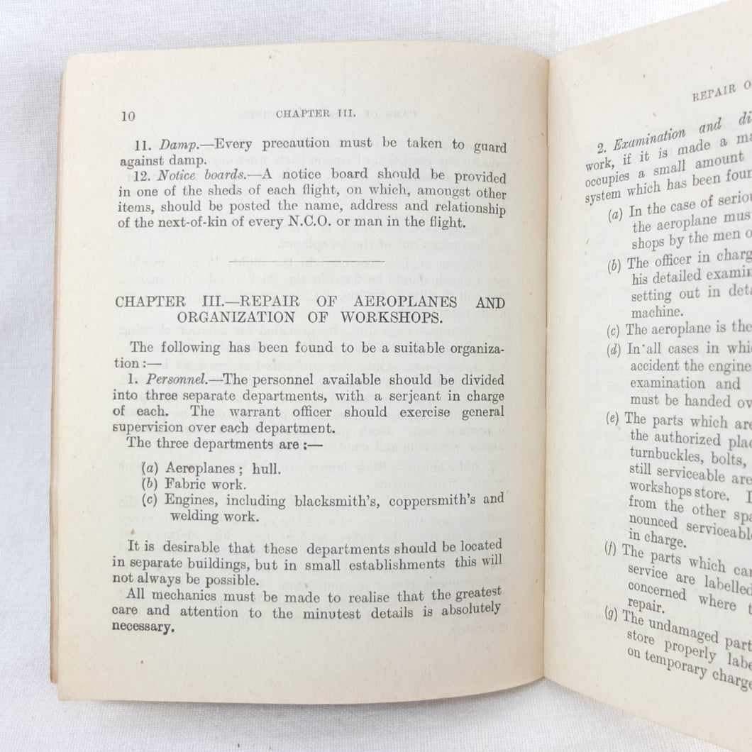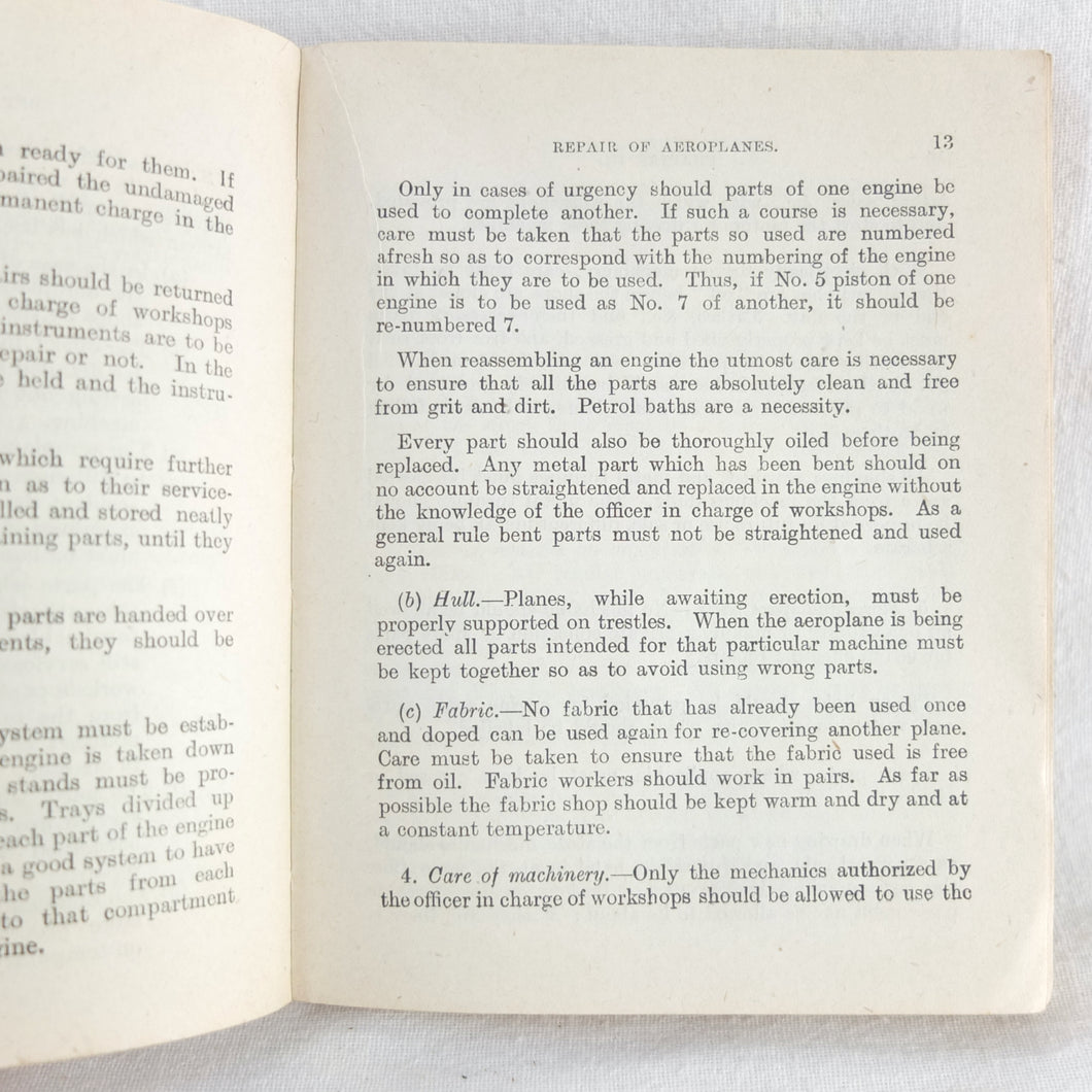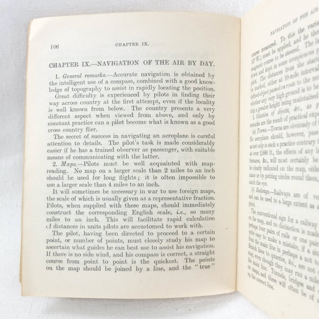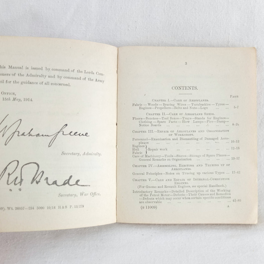 A rare original WW1 Royal Flying Corps manual, produced by the General Staff, War Office, and published in 1914 (this edition was printed in October 1914). It was intended to be used by pilots, observers, riggers, airmen, mechanics and fitters of the recently established Royal Flying Corps. The book includes details of flying instruction, the care and maintenance of aeroplanes, engines, instruments, etc. Subjects covered include: care of aeroplanes, fabric, wood, wires, engines, propellors, engine sheds, workshops, aeroplane repairs, assembling and trueing up, rigging, brief notes on various types of aircraft,  care and repair of engines, aircraft instruments, compasses, flying instruction, aerial navigation, meteorology, motor transport, etc. The manual is illustrated with line drawings and diagrams.