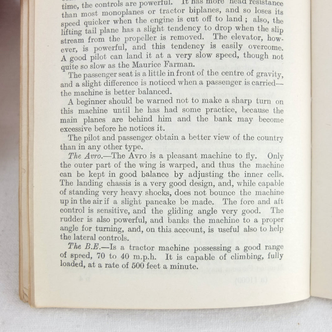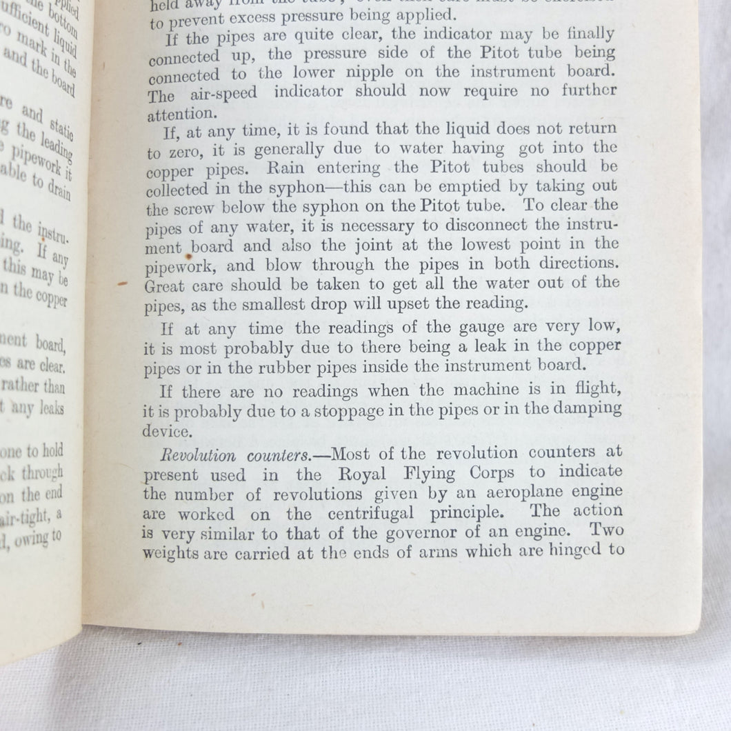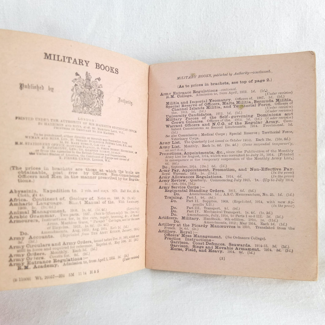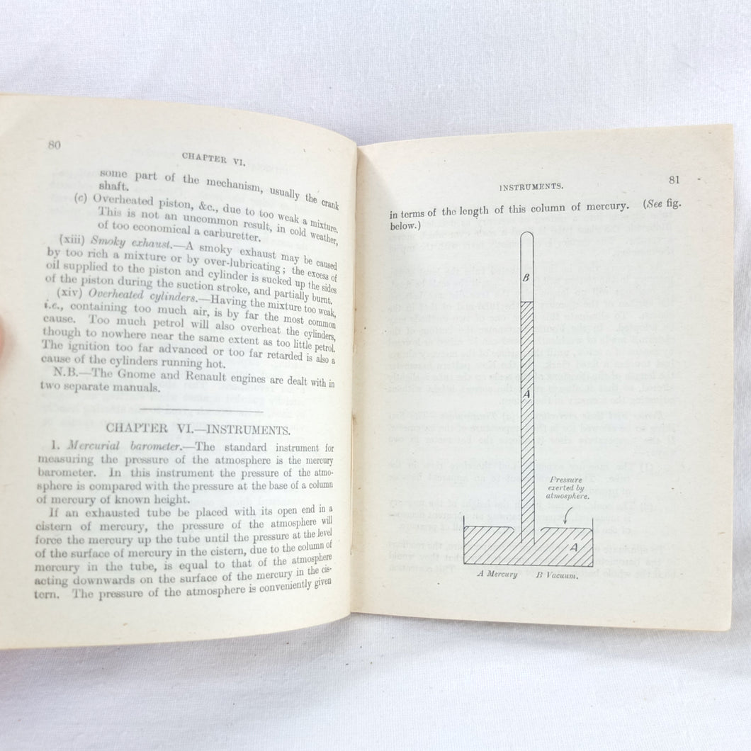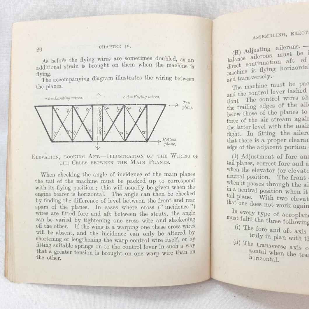 A rare original WW1 Royal Flying Corps manual, produced by the General Staff, War Office, and published in 1914 (this edition was printed in October 1914). It was intended to be used by pilots, observers, riggers, airmen, mechanics and fitters of the recently established Royal Flying Corps. The book includes details of flying instruction, the care and maintenance of aeroplanes, engines, instruments, etc. Subjects covered include: care of aeroplanes, fabric, wood, wires, engines, propellors, engine sheds, workshops, aeroplane repairs, assembling and trueing up, rigging, brief notes on various types of aircraft,  care and repair of engines, aircraft instruments, compasses, flying instruction, aerial navigation, meteorology, motor transport, etc. The manual is illustrated with line drawings and diagrams.