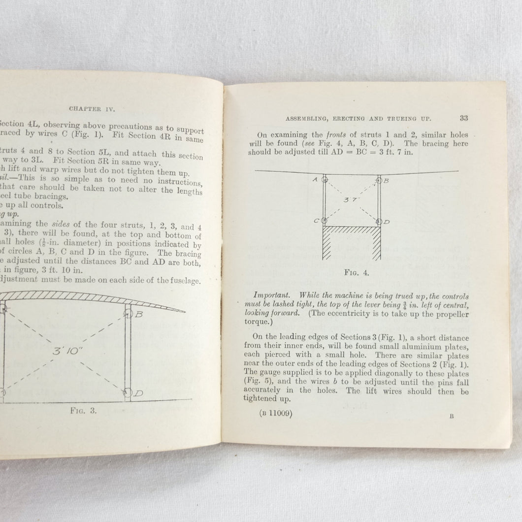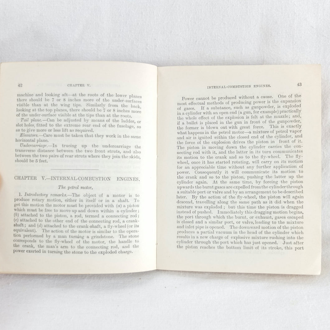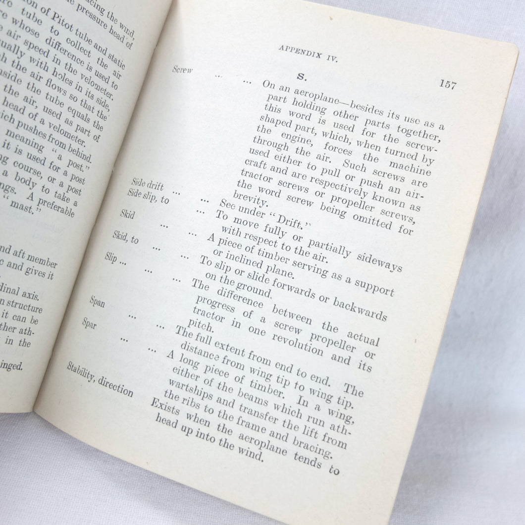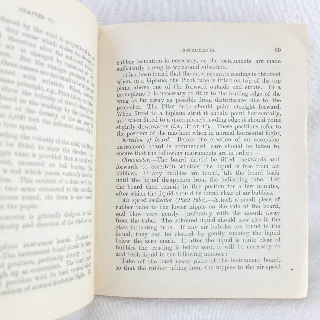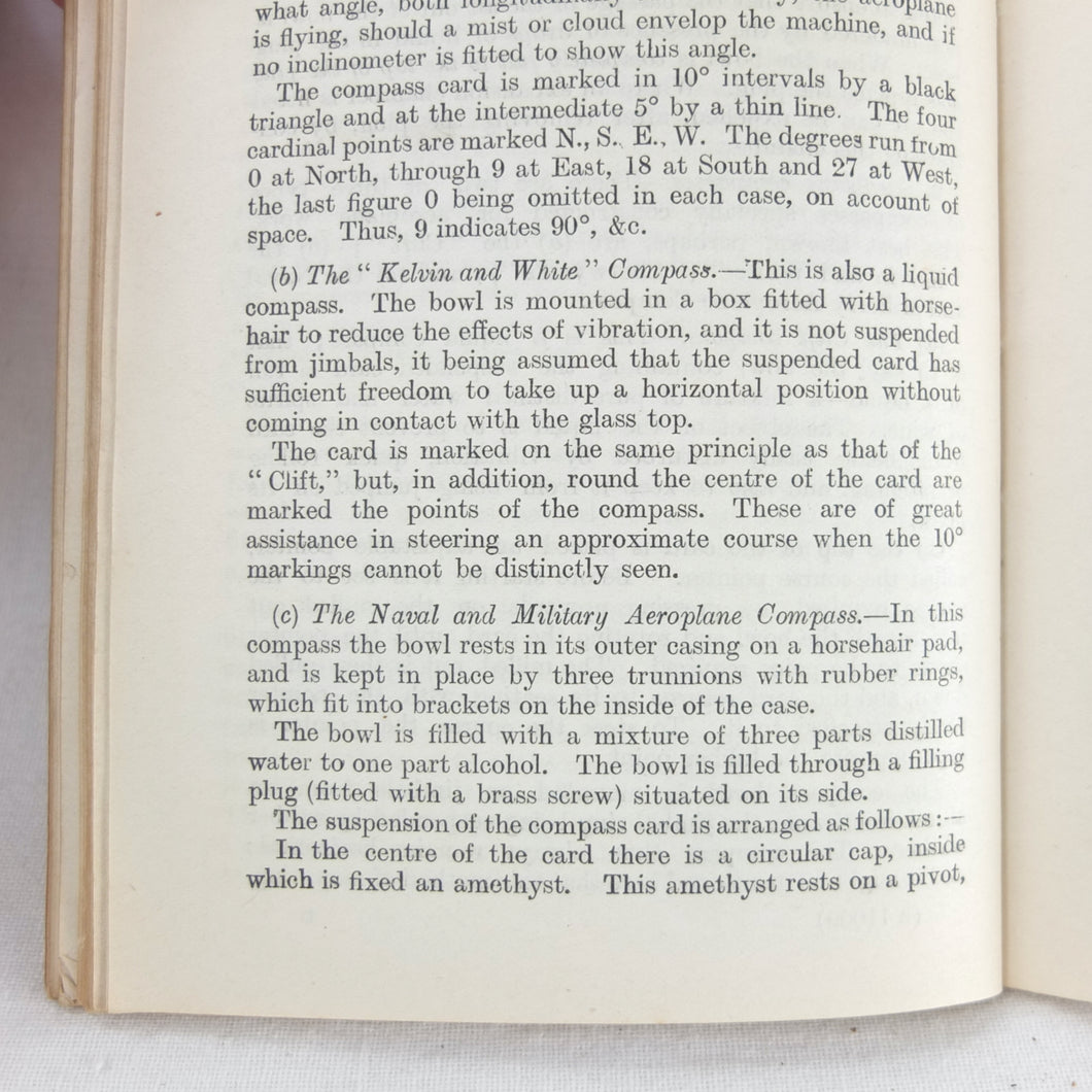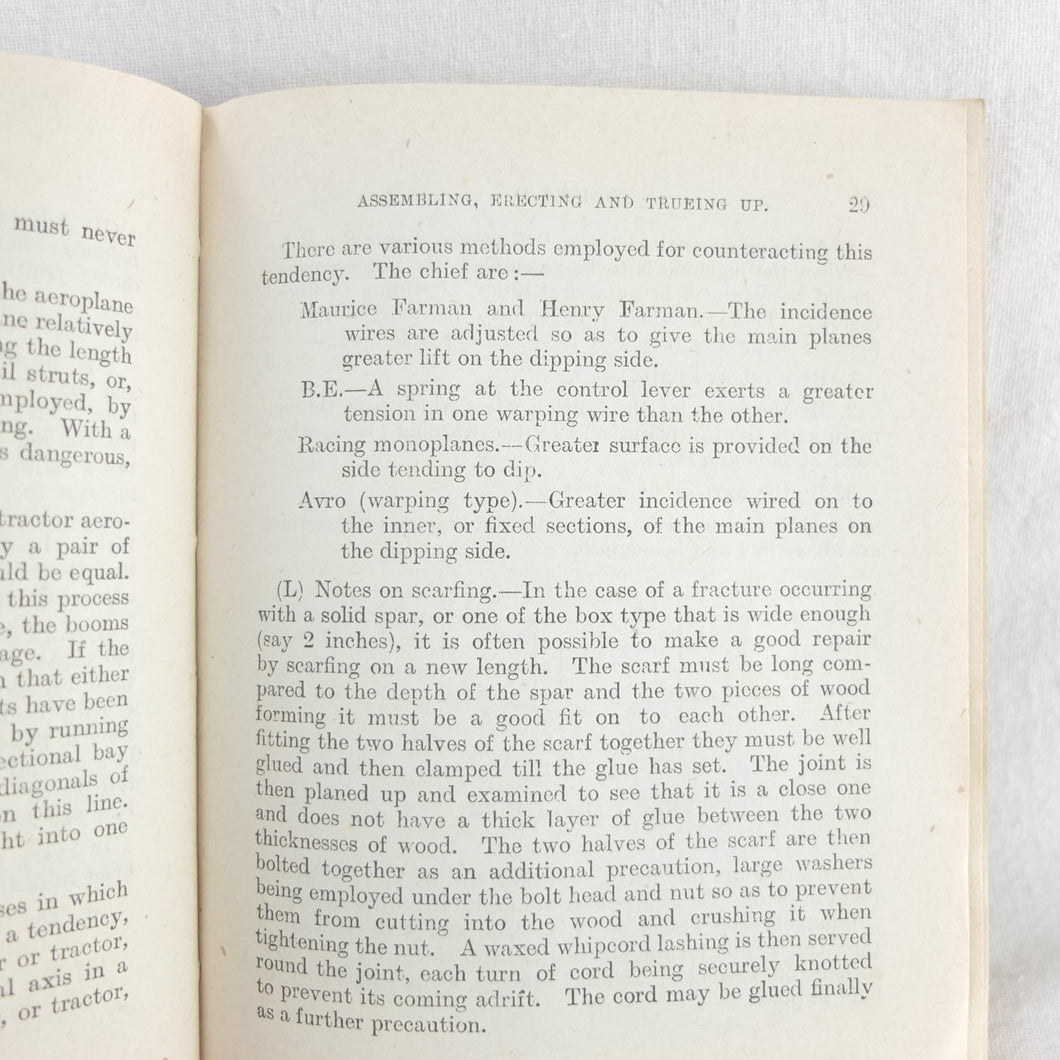 A rare original WW1 Royal Flying Corps manual, produced by the General Staff, War Office, and published in 1914 (this edition was printed in October 1914). It was intended to be used by pilots, observers, riggers, airmen, mechanics and fitters of the recently established Royal Flying Corps. The book includes details of flying instruction, the care and maintenance of aeroplanes, engines, instruments, etc. Subjects covered include: care of aeroplanes, fabric, wood, wires, engines, propellors, engine sheds, workshops, aeroplane repairs, assembling and trueing up, rigging, brief notes on various types of aircraft,  care and repair of engines, aircraft instruments, compasses, flying instruction, aerial navigation, meteorology, motor transport, etc. The manual is illustrated with line drawings and diagrams.