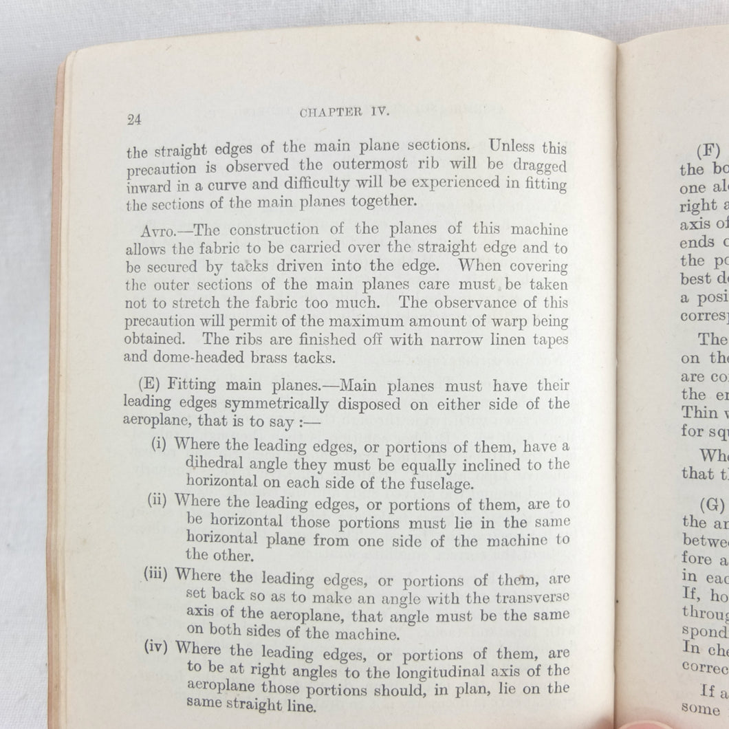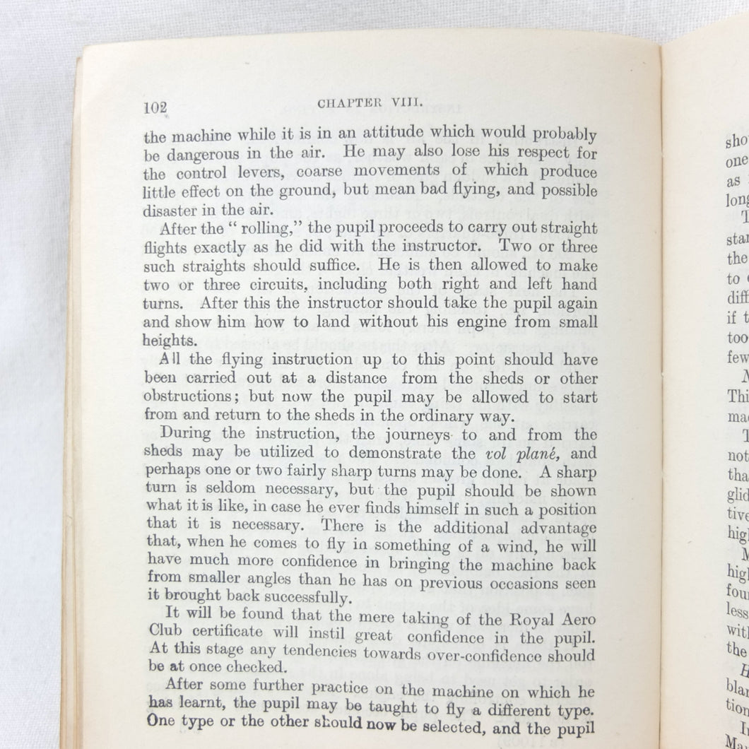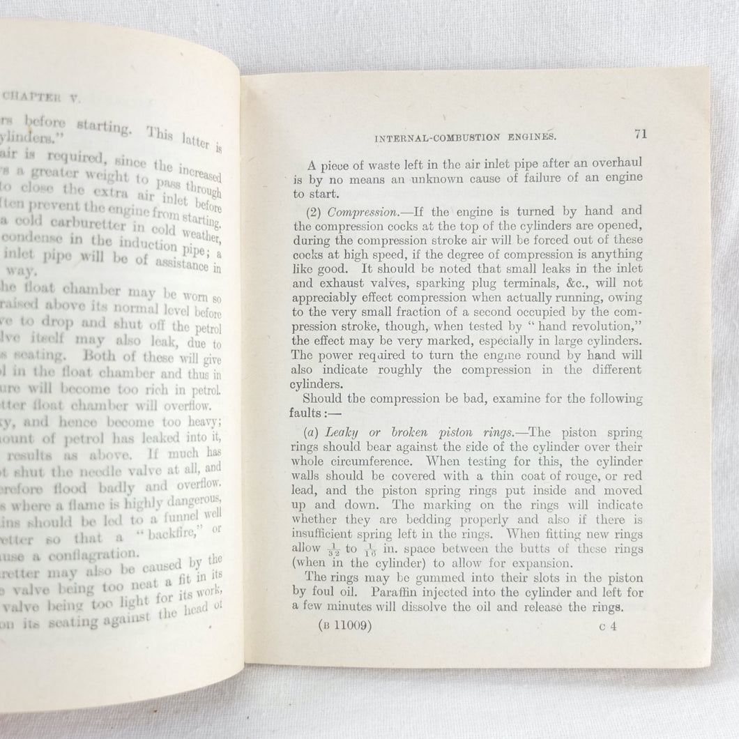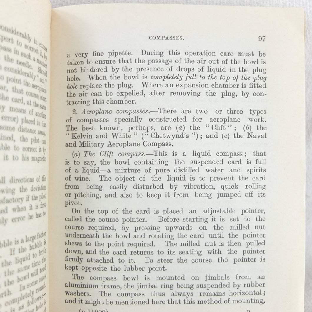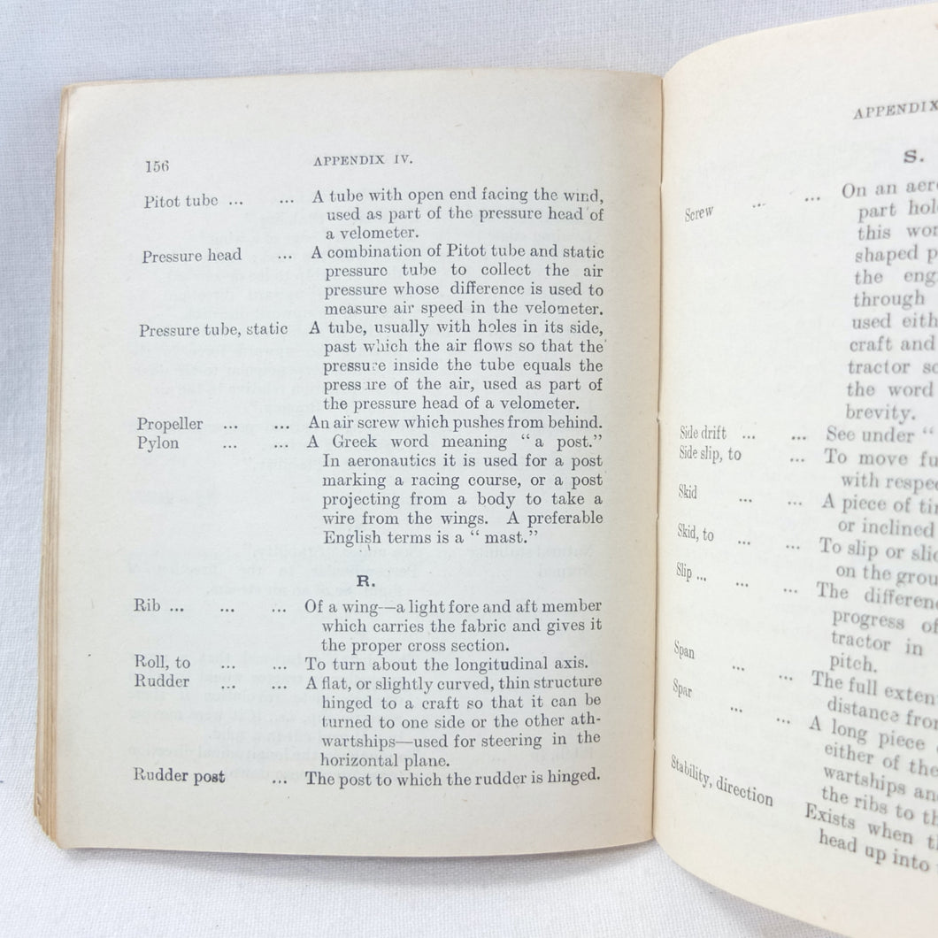 A rare original WW1 Royal Flying Corps manual, produced by the General Staff, War Office, and published in 1914 (this edition was printed in October 1914). It was intended to be used by pilots, observers, riggers, airmen, mechanics and fitters of the recently established Royal Flying Corps. The book includes details of flying instruction, the care and maintenance of aeroplanes, engines, instruments, etc. Subjects covered include: care of aeroplanes, fabric, wood, wires, engines, propellors, engine sheds, workshops, aeroplane repairs, assembling and trueing up, rigging, brief notes on various types of aircraft,  care and repair of engines, aircraft instruments, compasses, flying instruction, aerial navigation, meteorology, motor transport, etc. The manual is illustrated with line drawings and diagrams.