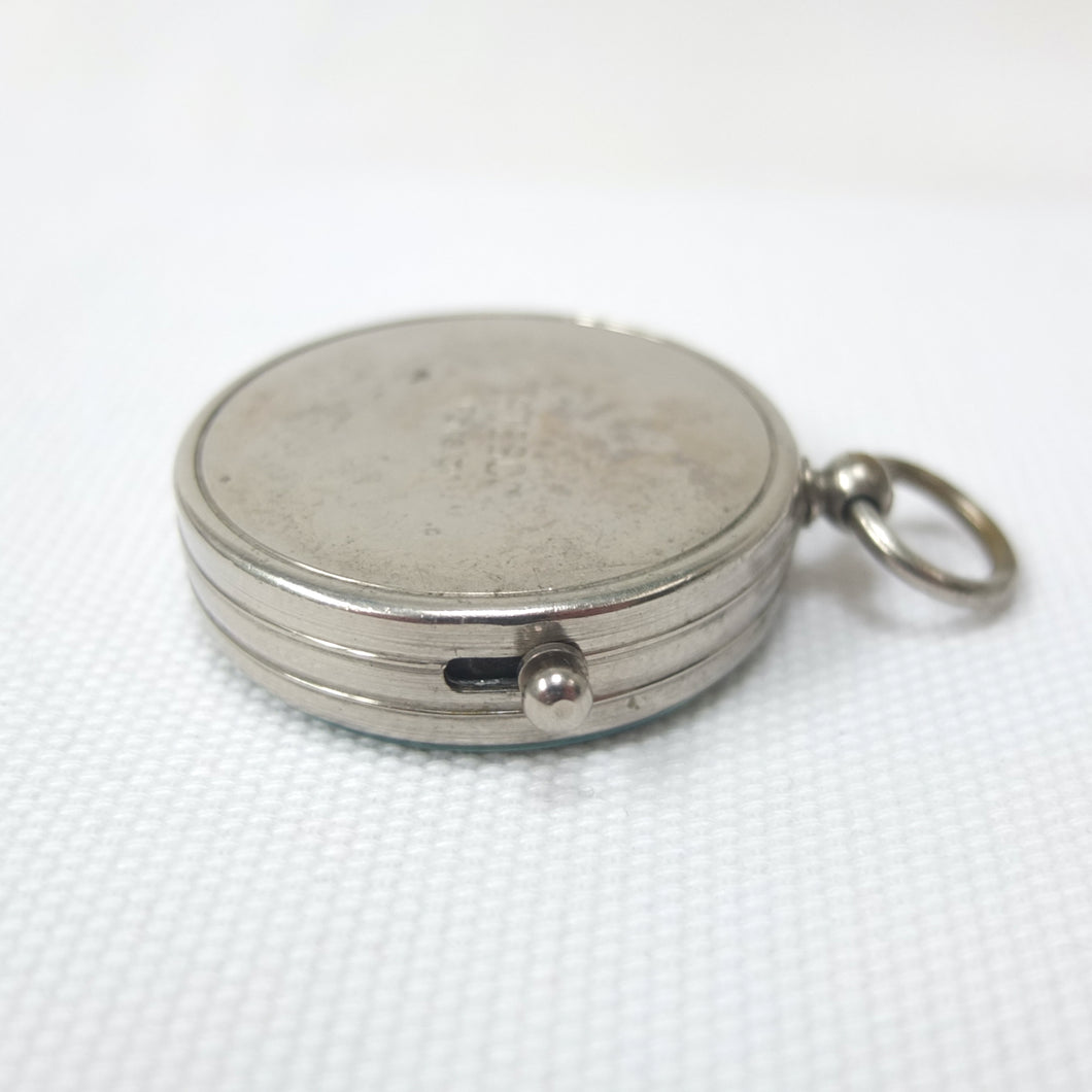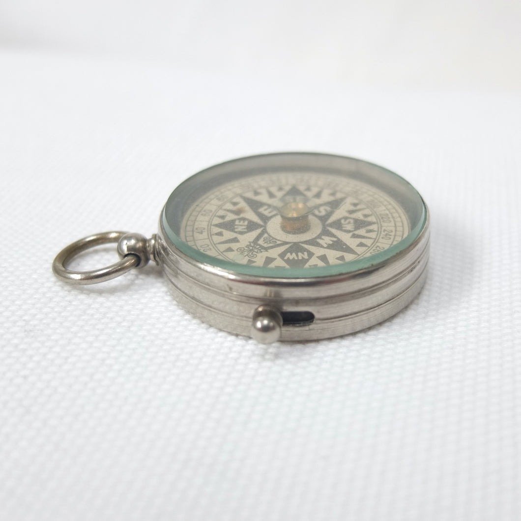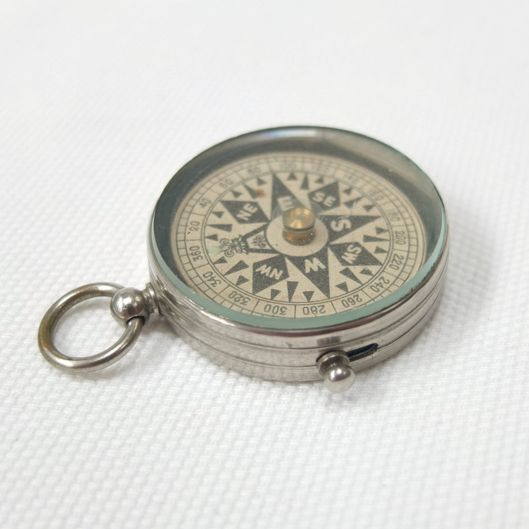 A vintage Stesco pocket compass, difficult to date, but probably from c.1950-1960, marked 'Foreign' on the base, suggesting that it was most likely to have been made in West Germany. In the years after the end of WW2, many items produced in Germany for export were marked 'Foreign' in order to make them more acceptable to the British market. The compass has a paper compass card which is similar in style to 19th century Francis Barker designs. With a bevelled glass, nickel plated brass case, and a transit lock operated by a sliding button on the side of the case.