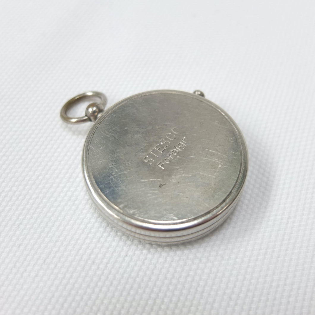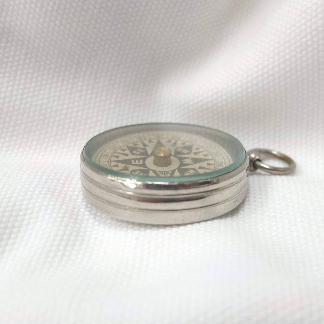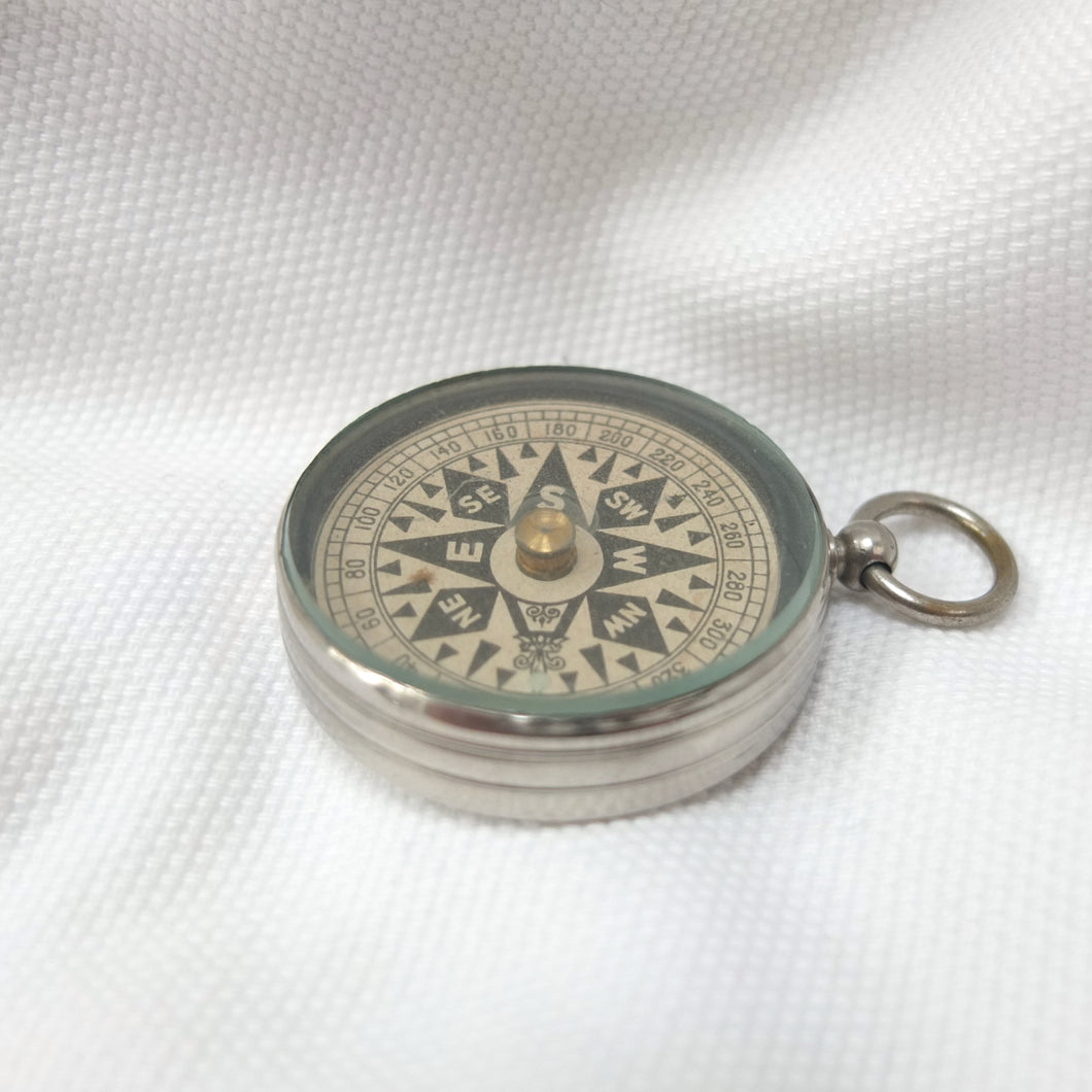 A vintage Stesco pocket compass, difficult to date, but probably from c.1950-1960, marked 'Foreign' on the base, suggesting that it was most likely to have been made in West Germany. In the years after the end of WW2, many items produced in Germany for export were marked 'Foreign' in order to make them more acceptable to the British market. The compass has a paper compass card which is similar in style to 19th century Francis Barker designs. With a bevelled glass, nickel plated brass case, and a transit lock operated by a sliding button on the side of the case.